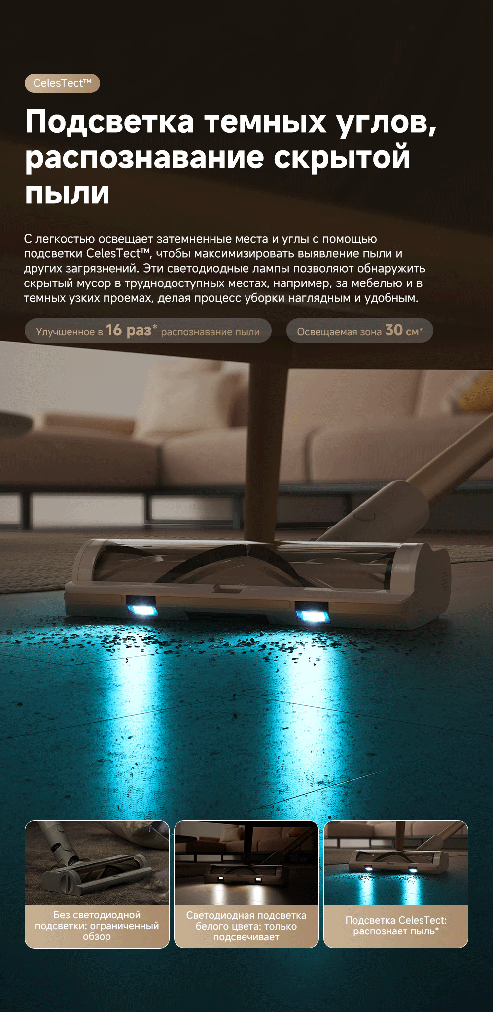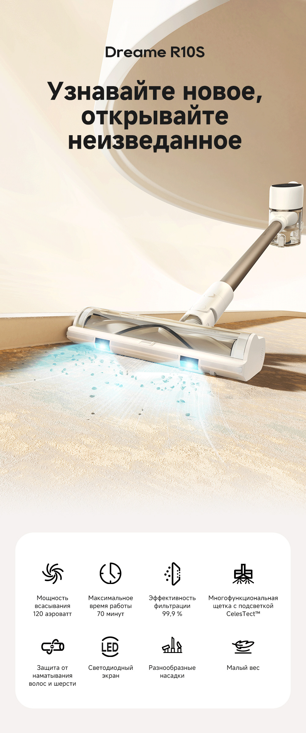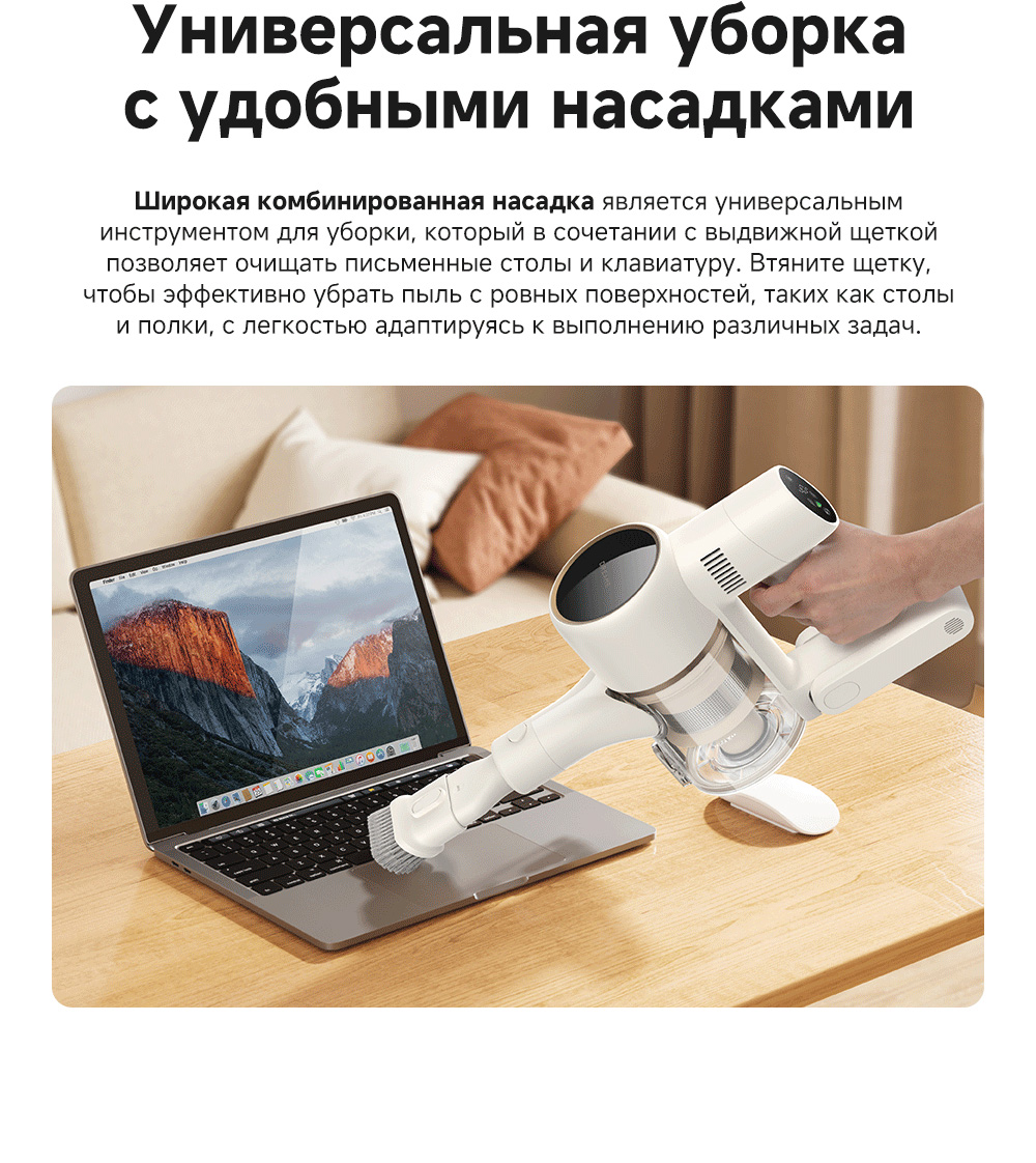 Технология CelesTect улучшает обнаружение пыли. Мощность всасывания 120 аВт обеспечивает качественную уборку различных покрытий. Лёгкий вес и разнообразные насадки делают пылесос универсальным для любых поверхностей.