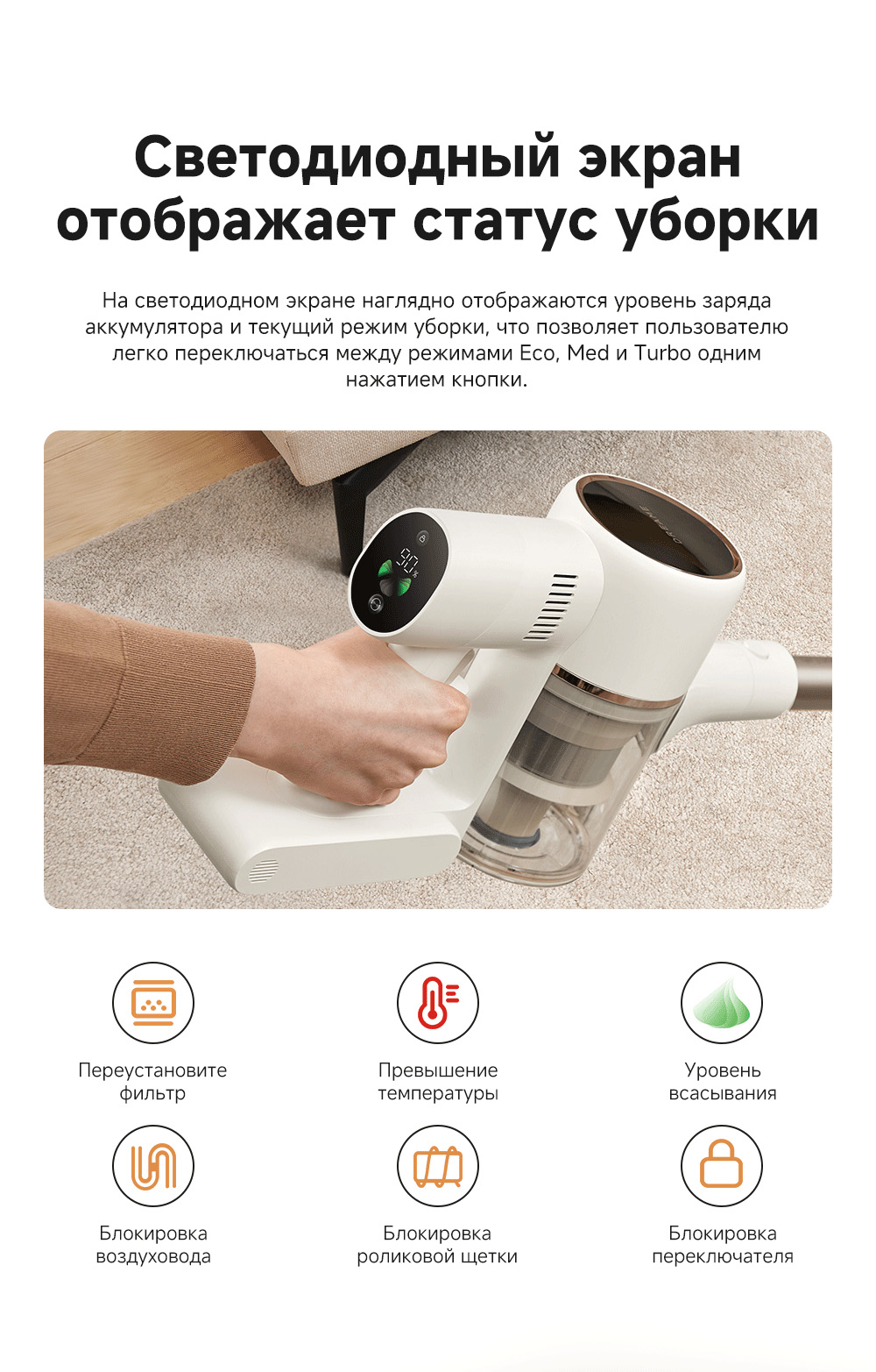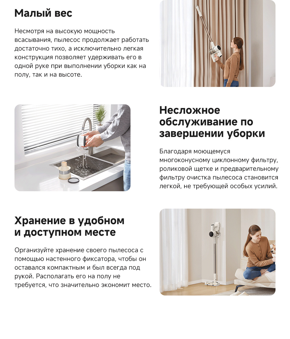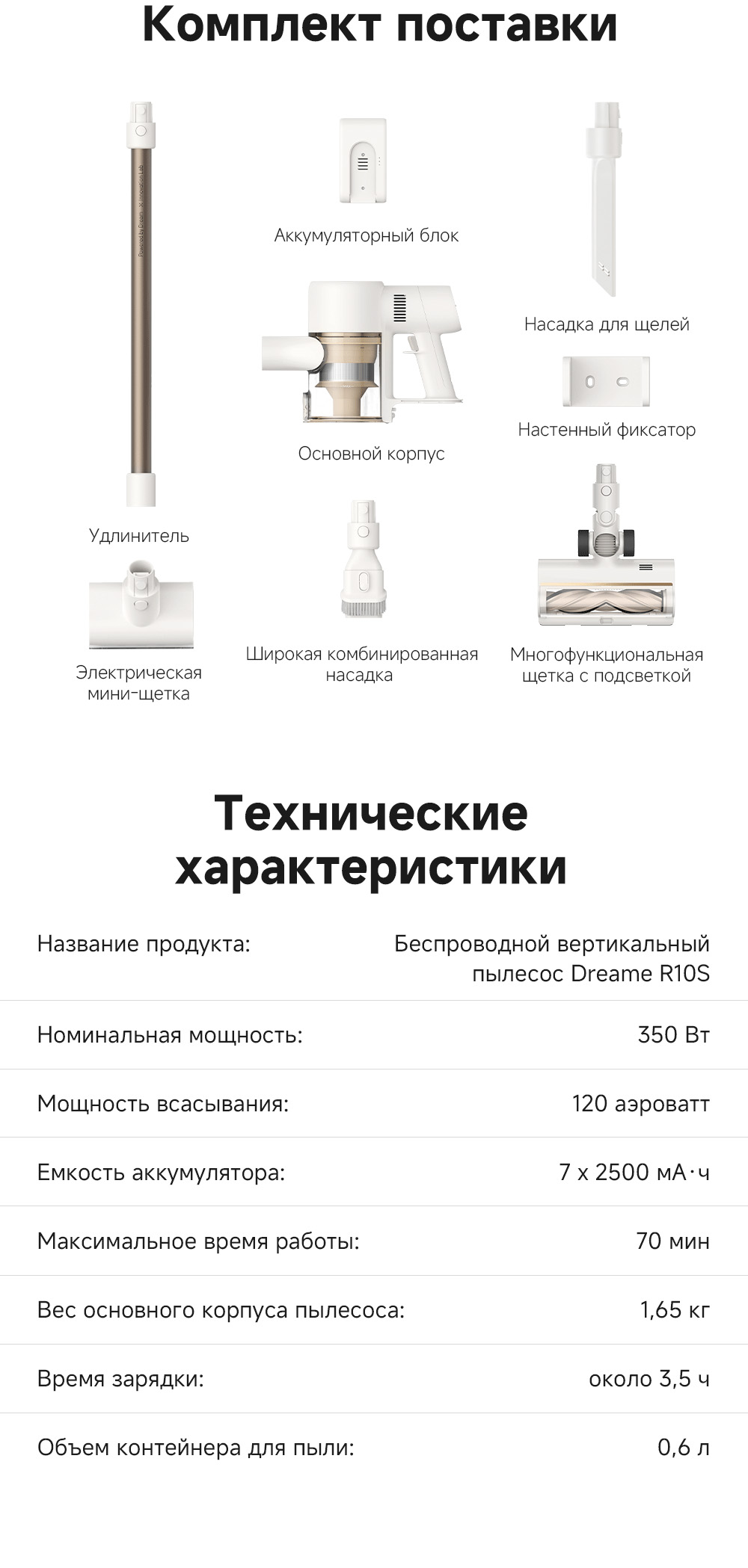 АртикулVZV22AТипБеспроводной пылесосМощность, Вт350УправлениеКнопочноеЁмкость аккумулятора2500 мАчРекомендованные товарыЦветбелыйОсобенностиТехнология CelesTect улучшает обнаружение пыли. Мощность всасывания 120 аВт обеспечивает качественную уборку различных покрытий. Лёгкий вес и разнообразные насадки делают пылесос универсальным для любых поверхностей.СерияR - серияТип уборкиСухаяВремя автономной работы70 минутМаксимальная мощность всасывания, кПа20Количество режимов уборки3Поддержка Wi-FiНетРежимы работыОбычныйСистема фильтрацииHEPA-фильтрУборка ковровЕстьУборка шерсти животныхЕстьОбъем пылесборника, мл600Минимальный уровень шума, дБ68Тип щёткиМногофункциональная щетка с подсветкой / Широкая комбинированная насадка / Щелевая насадка / Электрическая мини-щеткаРабочая частота100-240 В / 50-60 ГцВремя зарядки210 минутДатчик пылиЛазерная подсветкаКомплектацияОсновной корпус, многофункциональная щётка с подсветкой, мини-турбощётка, широкая комбинированная насадка, щелевая насадка, удлинительная трубка, настенный фиксатор, руководство по эксплуатации.Количество насадок4ДвигательБесщеточныйДисплейLED-дисплейНасадки в комплектеЕстьМодельR10SМинимальная цена со скидкой699Краткое наименованиеR10SВес1.6ИзготовительDreame Trading (Tianjin) Co. Ltd., Китай, Room 2112-1-1, South District, Finance and Trade Center, No.6975 Yazhou Road, Dongjiang Bonded Port Area, Tianjin Pilot Free Trade Zone, TianjinИмпортерООО "АйТи Дистрибуция", 223053, Республика Беларусь, Минская область, Минский район, Боровлянский с/с, 103/3-7, помещение №7-50Гарантийный срок12 месяцев