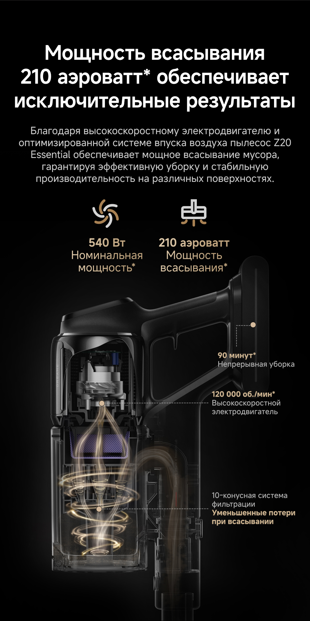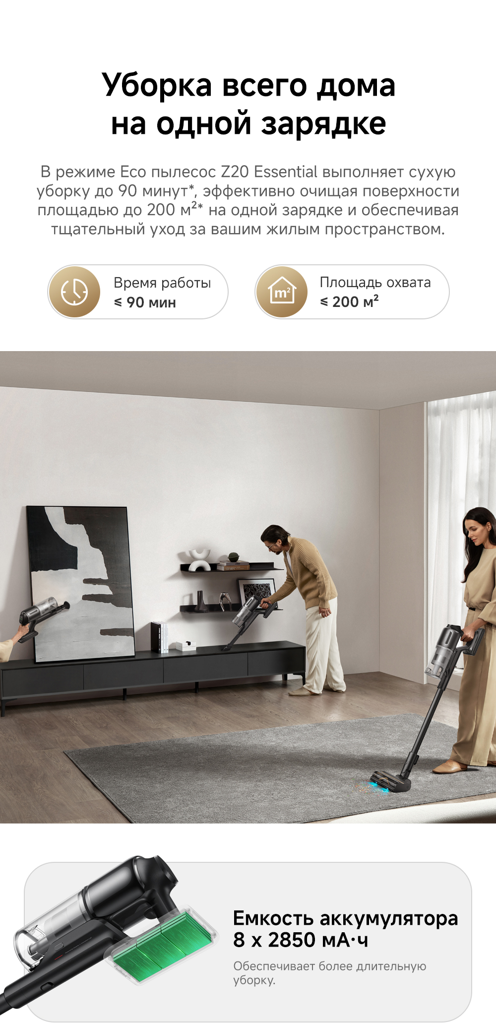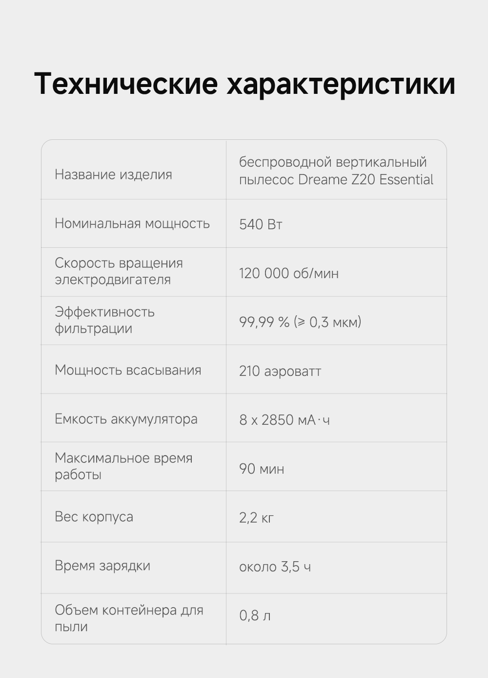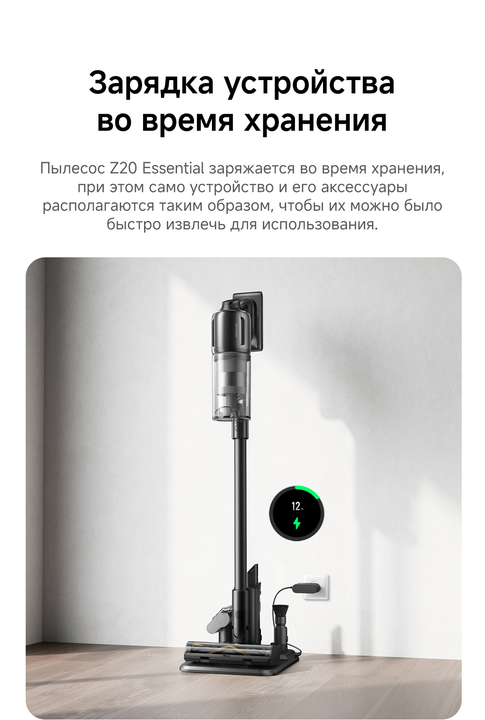 АртикулVZV24AТипБеспроводной пылесосМощность, Вт540УправлениеКнопочноеЁмкость аккумулятора2850 мАчРекомендованные товарыЦветчерныйОсобенностиДве сменные основные щётки с технологией Clean-to-Edge и подсветкой CelesTect позволяют убрать вплотную к плинтусу и обнаружить скрытую пыль. Дополнительные насадки делают пылесос универсальным для уборки любых поверхностей. Большой контейнер для пыли, объёмом 0.8 литра. Удобная напольная док-станция для зарядки и хранения.СерияZ - серияТип уборкиСухаяВремя автономной работы90 минутКоличество режимов уборки3Режимы работыАвтоматический / Турбо / ЭкоСистема фильтрацииHEPA-фильтрУборка ковровЕстьУборка шерсти животныхЕстьОбъем пылесборника, мл800Тип щёткиВращающаяся мягкая щетка для пыли / Многофункциональная щетка с технологией CelesTectTM / Мягкая роликовая щетка с технологией CelesTectTM / Электрическая мини-щеткаВремя автономной работы по режимамдо 90 минутВремя зарядки210 минутДатчик пылиЛазерная подсветкаКомплектацияОсновной корпус, напольная док-станция, удлинительный шланг, мягкая роликовая щётка с подсветкой, многофункциональная щётка с подсветкой, комбинированная насадка, электрическая мини-щётка, вращающаяся мягкая щётка для пыли.Количество насадок6ДвигательБесщеточныйДисплейLED-дисплейСкорость мотора, об/мин120000Насадки в комплектеЕстьМодельZ20 EssentialВлажный тип уборкиНетМинимальная цена со скидкой1399Краткое наименованиеZ20 EssentialВес2.2 кг без насадокИзготовительDreame Trading (Tianjin) Co. Ltd., Китай, Room 2112-1-1, South District, Finance and Trade Center, No.6975 Yazhou Road, Dongjiang Bonded Port Area, Tianjin Pilot Free Trade Zone, TianjinИмпортерООО "АйТи Дистрибуция", 223053, Республика Беларусь, Минская область, Минский район, Боровлянский с/с, 103/3-7, помещение №7-50Гарантийный срок12 месяцев
