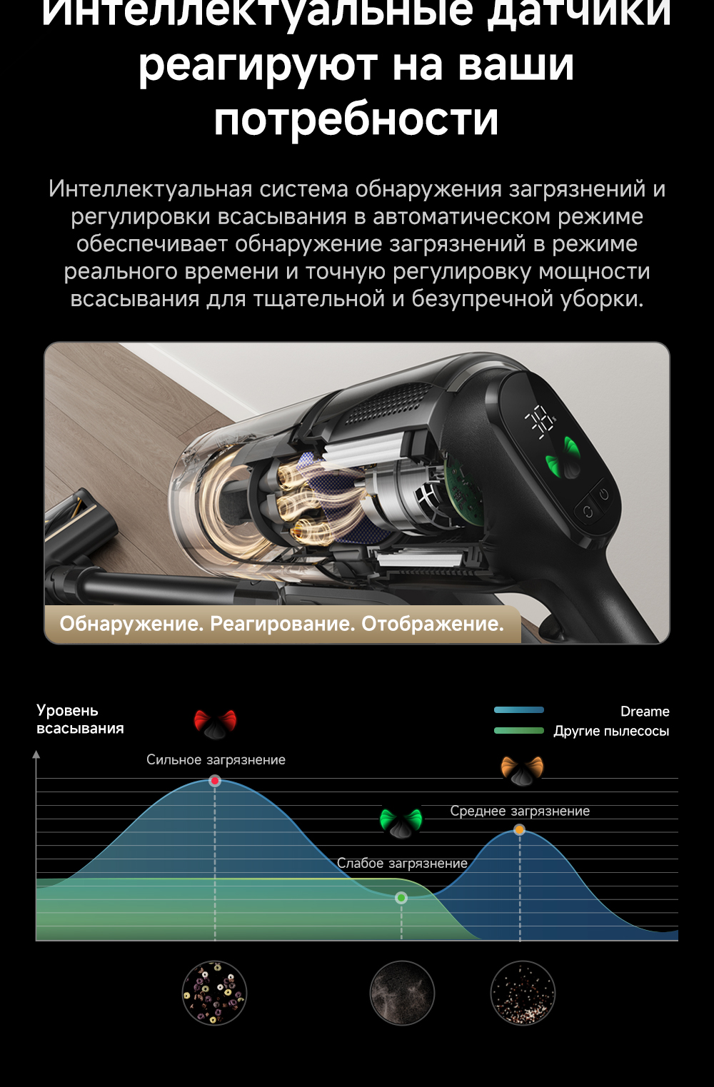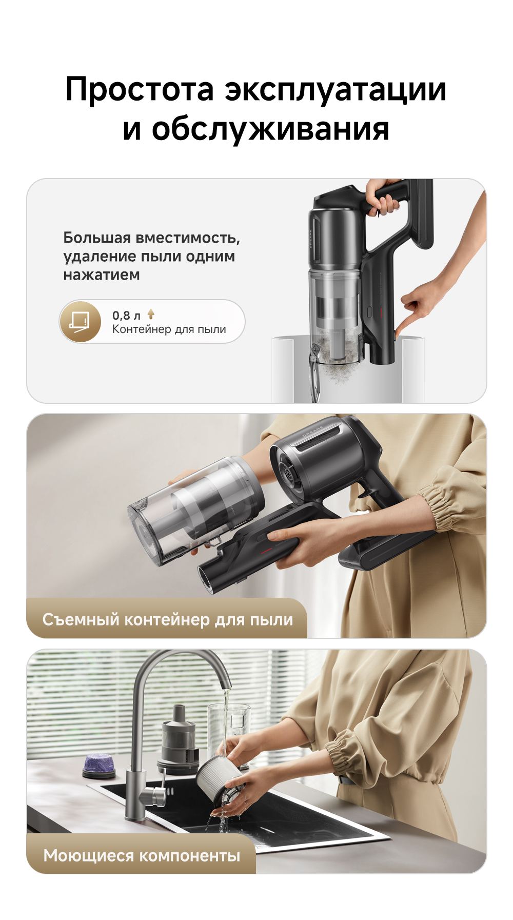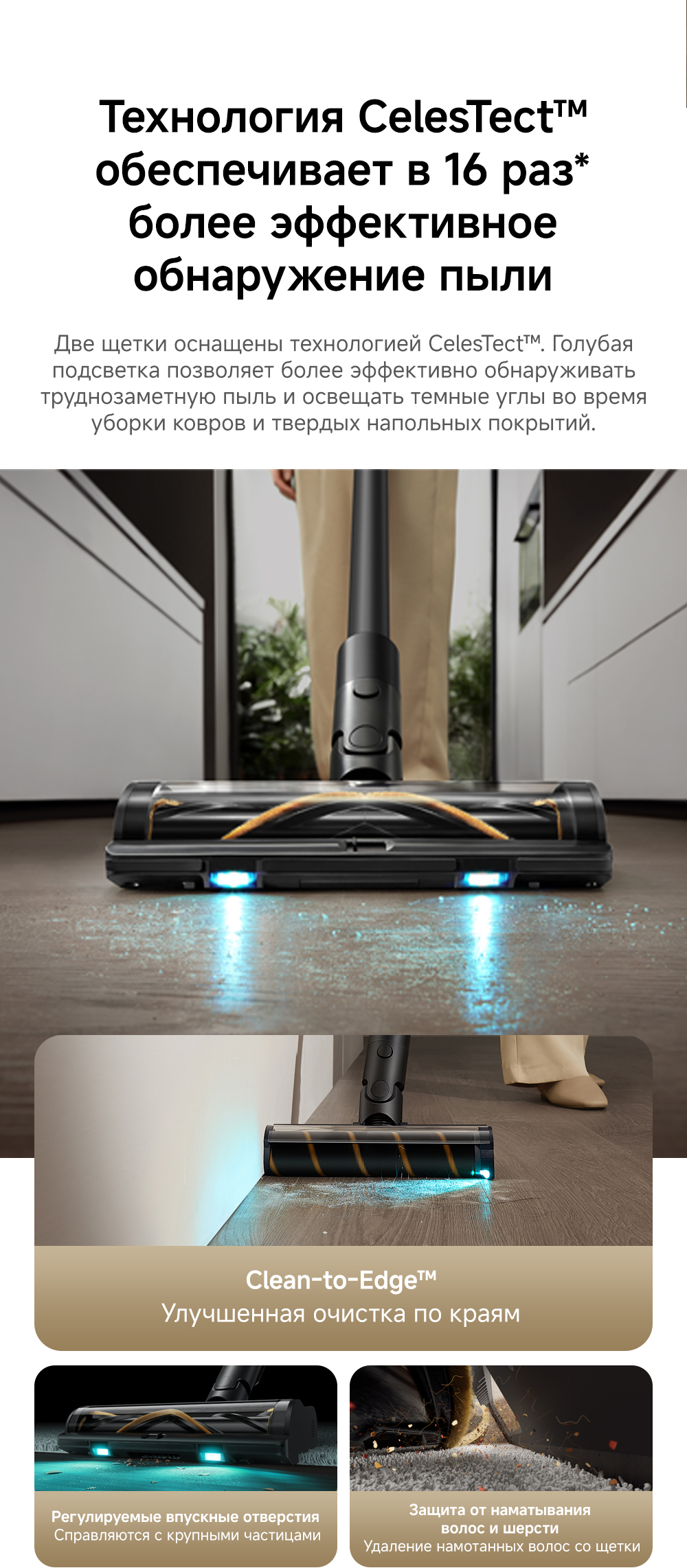 Две сменные основные щётки с технологией Clean-to-Edge и подсветкой CelesTect позволяют убрать вплотную к плинтусу и обнаружить скрытую пыль. Дополнительные насадки делают пылесос универсальным для уборки любых поверхностей. Большой контейнер для пыли, объёмом 0.8 литра. Удобная напольная док-станция для зарядки и хранения.