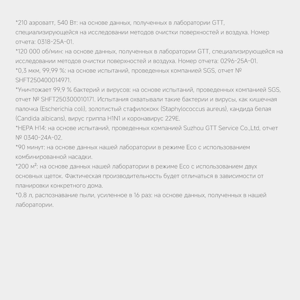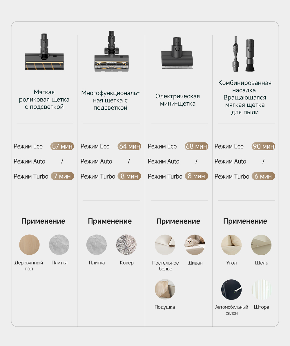 Основной корпус, напольная док-станция, удлинительный шланг, мягкая роликовая щётка с подсветкой, многофункциональная щётка с подсветкой, комбинированная насадка, электрическая мини-щётка, вращающаяся мягкая щётка для пыли.