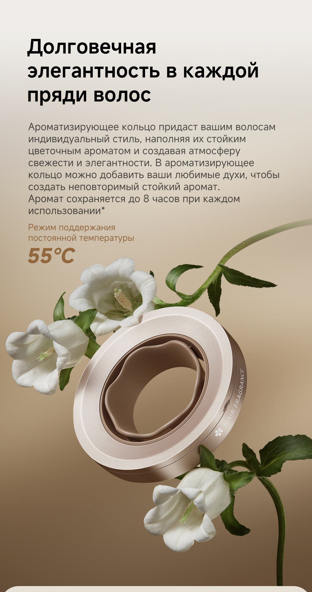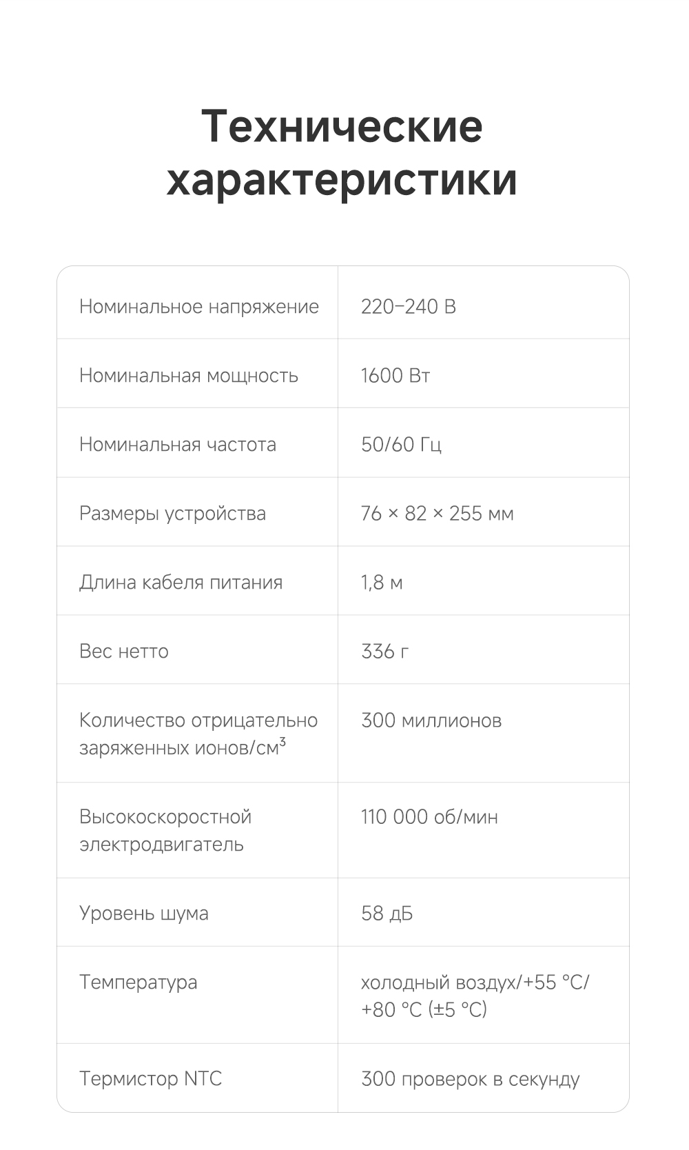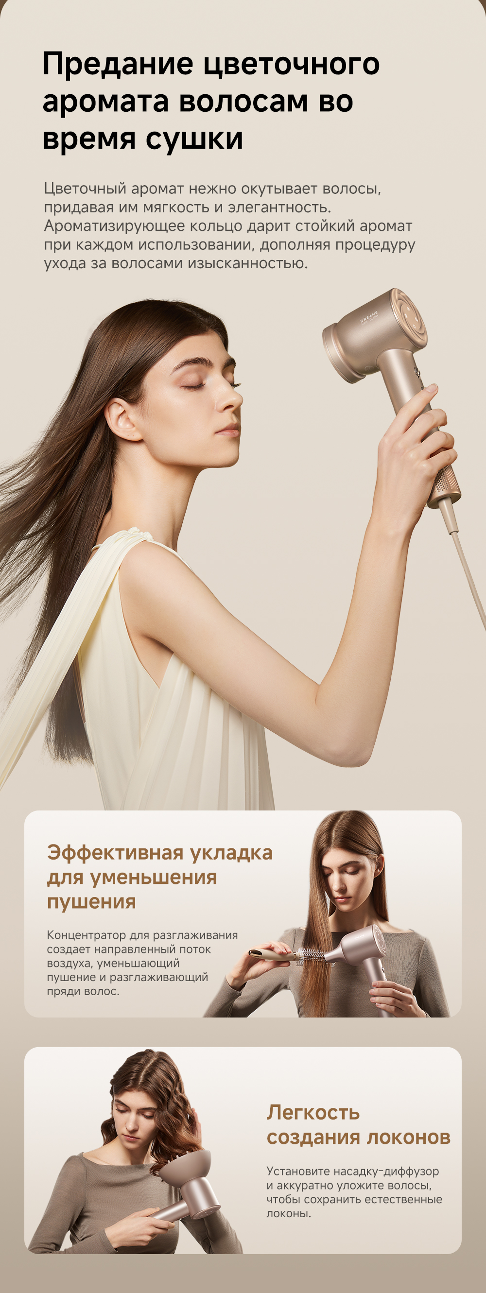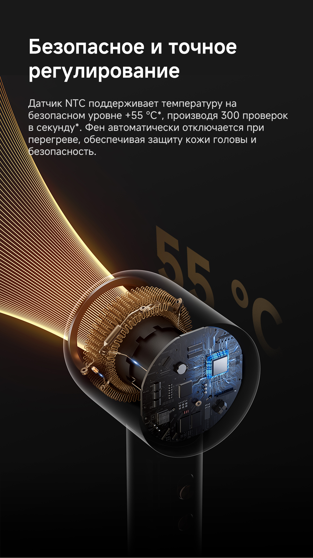 Датчик NTC контролирует и регулирует нагрев, выполняя 300 проверок в секунду, насадка-ароматизатор мягко рассеивает поток насыщенного парфюмом воздуха, питая волосы, оставляя их гладкими и наполненными ароматом парфюма, высокая концентрация отрицательно заряженных ионов мгновенно нейтрализует статический заряд, разглаживая волосы.