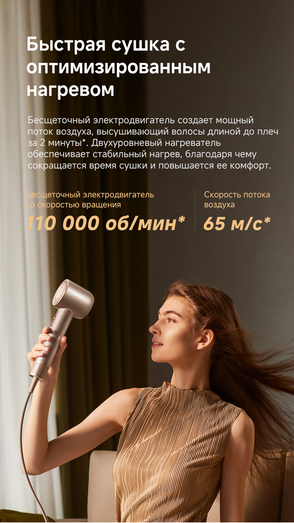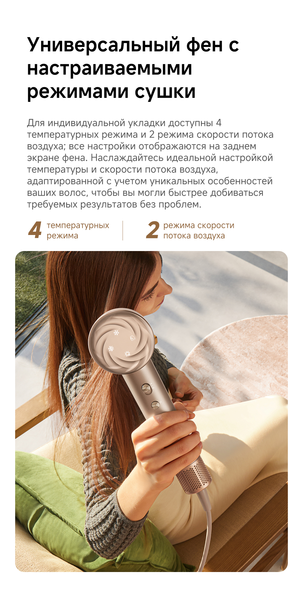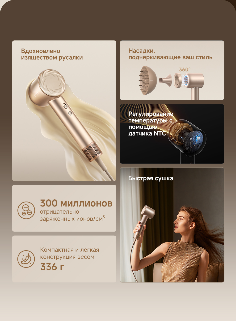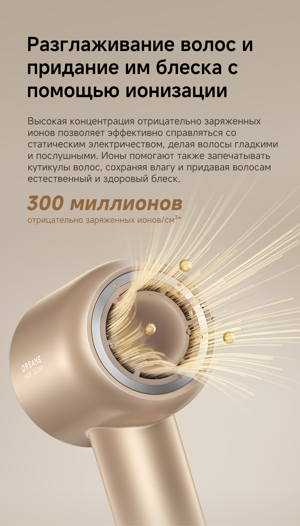 Датчик NTC контролирует и регулирует нагрев, выполняя 300 проверок в секунду, насадка-ароматизатор мягко рассеивает поток насыщенного парфюмом воздуха, питая волосы, оставляя их гладкими и наполненными ароматом парфюма, высокая концентрация отрицательно заряженных ионов мгновенно нейтрализует статический заряд, разглаживая волосы.