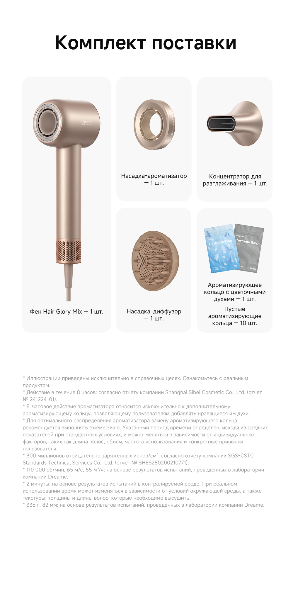 Фен, насадка-концентратор, насадка-диффузор, насадка-ароматизатор, ароматизирующее кольцо с парфюмом - 1 шт., ароматизирующее кольцо пустое - 10 шт.