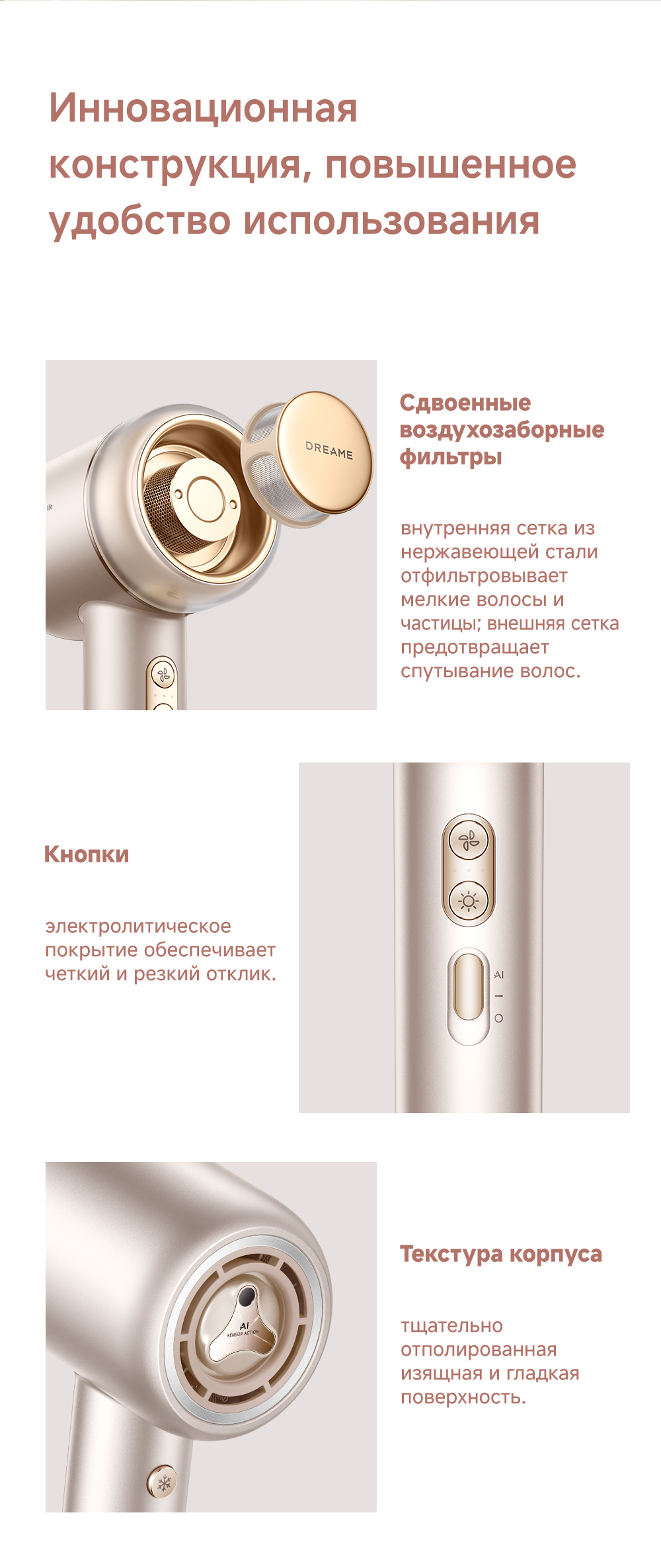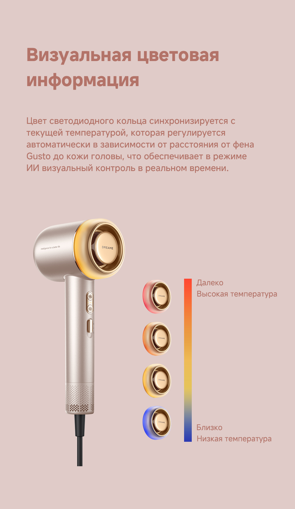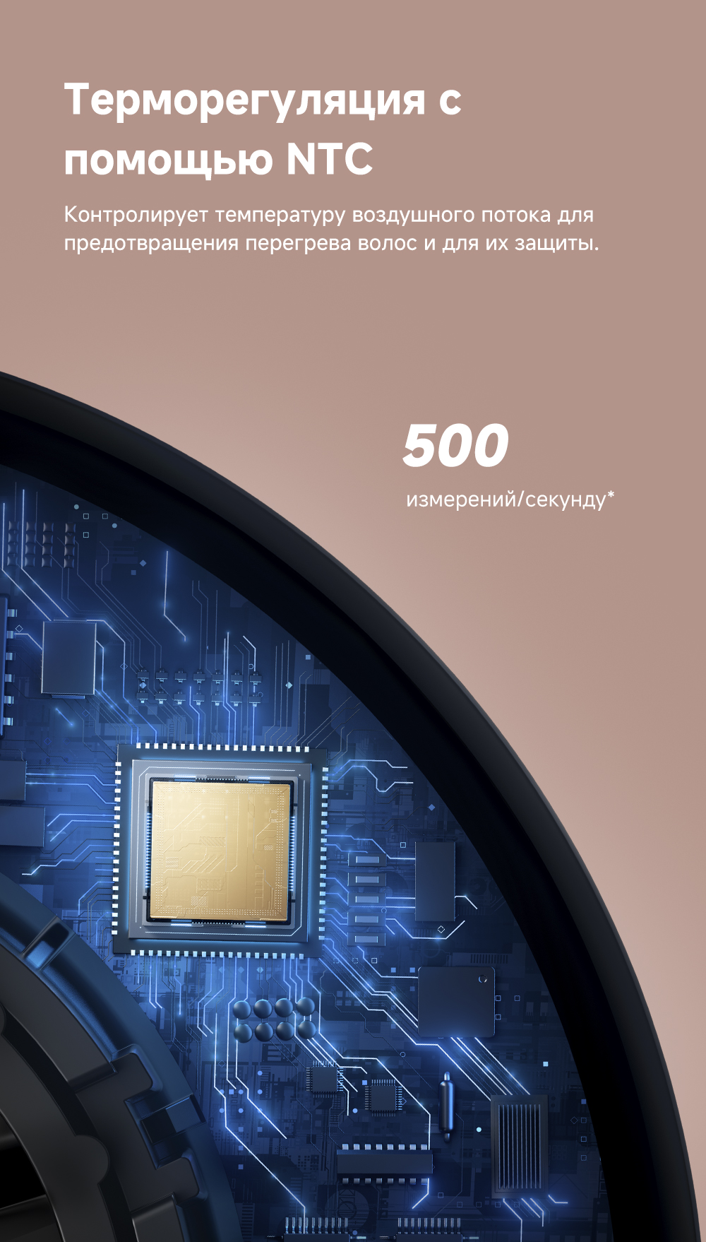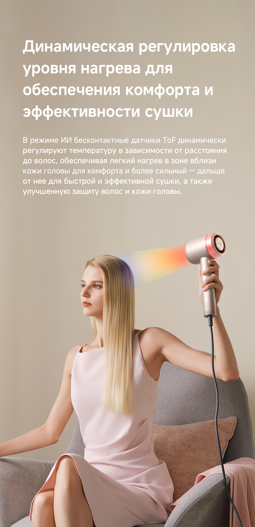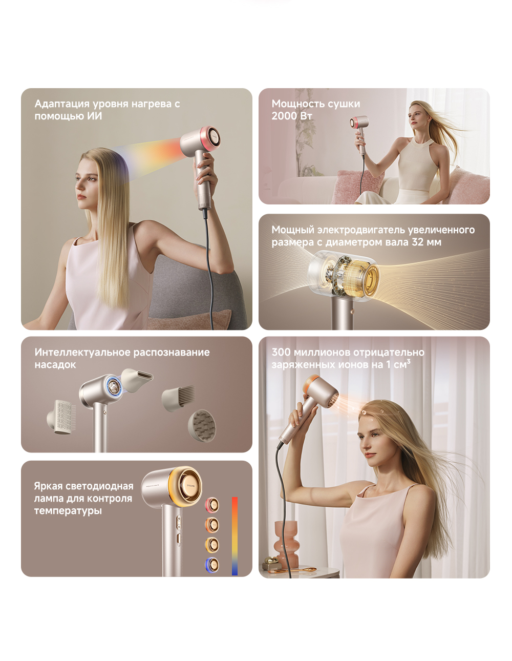 Адаптивная регулировка уровня нагрева на основе ИИ, интеллектуальное распознавание насадок, быстрая сушка, отрицательные ионы нейтрализуют статическое электричество и делают волосы более гладкими, эффективность без перегрева - датчик NTC считывает температуру 500 раз в секунду, чтобы предотвратить перегрев волос и кожи головы.