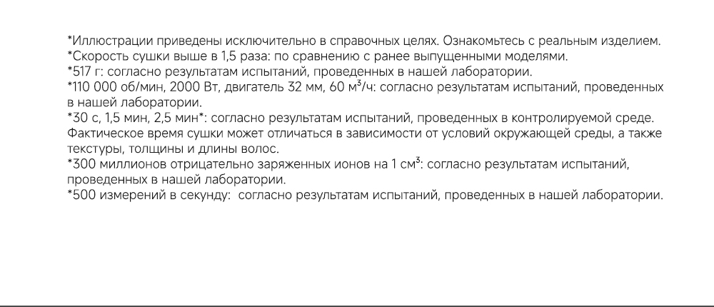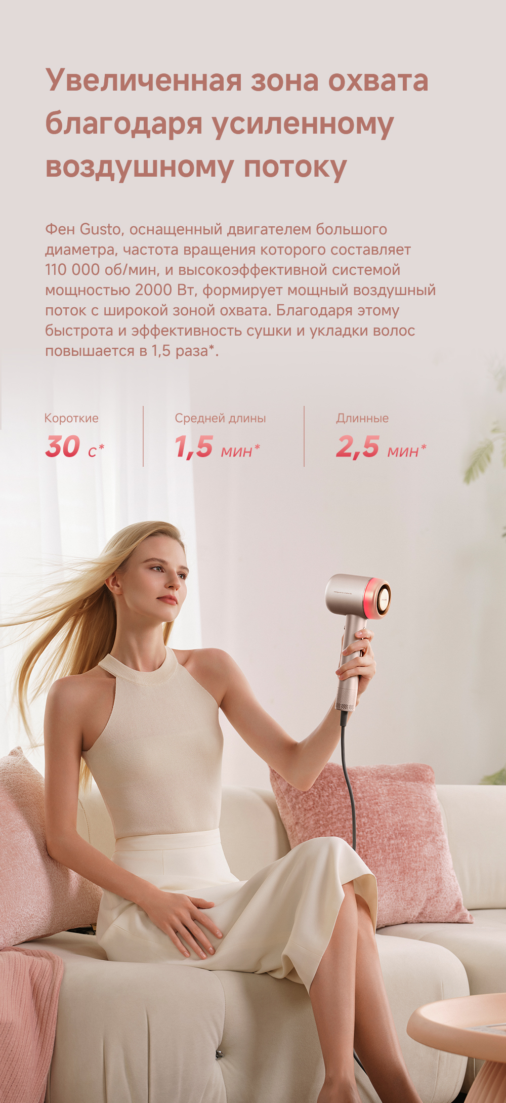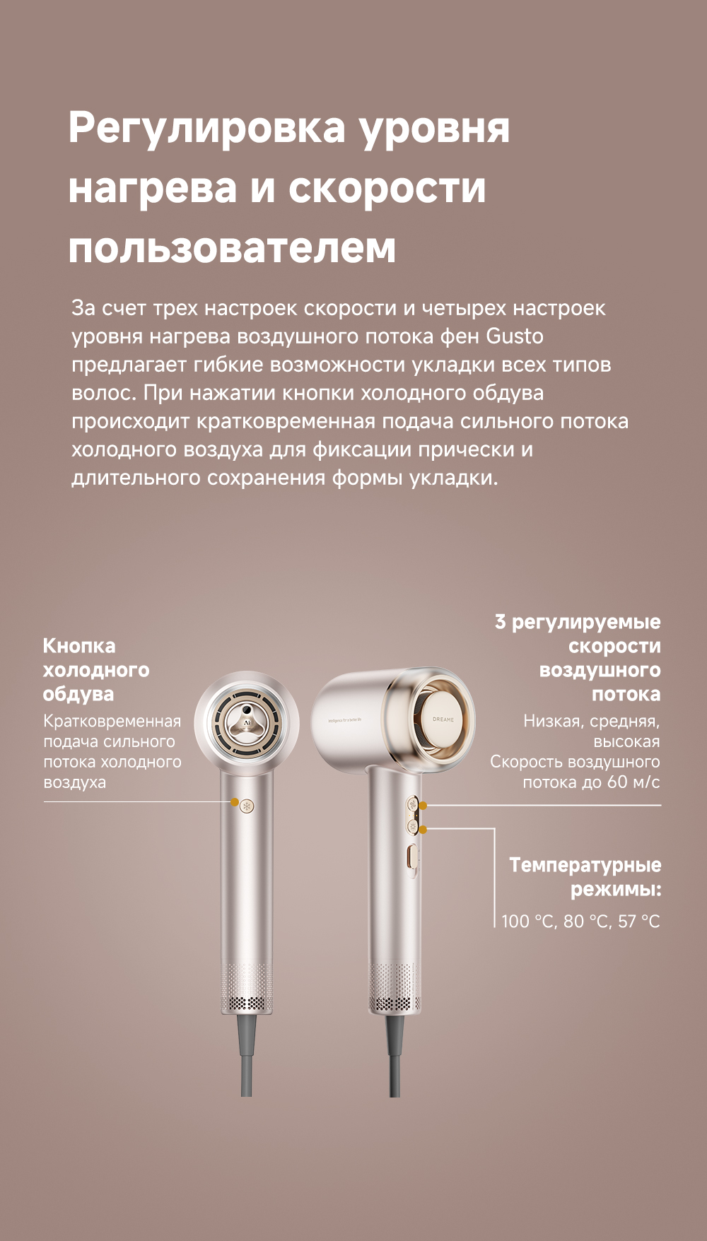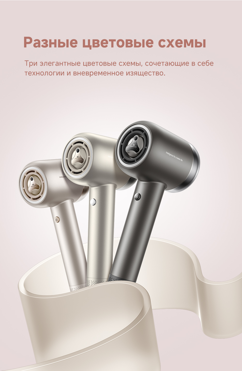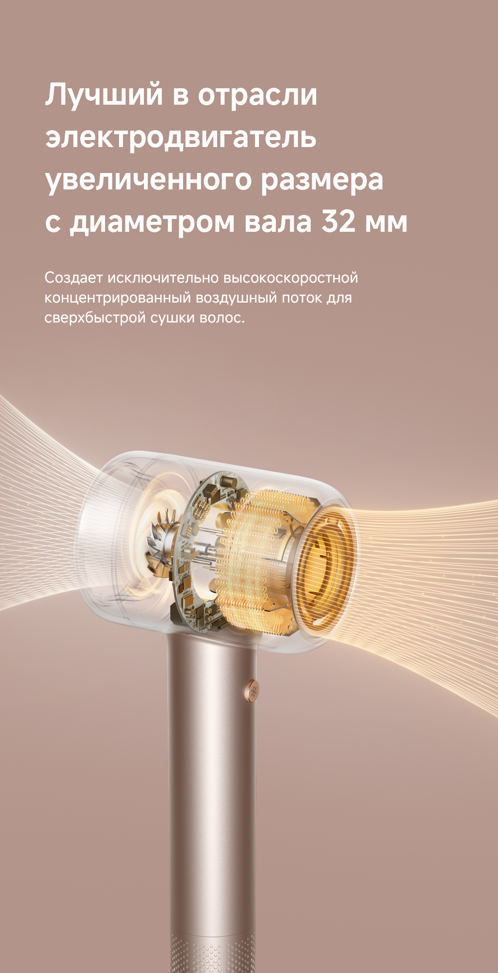 Адаптивная регулировка уровня нагрева на основе ИИ, интеллектуальное распознавание насадок, быстрая сушка, отрицательные ионы нейтрализуют статическое электричество и делают волосы более гладкими, эффективность без перегрева - датчик NTC считывает температуру 500 раз в секунду, чтобы предотвратить перегрев волос и кожи головы.