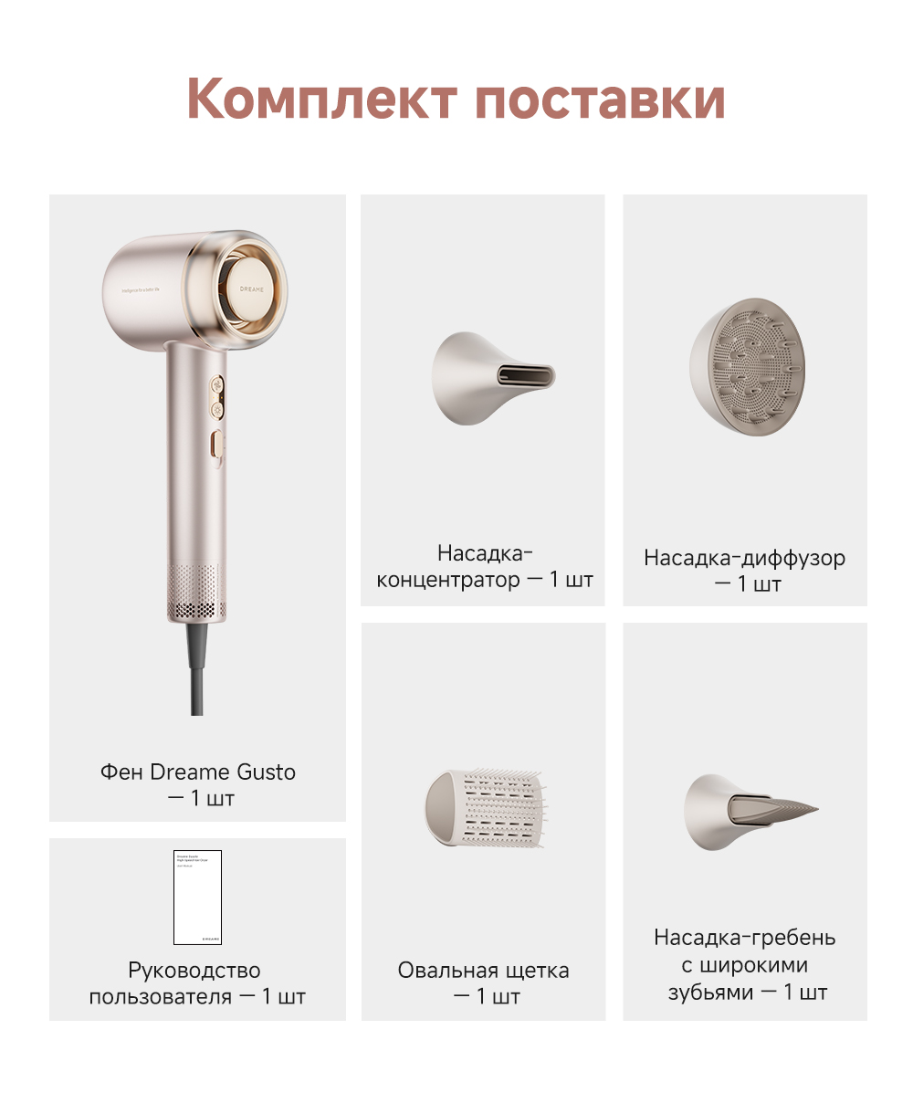Фен, насадка-концентратор, насадка-диффузор, овальная щётка, насадка-гребень с широкими зубьями, руководство пользователя.