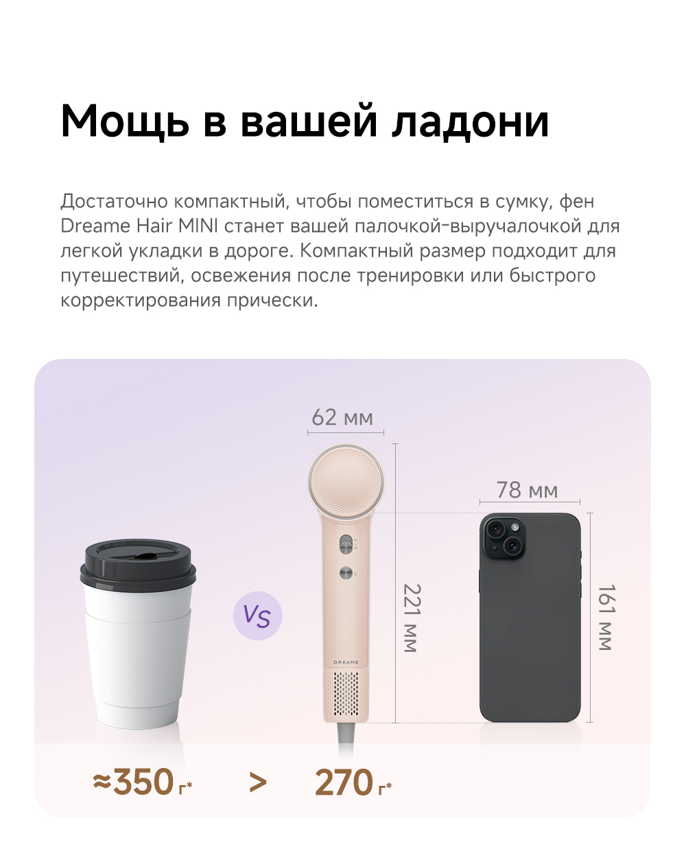 АртикулAHG11AТипФенСвязанные элементы по цветуМощность, Вт1200УправлениеКнопочноеЦветрозовыйОсобенностиМощный воздушный поток, лёгкий вес, всего 270 грамм, компактный размер, высокая концентрация отрицательно заряженных ионов эффективно нейтрализует статическое электричество, разглаживая волосы, детский режим, разработанный для чувствительной кожи головы и тонких волос, обеспечивает мягкую сушку при контролируемой температуре 40°С.Минимальный уровень шума, дБ58Рабочая частота100-240 В / 50-60 ГцКомплектацияФен, краткое руководство пользователя.ДвигательБесщеточныйСкорость мотора, об/мин100000Насадки в комплектеНетКонцентрация отрицательных ионов, мл/см³200Скорость воздушного потока70 м/сИонизация воздухаЕстьЗащита от перегреваЕстьДлина провода, м1.8Холодный обдувЕстьКоличество режимов нагрева5Количество скоростей2МодельНairdryer Mini PinkМинимальная цена со скидкой149Краткое наименованиеMiniГабариты22.1х7.8х6.2 смВес270 гИзготовительDreame Trading (Tianjin) Co. Ltd., Китай, Room 2112-1-1, South District, Finance and Trade Center, No.6975 Yazhou Road, Dongjiang Bonded Port Area, Tianjin Pilot Free Trade Zone, TianjinИмпортерООО "АйТи Дистрибуция", 223053, Республика Беларусь, Минская область, Минский район, Боровлянский с/с, 103/3-7, помещение №7-50Гарантийный срок12 месяцев