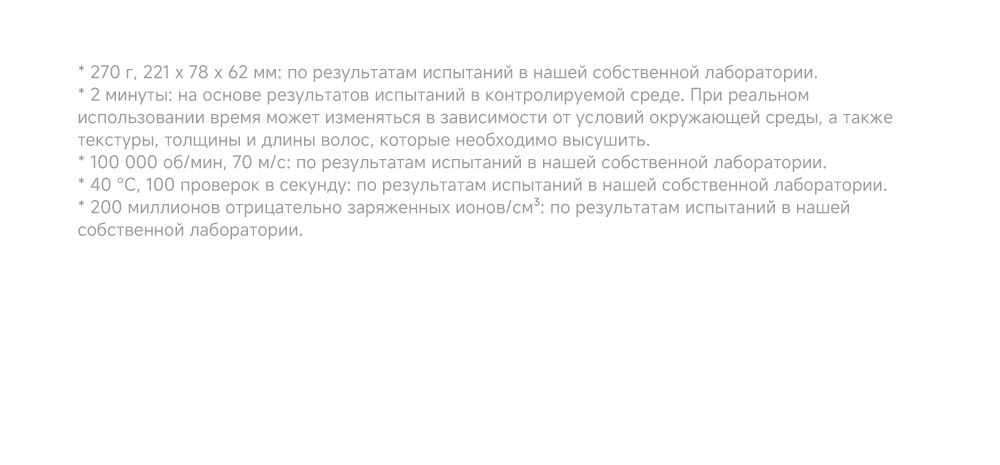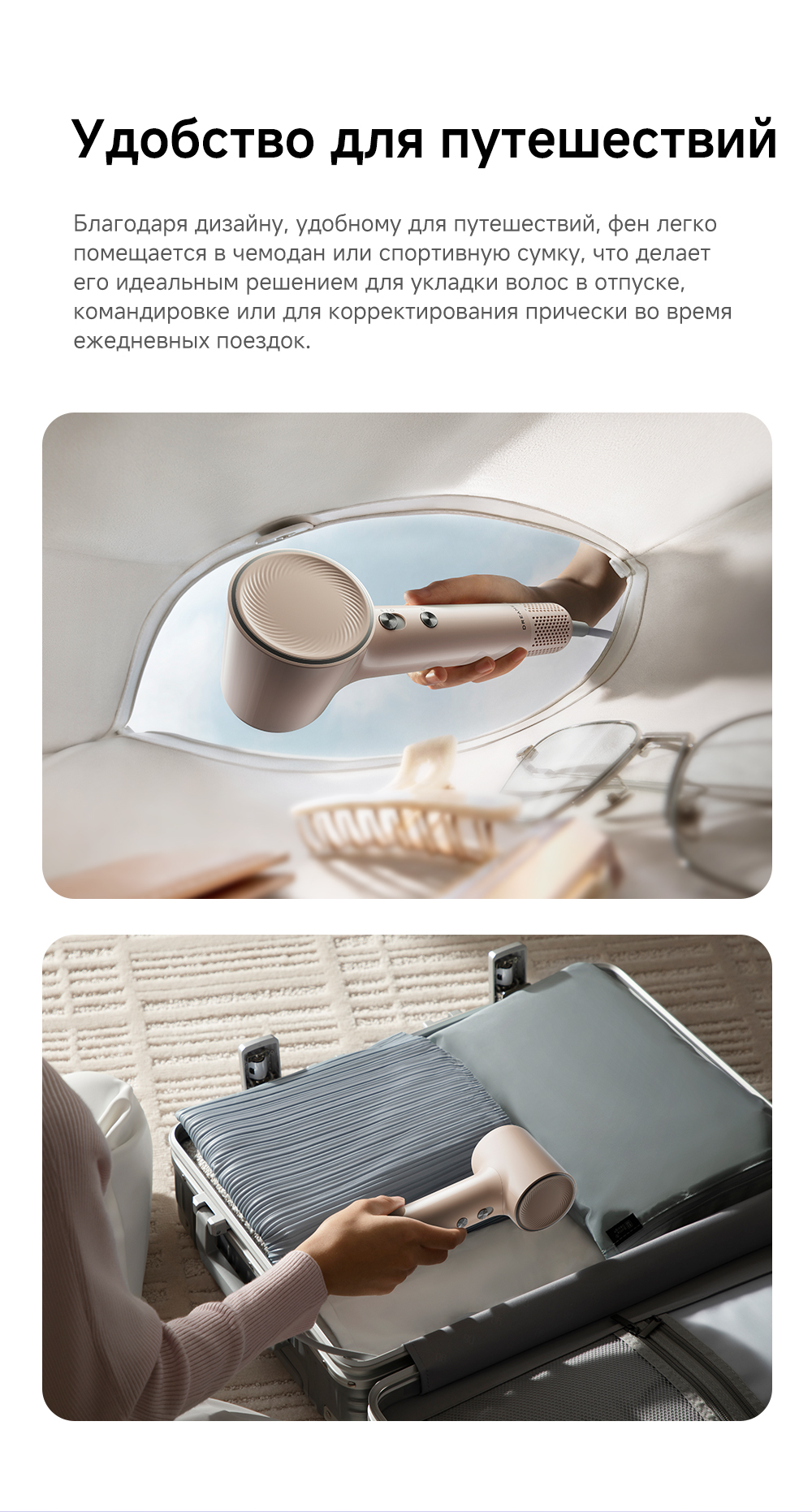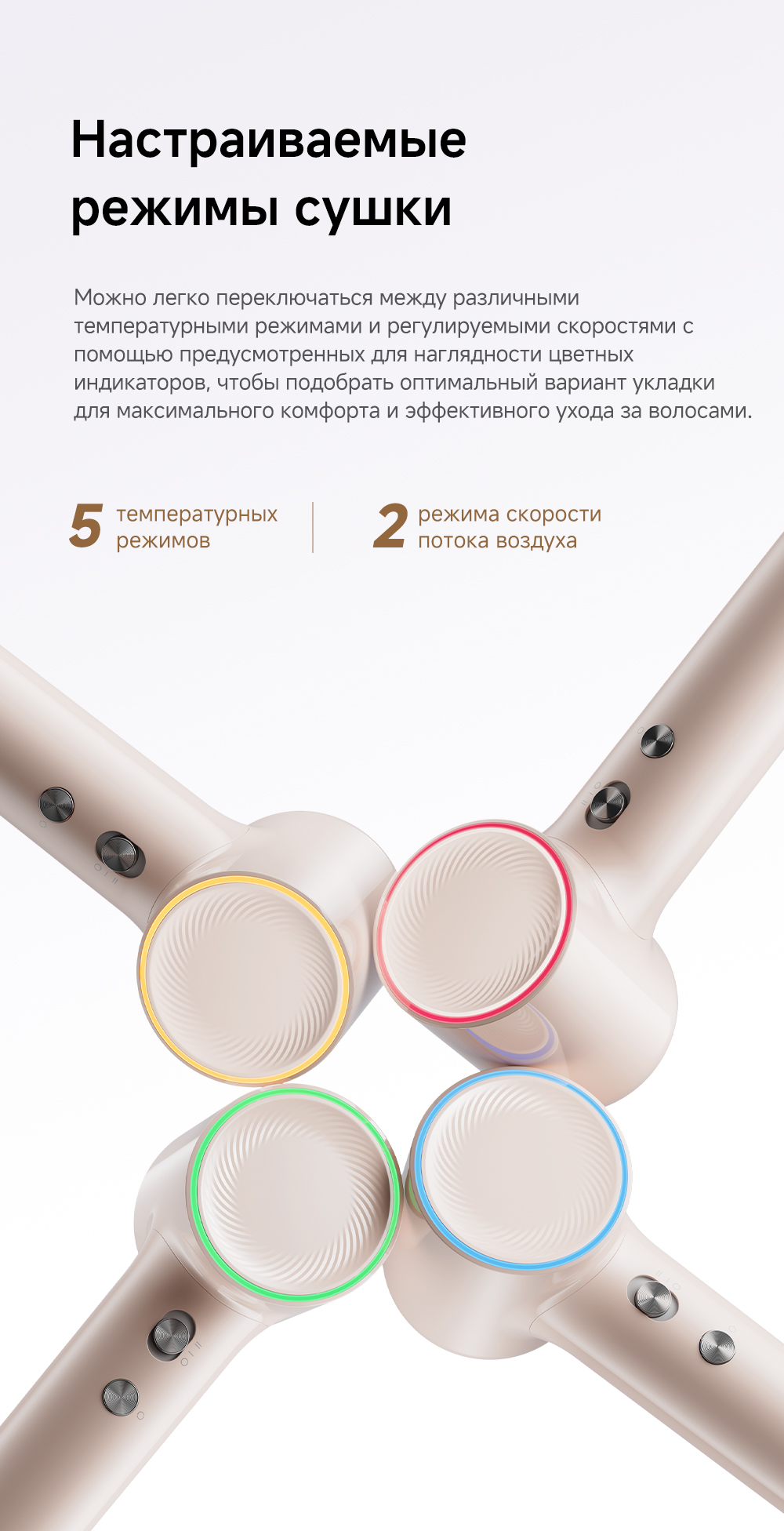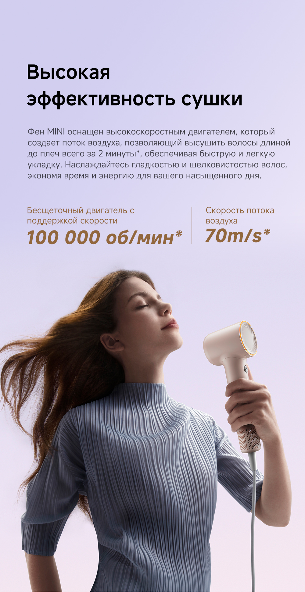 Мощный воздушный поток, лёгкий вес, всего 270 грамм, компактный размер, высокая концентрация отрицательно заряженных ионов эффективно нейтрализует статическое электричество, разглаживая волосы, детский режим, разработанный для чувствительной кожи головы и тонких волос, обеспечивает мягкую сушку при контролируемой температуре 40°С.