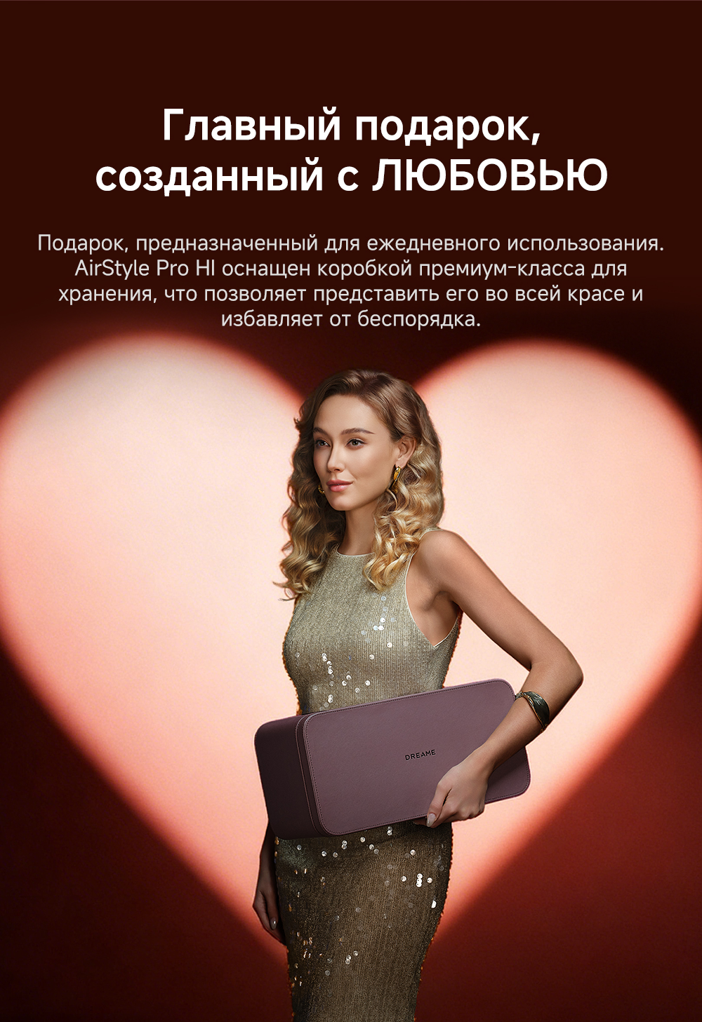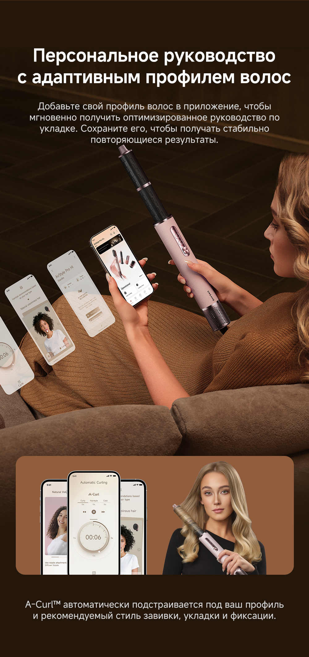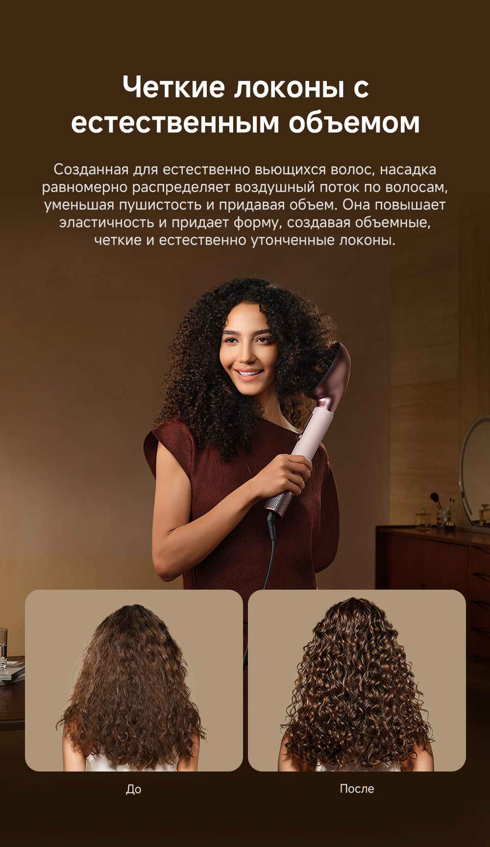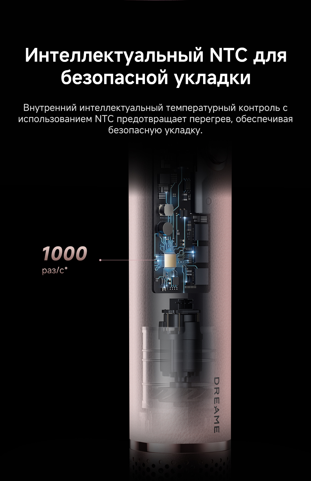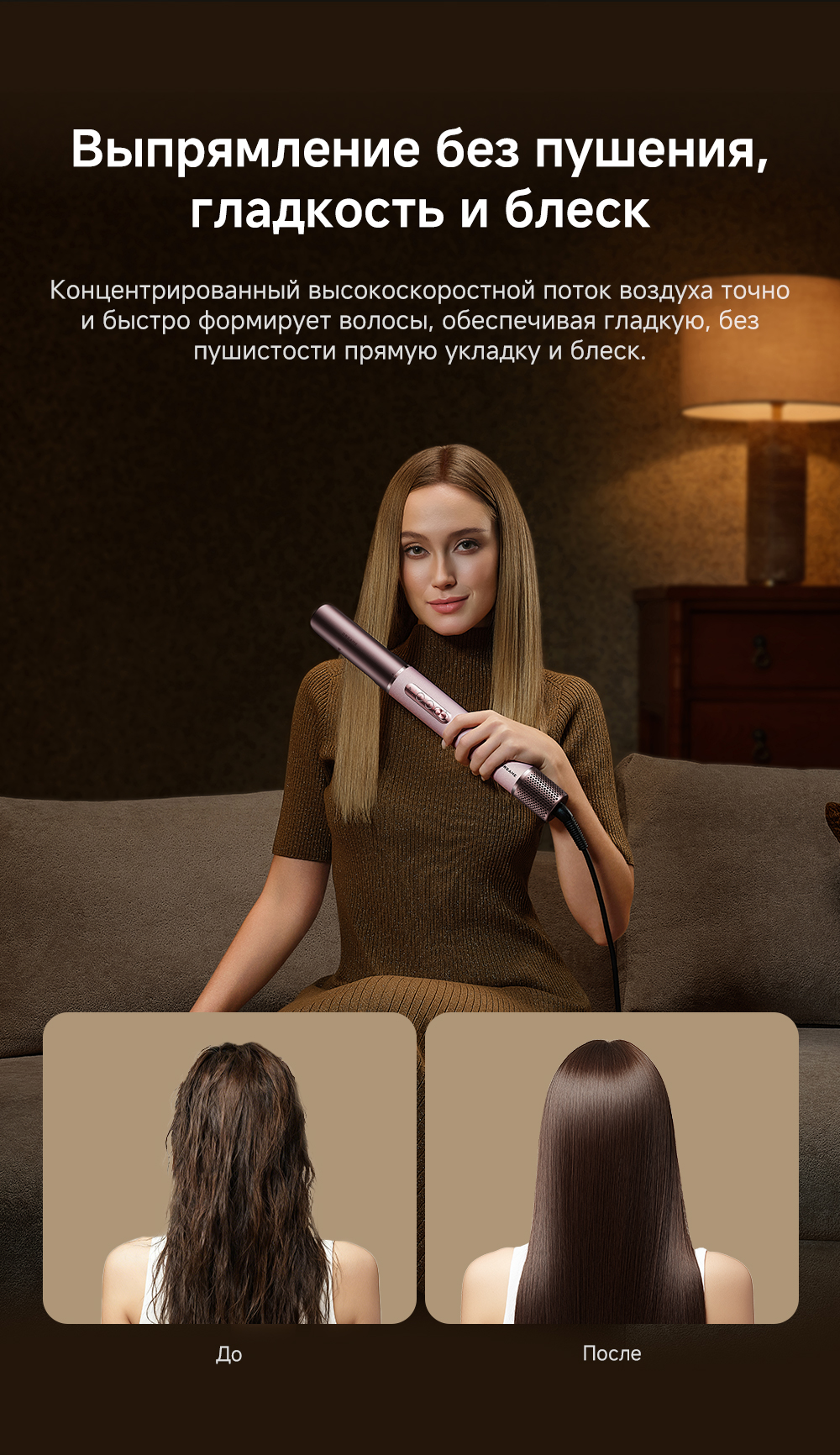 Высокая скорость воздушного потока - 70 м/с. 8 профессиональных насадок. AirStyle Pro HI проверяет температуру до 1000 раз в секунду с помощью NTC термистора и поддерживает стабильный безопасный воздушный поток. Мощный направленный поток воздуха. Двухслойный входной воздушный фильтр: внутренняя сетка из нержавеющей стали задерживает мелкие частицы, а внешняя предотвращает их спутывание. Антизапутывающийся кабель с вращением 360°. Текстурированное покрытие корпуса из мягкой зернистой кожи. Фирменное приложение Dreamehome анализирует тип волос и предпочтения, предлагая персональные решения для укладки.