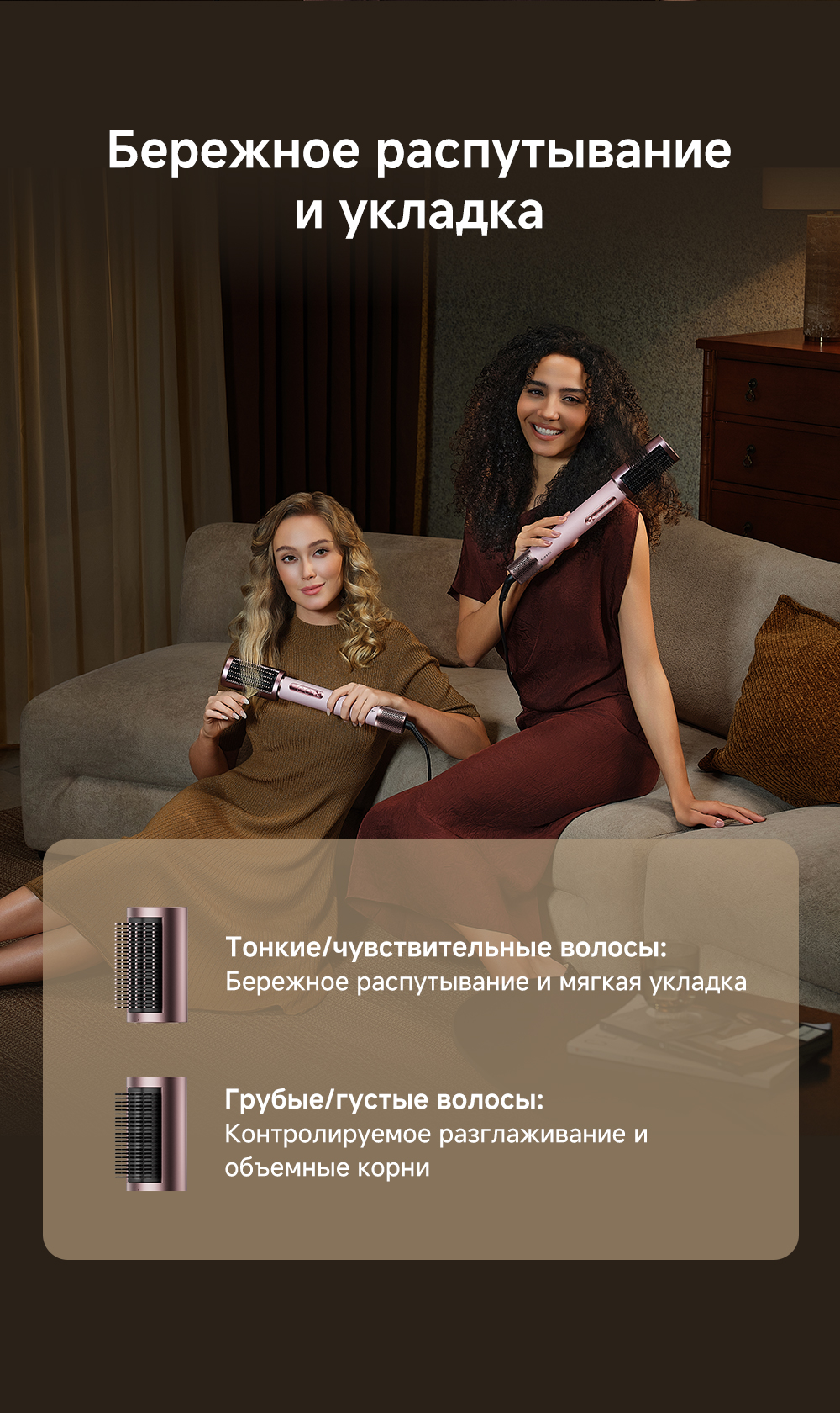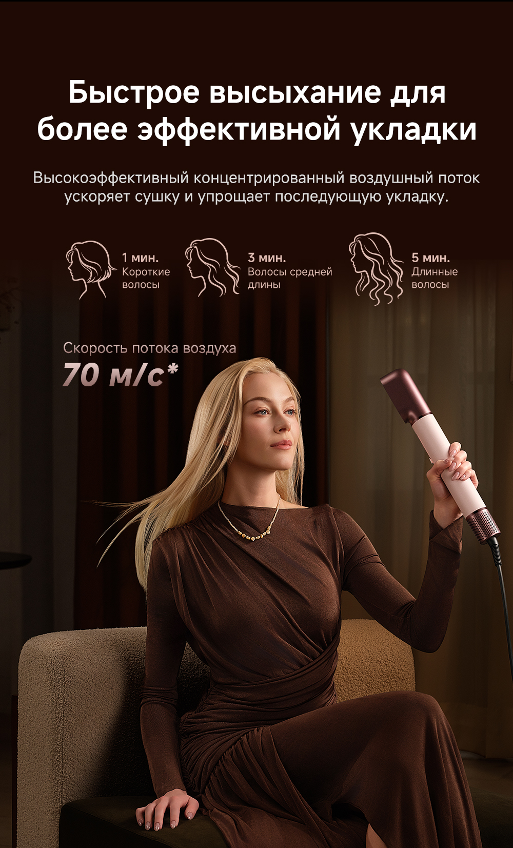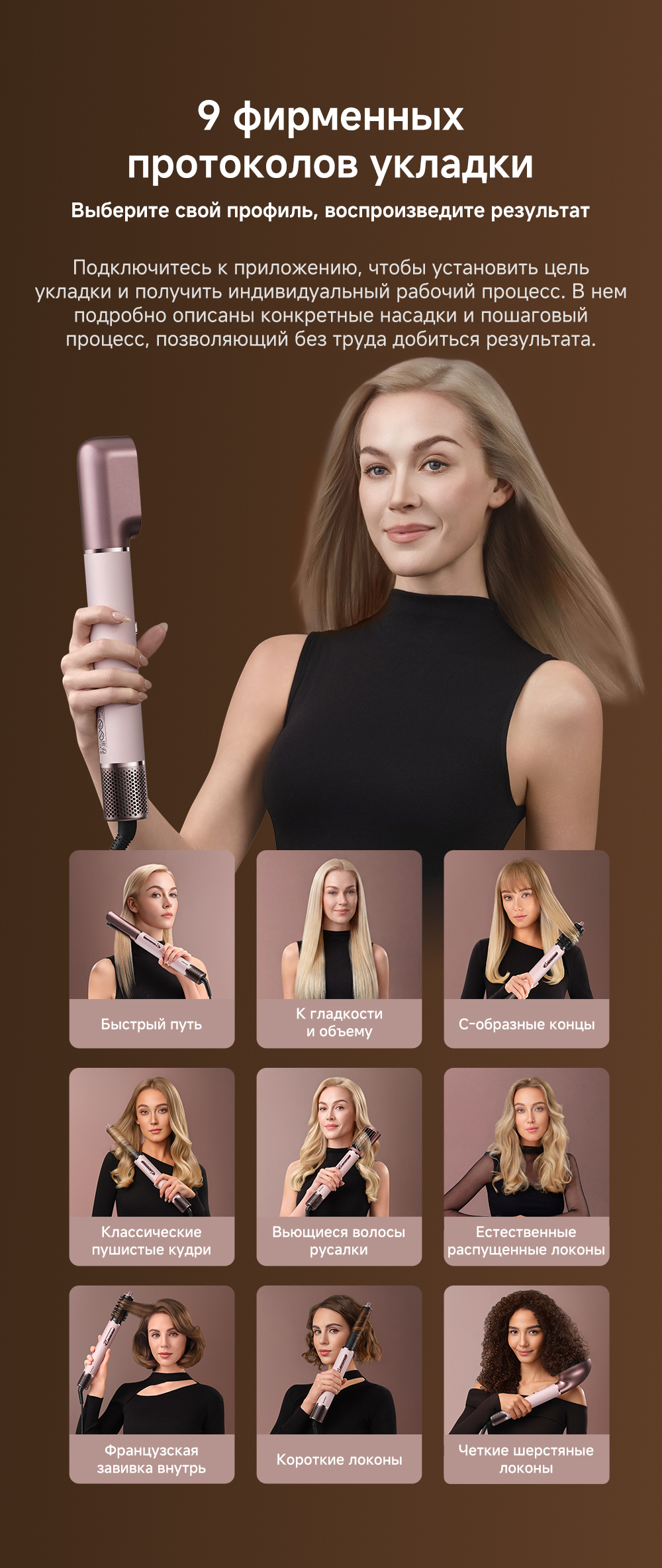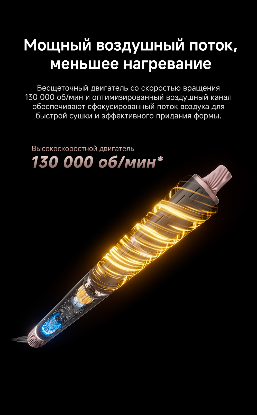 Высокая скорость воздушного потока - 70 м/с. 8 профессиональных насадок. AirStyle Pro HI проверяет температуру до 1000 раз в секунду с помощью NTC термистора и поддерживает стабильный безопасный воздушный поток. Мощный направленный поток воздуха. Двухслойный входной воздушный фильтр: внутренняя сетка из нержавеющей стали задерживает мелкие частицы, а внешняя предотвращает их спутывание. Антизапутывающийся кабель с вращением 360°. Текстурированное покрытие корпуса из мягкой зернистой кожи. Фирменное приложение Dreamehome анализирует тип волос и предпочтения, предлагая персональные решения для укладки.