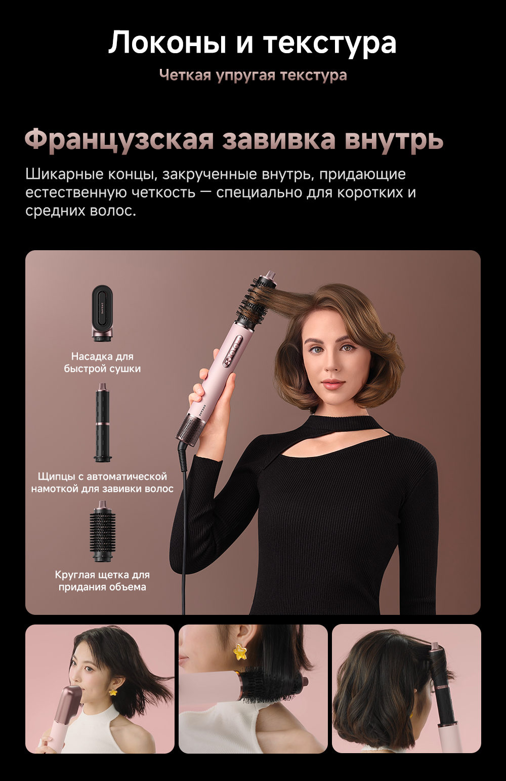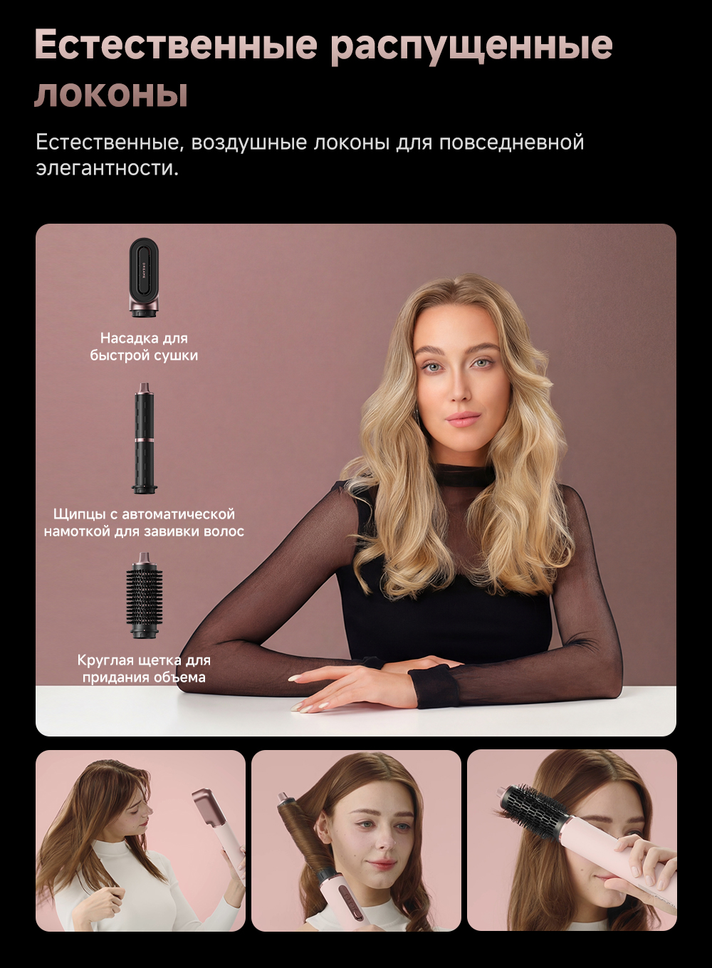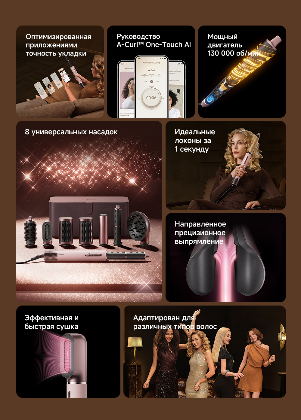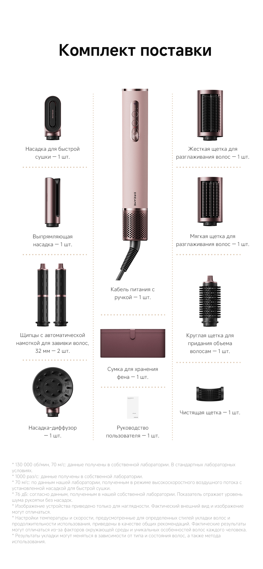 2 насадки для завивки волос 32мм / Диффузор / Жесткая щетка для разглаживания волос / Круглая щетка для придания объема волосам / Мягкая щетка для разглаживания волос / Насадка для быстрой сушки / Насадка для выпрямления волос