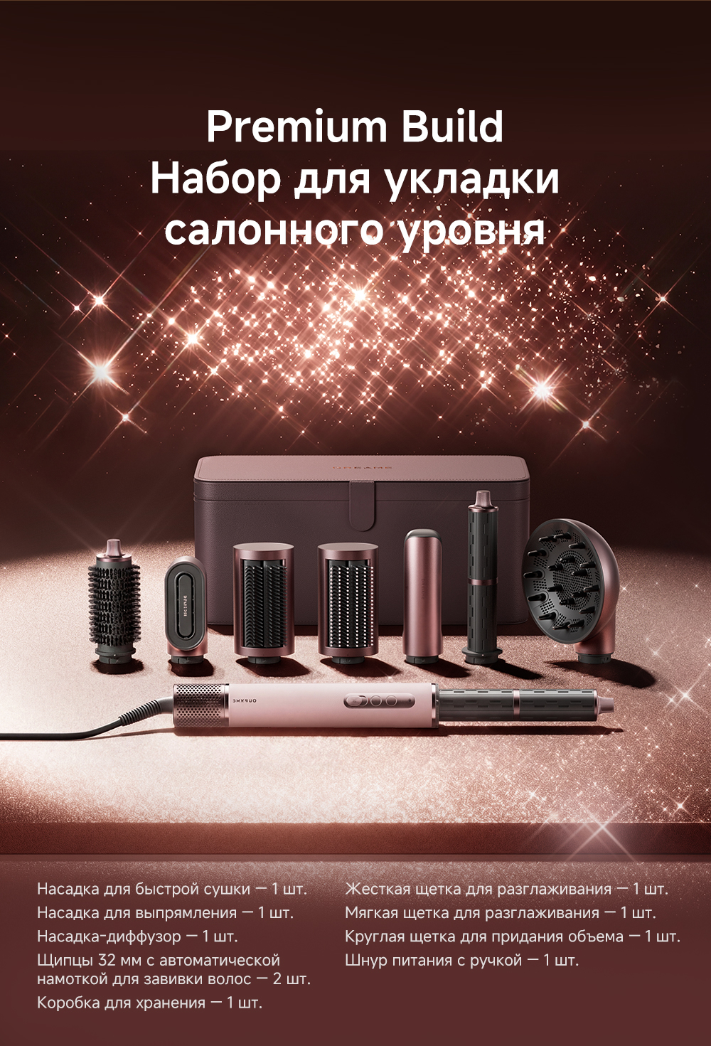 Насадка для завивки 32мм 2 шт., насадка для выпрямления волос, жесткая разглаживающая щетка, мягкая разглаживающая щетка, насадка для быстрой сушки, круглая щетка для объема, диффузор, щетка для очистки фильтра, кейс для хранения, руководство пользователя.