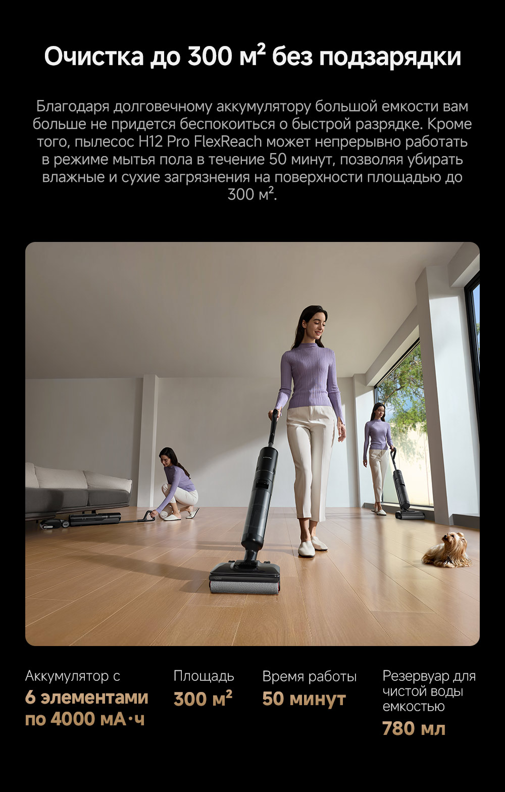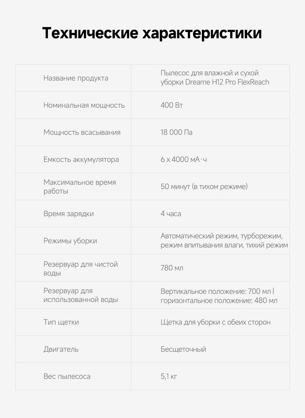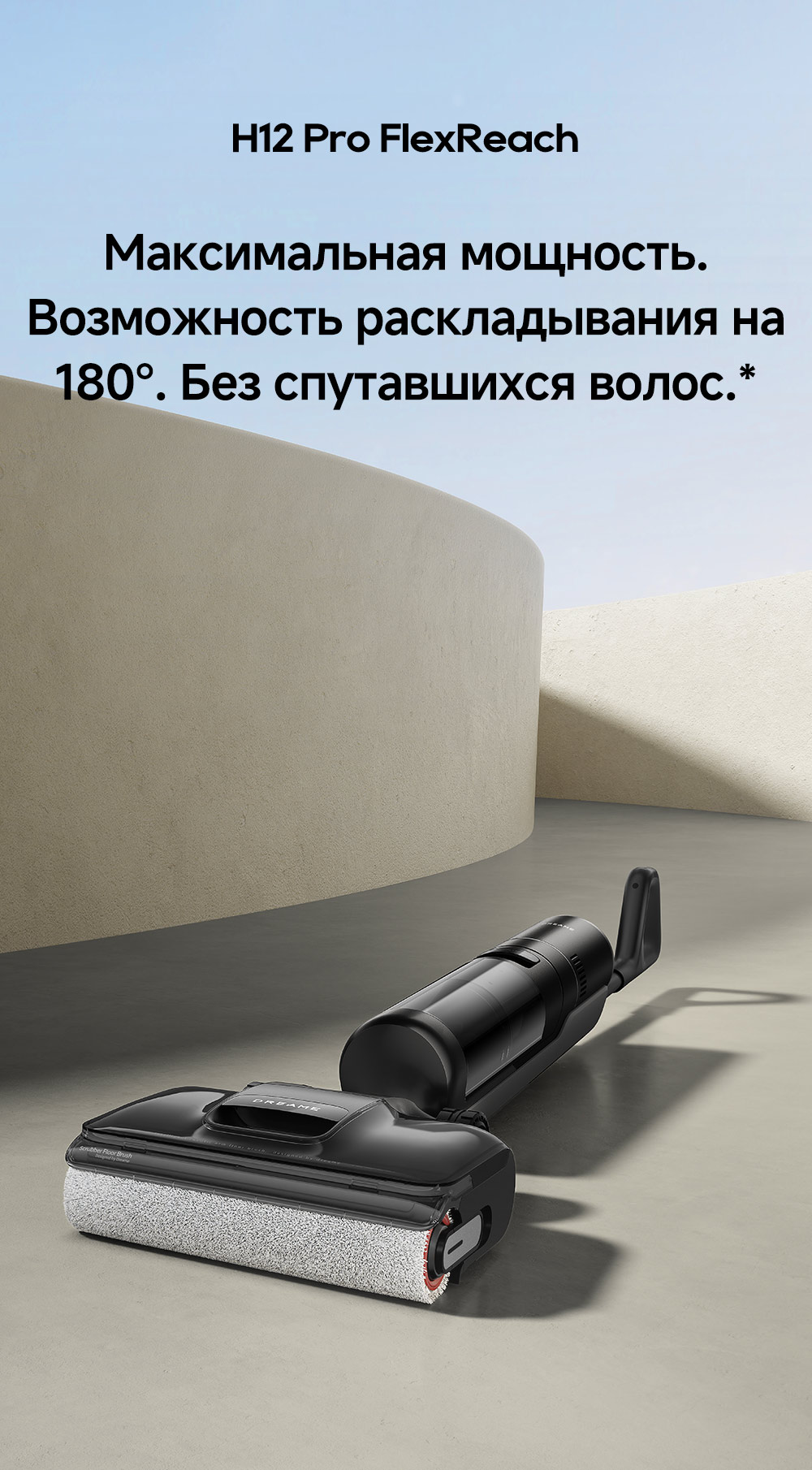 АртикулHHR44AТипМоющий беспроводной пылесосМощность, Вт400УправлениеКнопочноеЁмкость аккумулятора6х4000 мАчРекомендованные товарыЦветчерныйОсобенностиВысокая мощность - 18 000 Па, полная уборка с обеих сторон, скребок TungleCut для предотвращения наматывания волос, наклон ручки на 180°, автоматическая очистка и сушка при температуре 90°С одним нажатием кнопки.СерияH - серияТип уборкиВлажная / СухаяВремя автономной работы50 минутМаксимальная мощность всасывания, кПа18Количество режимов уборки4Режимы работыАвтоматический / Режим всасывания / Тихий / ТурбоСистема фильтрацииHEPA-фильтрУборка ковровНетОбъем контейнера для грязной воды, л0.7Тип щёткиМягкая роликовая щеткаОбъем контейнера для чистой воды, л0.78КомплектацияОсновной корпус, док-станция, запасная роликовая щётка, ёршик для очистки, запасной фильтр, моющее средство 500 мл.ДисплейLED-дисплейПодсказкиЕстьМодельH12 Pro Flex ReachВлажный тип уборкиДаМинимальная цена со скидкой1599Краткое наименованиеH12 Pro Flex ReachИзготовительDreame Trading (Tianjin) Co. Ltd., Китай, Room 2112-1-1, South District, Finance and Trade Center, No.6975 Yazhou Road, Dongjiang Bonded Port Area, Tianjin Pilot Free Trade Zone, TianjinИмпортерООО "АйТи Дистрибуция", 223053, Республика Беларусь, Минская область, Минский район, Боровлянский с/с, 103/3-7, помещение №7-50Гарантийный срок12 месяцев