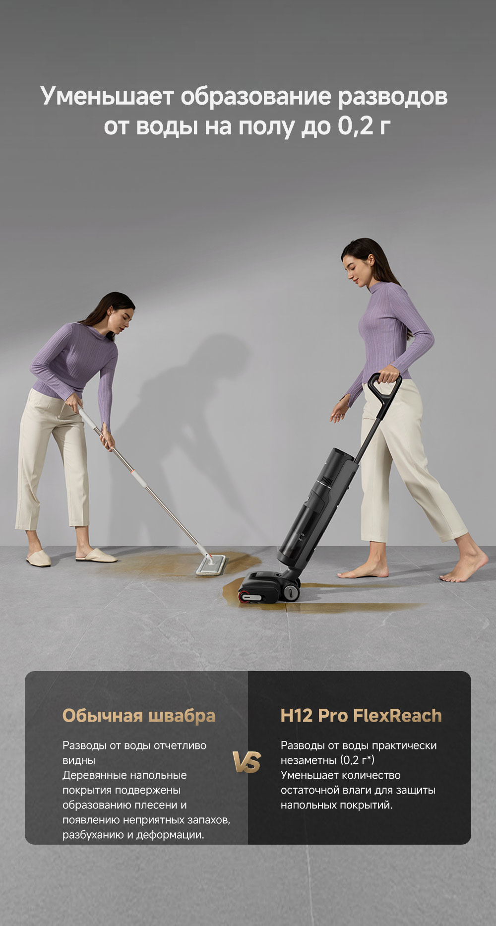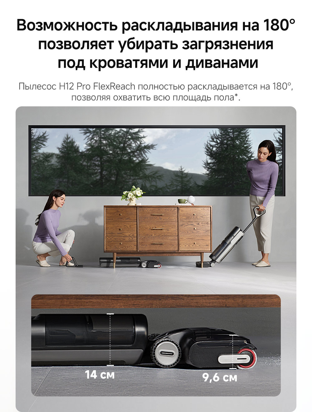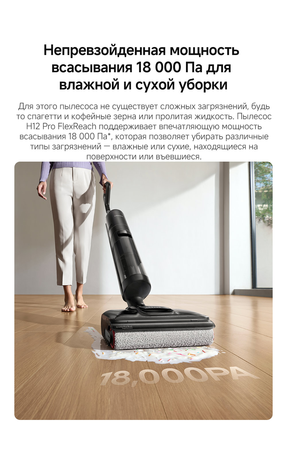 АртикулHHR44AТипМоющий беспроводной пылесосМощность, Вт400УправлениеКнопочноеЁмкость аккумулятора6х4000 мАчРекомендованные товарыЦветчерныйОсобенностиВысокая мощность - 18 000 Па, полная уборка с обеих сторон, скребок TungleCut для предотвращения наматывания волос, наклон ручки на 180°, автоматическая очистка и сушка при температуре 90°С одним нажатием кнопки.СерияH - серияТип уборкиВлажная / СухаяВремя автономной работы50 минутМаксимальная мощность всасывания, кПа18Количество режимов уборки4Режимы работыАвтоматический / Режим всасывания / Тихий / ТурбоСистема фильтрацииHEPA-фильтрУборка ковровНетОбъем контейнера для грязной воды, л0.7Тип щёткиМягкая роликовая щеткаОбъем контейнера для чистой воды, л0.78КомплектацияОсновной корпус, док-станция, запасная роликовая щётка, ёршик для очистки, запасной фильтр, моющее средство 500 мл.ДисплейLED-дисплейПодсказкиЕстьМодельH12 Pro Flex ReachВлажный тип уборкиДаМинимальная цена со скидкой1599Краткое наименованиеH12 Pro Flex ReachИзготовительDreame Trading (Tianjin) Co. Ltd., Китай, Room 2112-1-1, South District, Finance and Trade Center, No.6975 Yazhou Road, Dongjiang Bonded Port Area, Tianjin Pilot Free Trade Zone, TianjinИмпортерООО "АйТи Дистрибуция", 223053, Республика Беларусь, Минская область, Минский район, Боровлянский с/с, 103/3-7, помещение №7-50Гарантийный срок12 месяцев