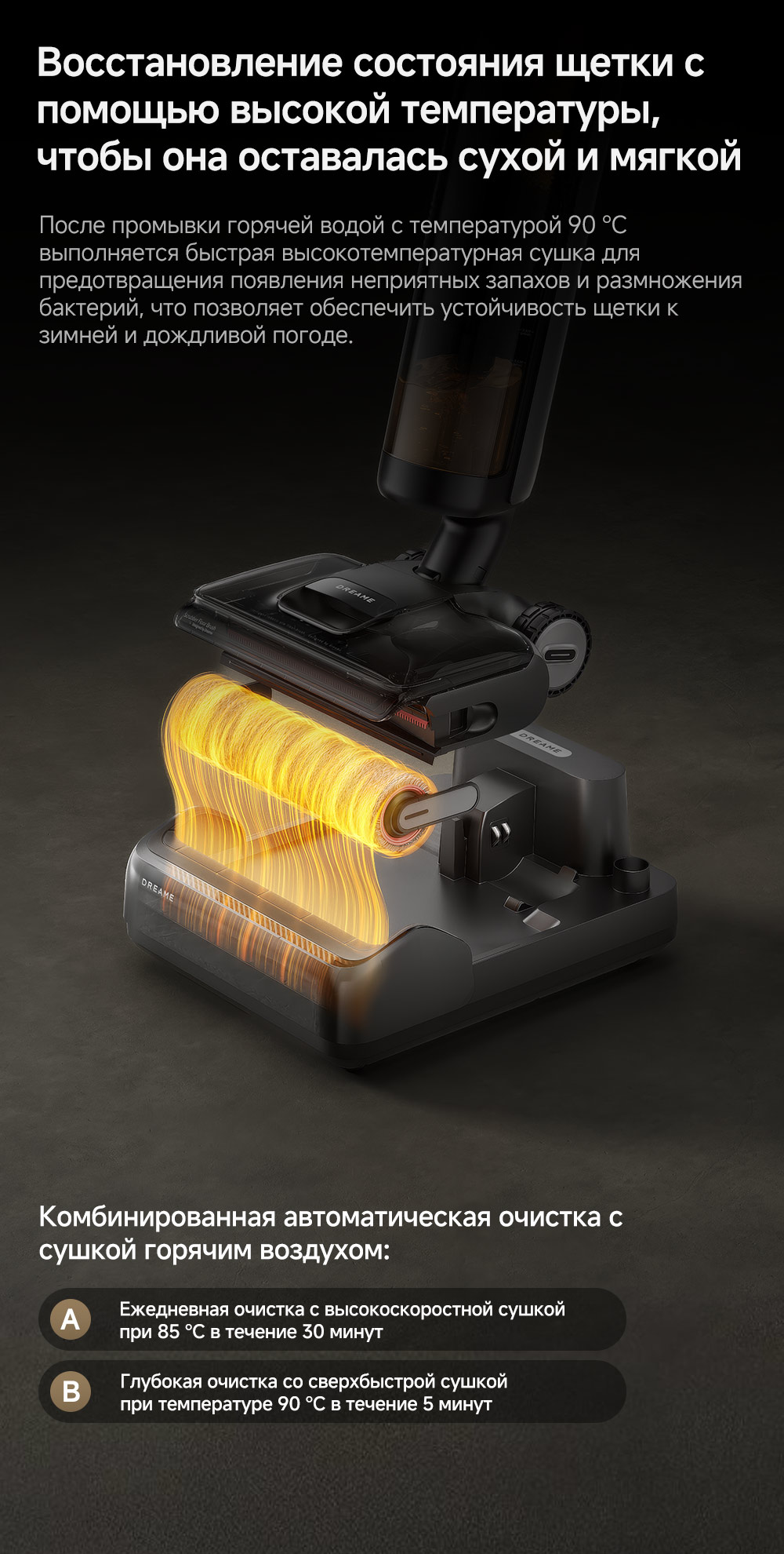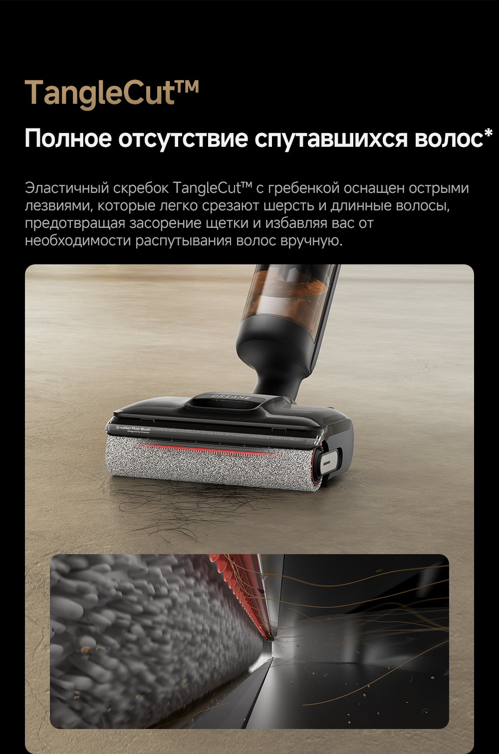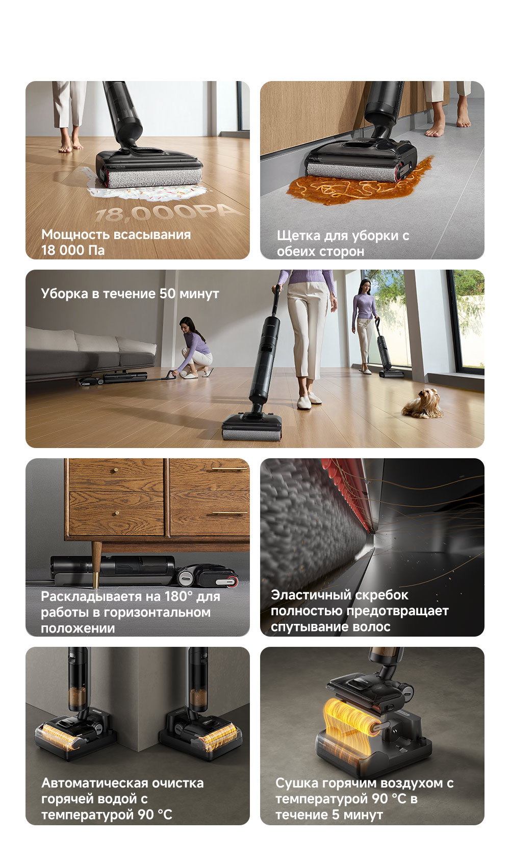 Высокая мощность - 18 000 Па, полная уборка с обеих сторон, скребок TungleCut для предотвращения наматывания волос, наклон ручки на 180°, автоматическая очистка и сушка при температуре 90°С одним нажатием кнопки.