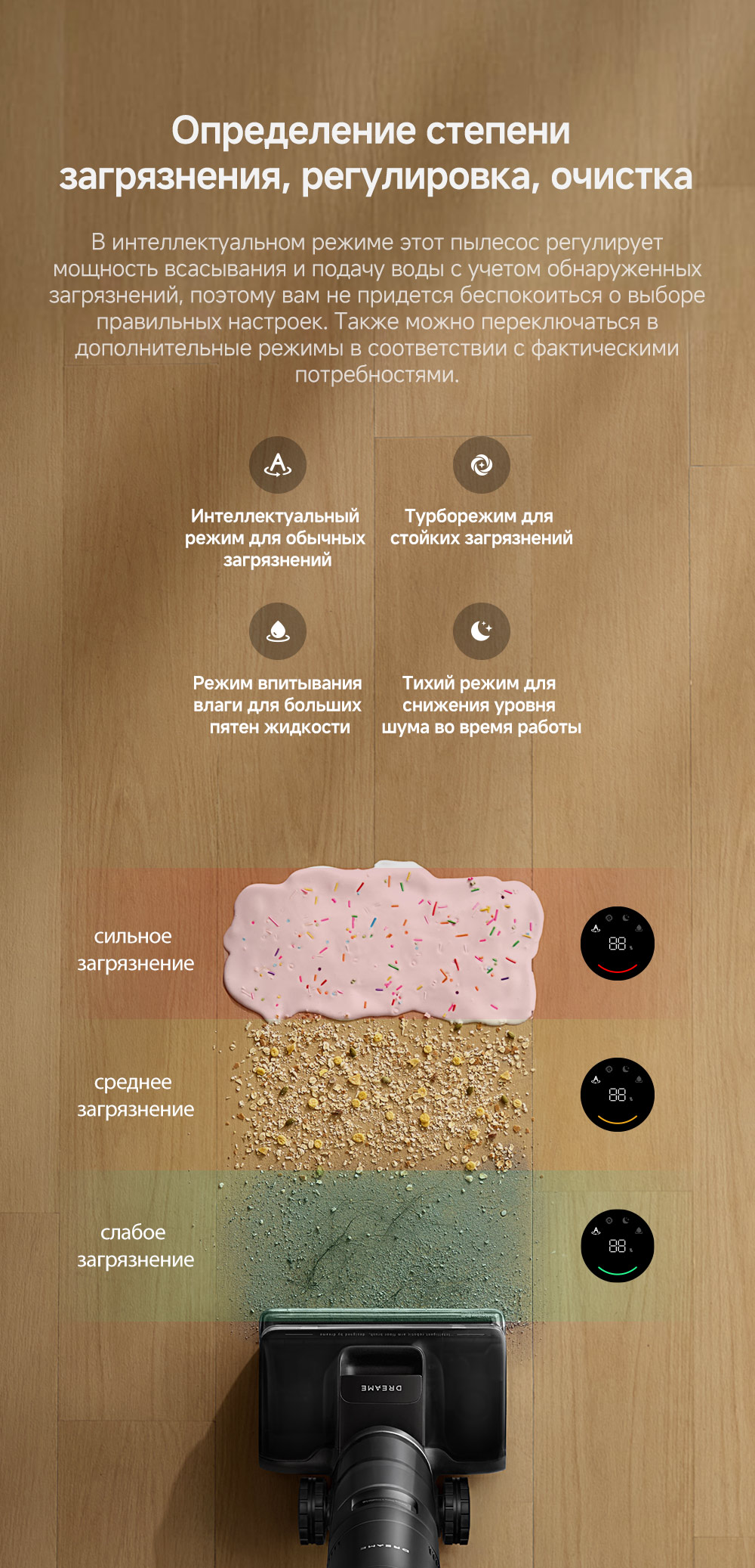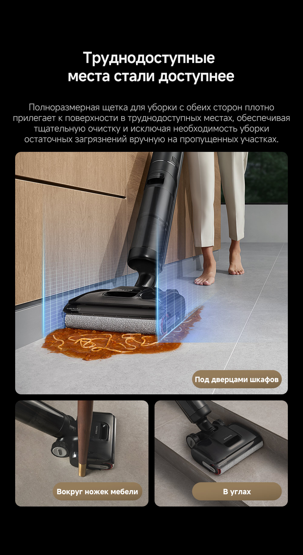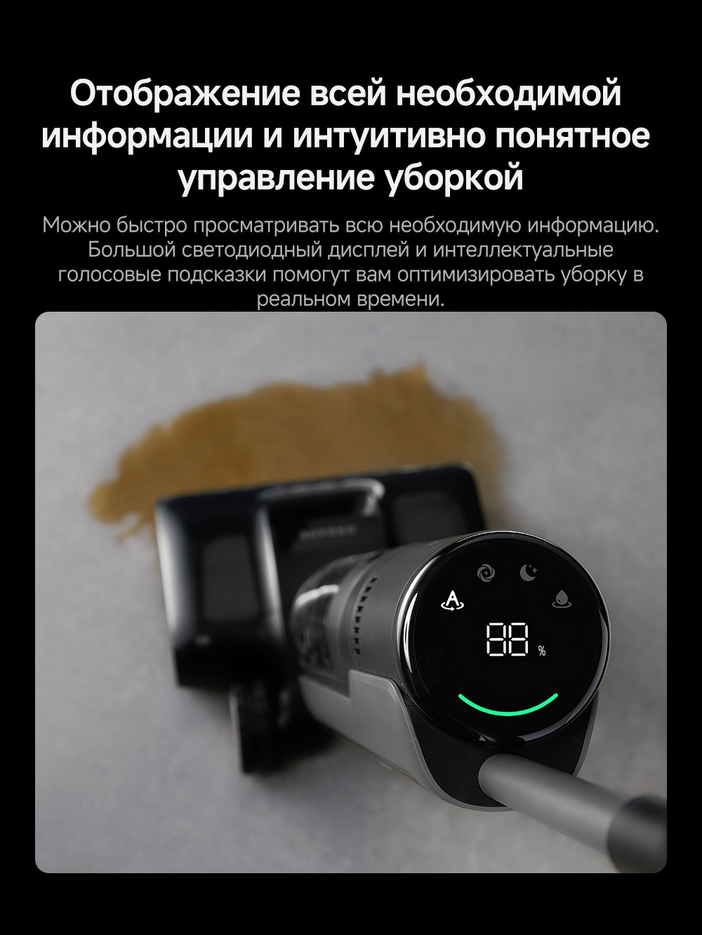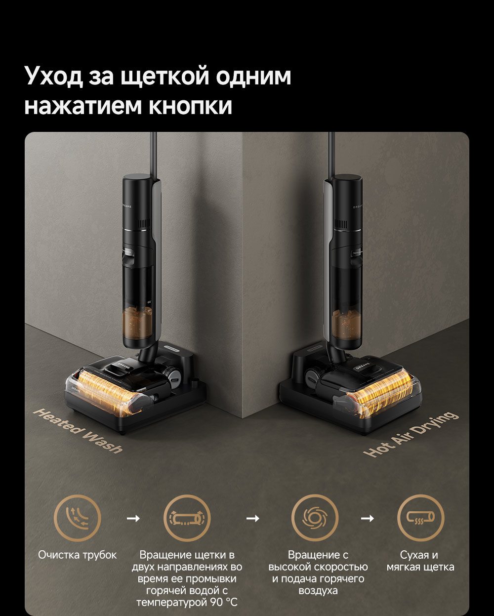 Высокая мощность - 18 000 Па, полная уборка с обеих сторон, скребок TungleCut для предотвращения наматывания волос, наклон ручки на 180°, автоматическая очистка и сушка при температуре 90°С одним нажатием кнопки.
