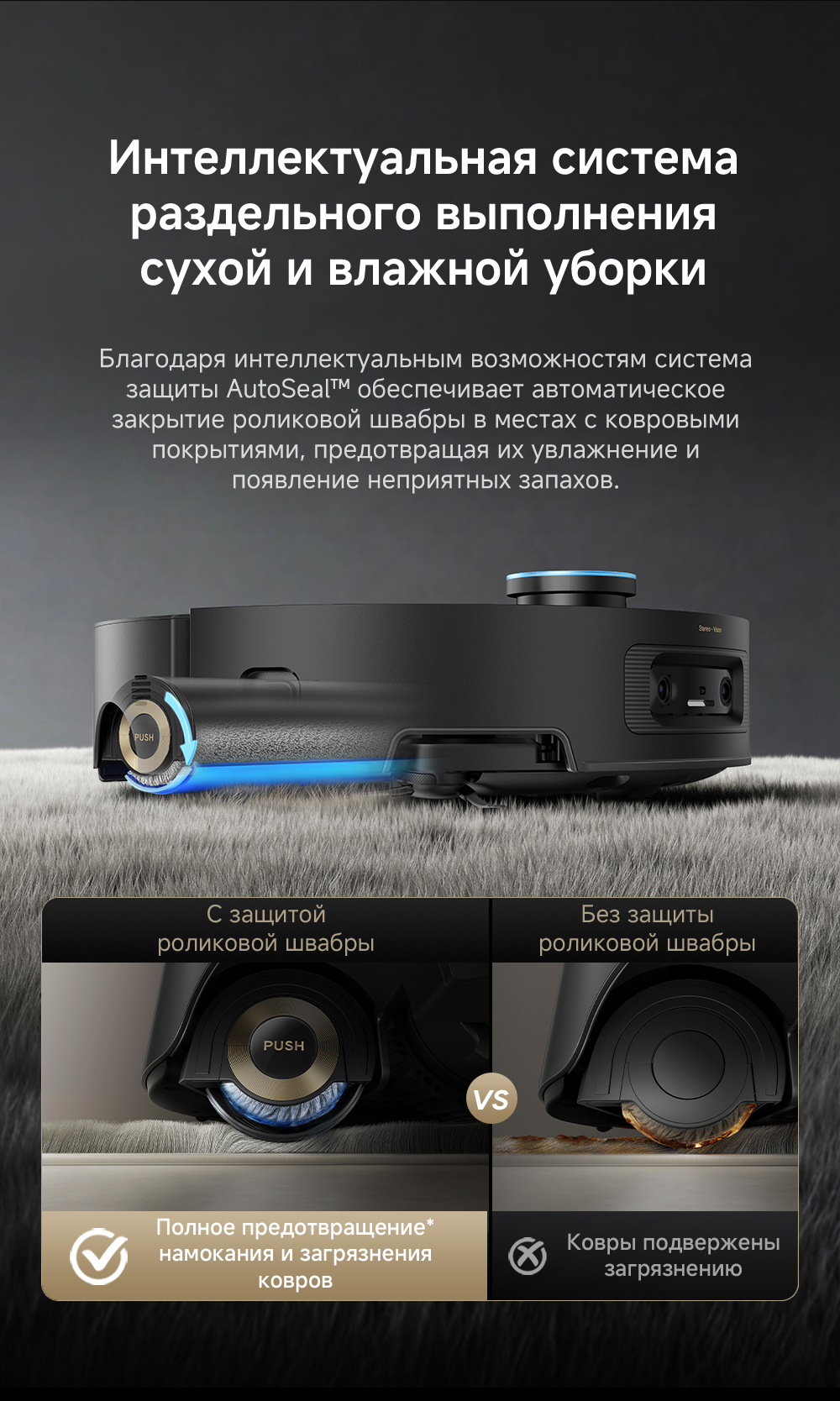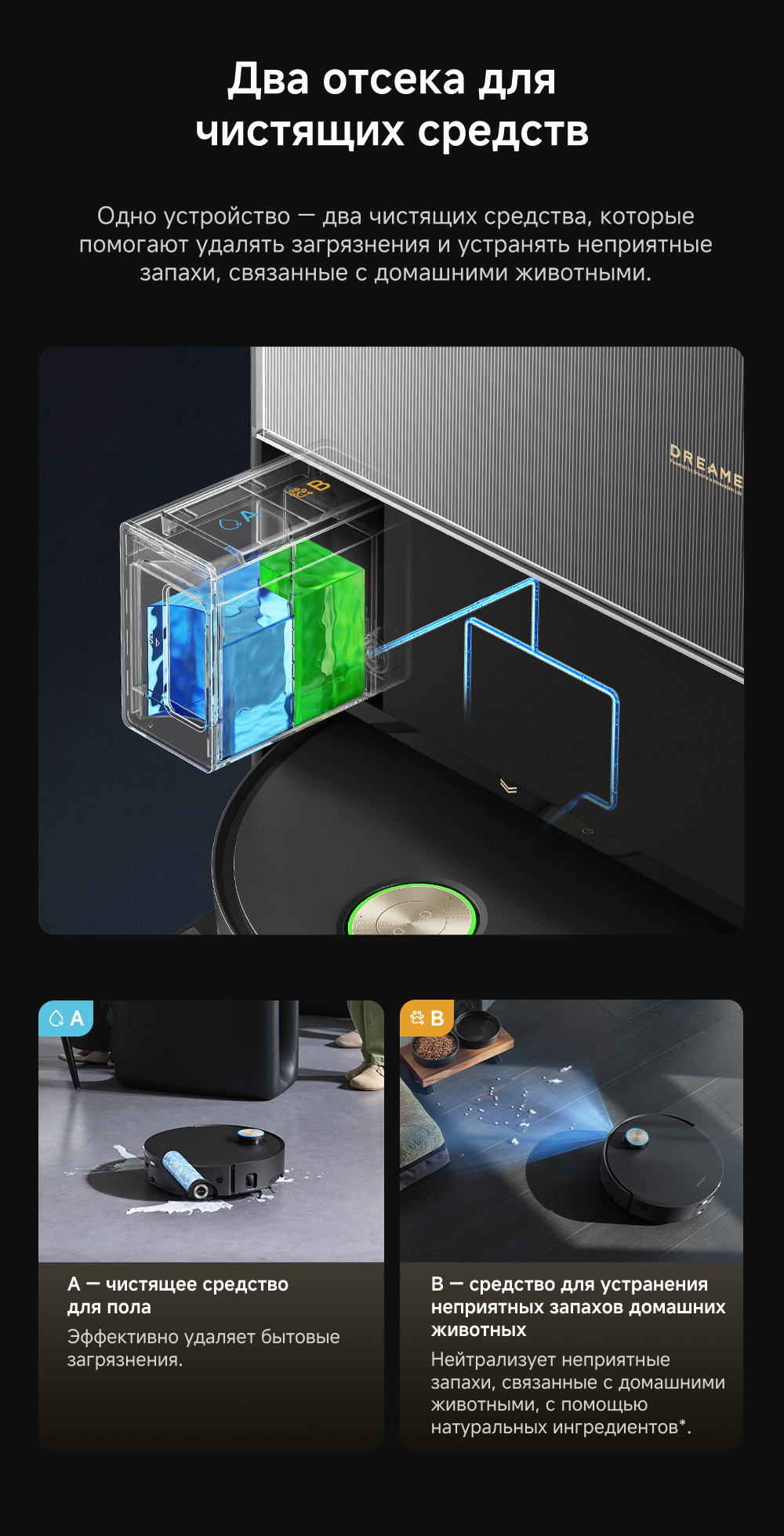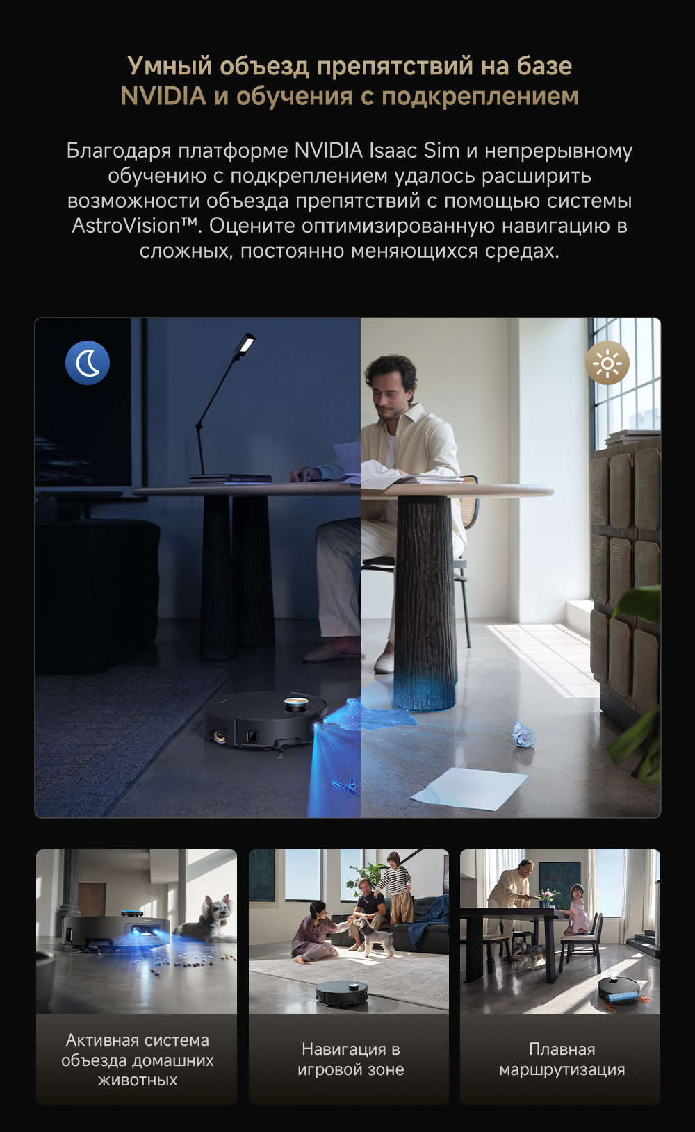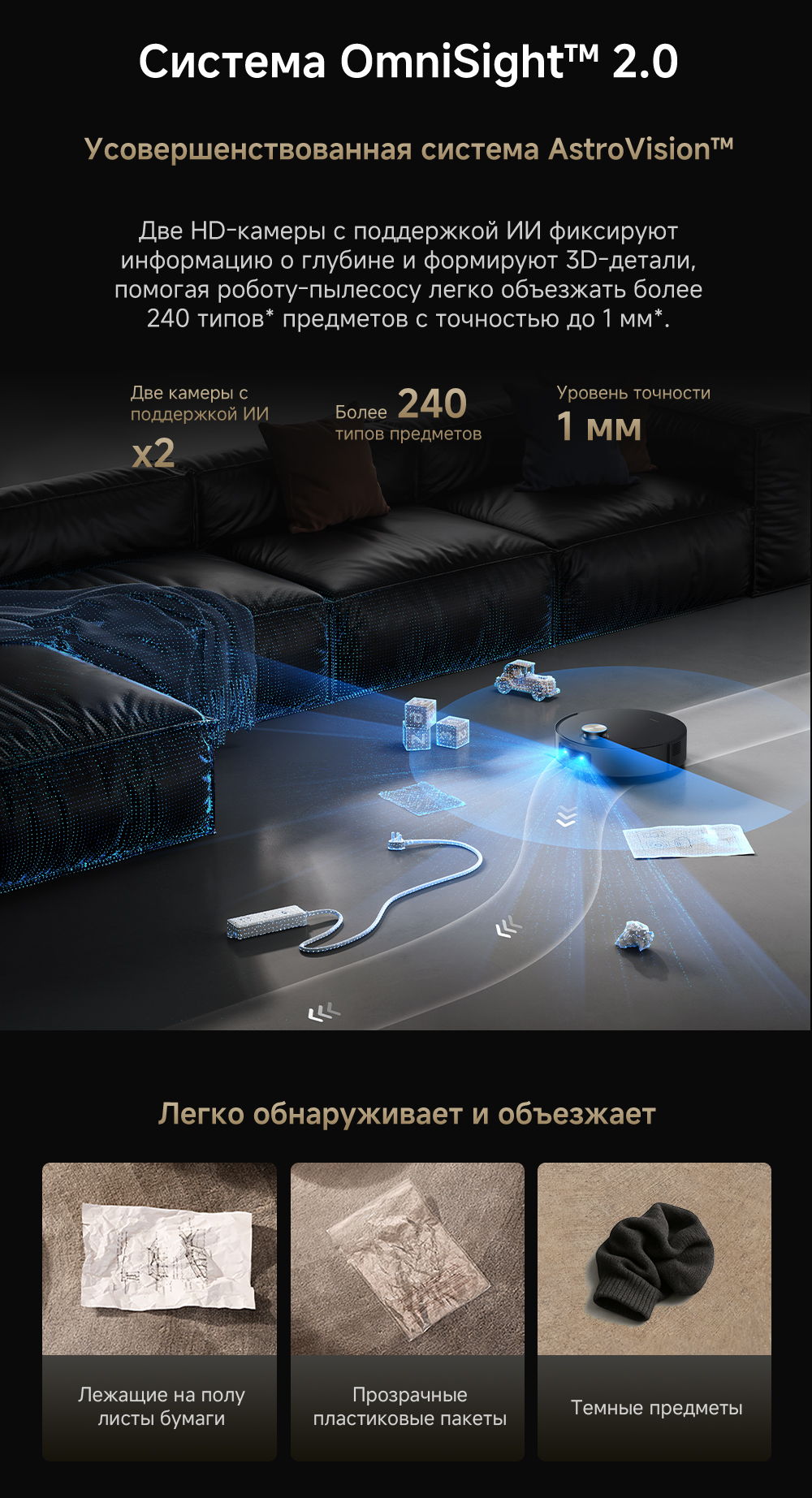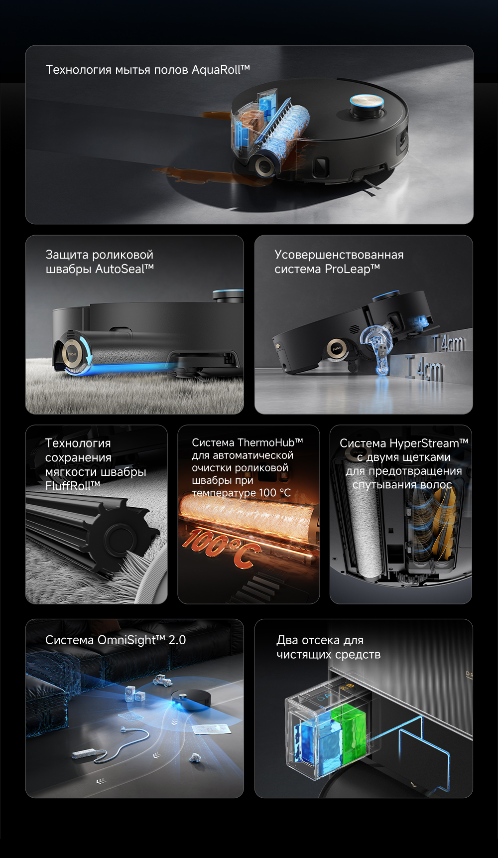 Первый в мире моющий робот-пылесос с технологией AquaRoll, обеспечивающий адаптивную уборку во всем доме. Система Vormax с мощностью всасывания 30 000 Па. Система HyperStream с двумя щётками для предотвращения спутывания волос. Технология мытья полов AquaRoll - система регулировки подачи воды с 12 форсунками, роликовая швабра вращается со скоростью 100 оборотов в минуту, скребок роликовой швабры отжимает грязную воду, которая затем направляется в контейнер для использованной воды, насос высокого давления быстро всасывает грязную воду и подает свежую воду на салфетку для швабры, обеспечивая автоматическую очистку во время мытья полов, чтобы швабра оставалась чистой и готовой к работе. Технология FluffRoll - роликовый модуль для восстановления мягкости швабры располагается за шваброй и вращается в противоположном направлении. Защита роликовой швабры AutoSeal - при заезде на ковры крышка роликовой швабры автоматически закрывается, чтобы предотвратить попадание воды на ковёр. Преодоление порогов высотой до 8 см (двухуровневый порог 4+4 см/одноуровневый порог 4.2 см). Система AstroVision, умный объезд препятствий на базе NVIDIA и обучением - распознавание более 240 типов предметов. Навигация VersaLift - автоматическое поднятие и убирание лидара (высота роботы-пылесоса с опущенным лидаром 9.8 см). Автоматическая очистка швабры на док-станции при температуре 100°C.