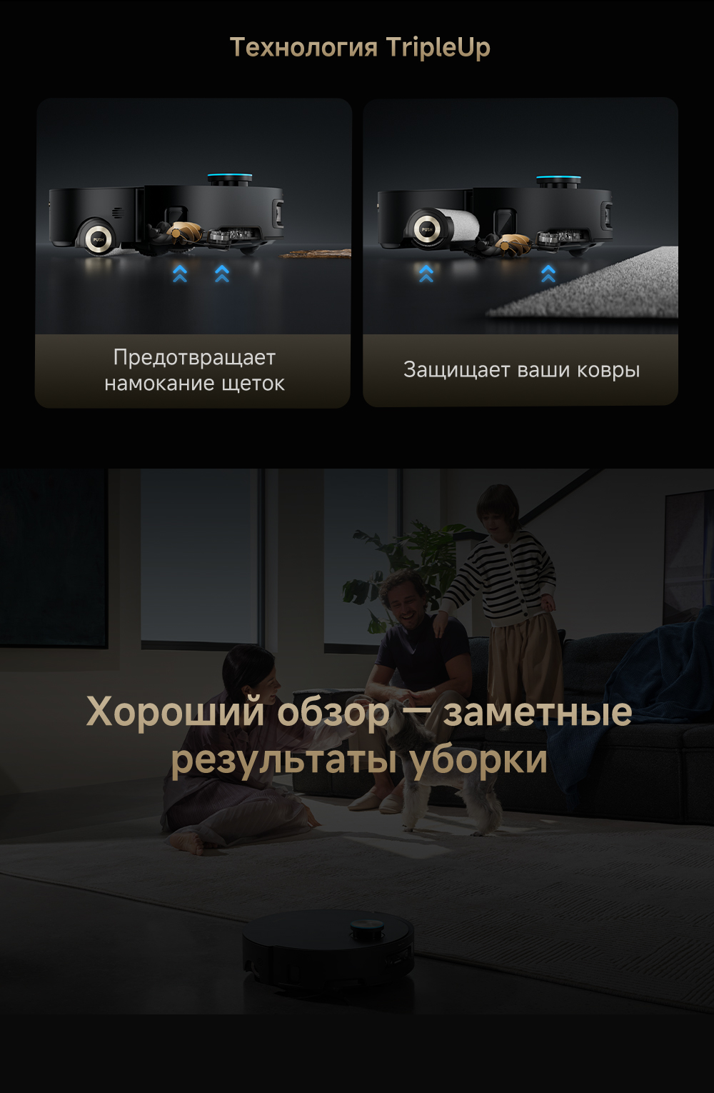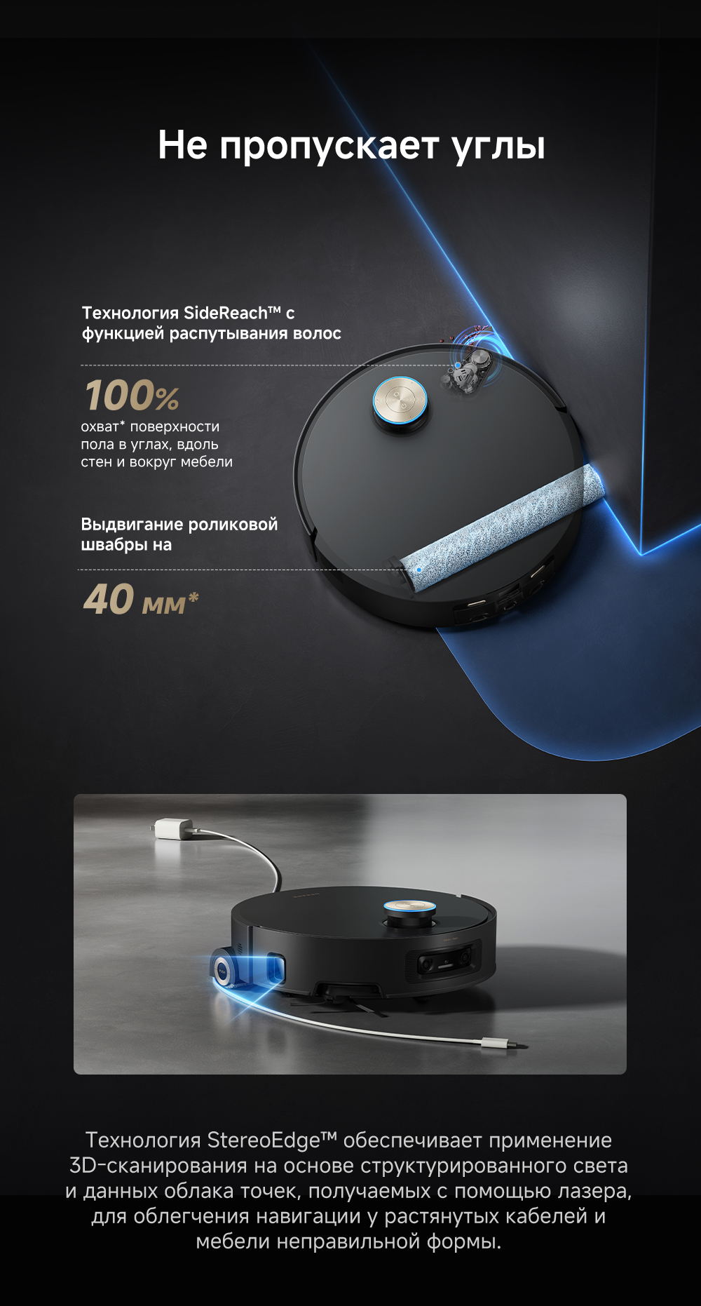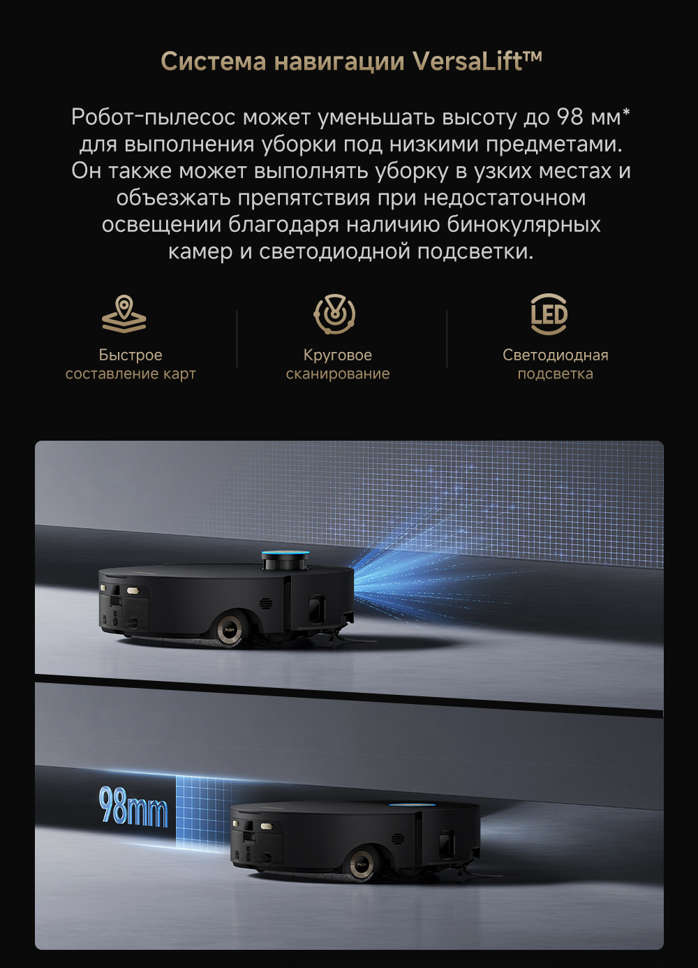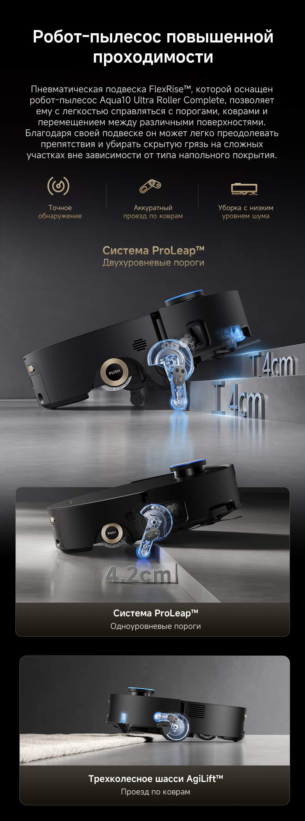 Первый в мире моющий робот-пылесос с технологией AquaRoll, обеспечивающий адаптивную уборку во всем доме. Система Vormax с мощностью всасывания 30 000 Па. Система HyperStream с двумя щётками для предотвращения спутывания волос. Технология мытья полов AquaRoll - система регулировки подачи воды с 12 форсунками, роликовая швабра вращается со скоростью 100 оборотов в минуту, скребок роликовой швабры отжимает грязную воду, которая затем направляется в контейнер для использованной воды, насос высокого давления быстро всасывает грязную воду и подает свежую воду на салфетку для швабры, обеспечивая автоматическую очистку во время мытья полов, чтобы швабра оставалась чистой и готовой к работе. Технология FluffRoll - роликовый модуль для восстановления мягкости швабры располагается за шваброй и вращается в противоположном направлении. Защита роликовой швабры AutoSeal - при заезде на ковры крышка роликовой швабры автоматически закрывается, чтобы предотвратить попадание воды на ковёр. Преодоление порогов высотой до 8 см (двухуровневый порог 4+4 см/одноуровневый порог 4.2 см). Система AstroVision, умный объезд препятствий на базе NVIDIA и обучением - распознавание более 240 типов предметов. Навигация VersaLift - автоматическое поднятие и убирание лидара (высота роботы-пылесоса с опущенным лидаром 9.8 см). Автоматическая очистка швабры на док-станции при температуре 100°C.