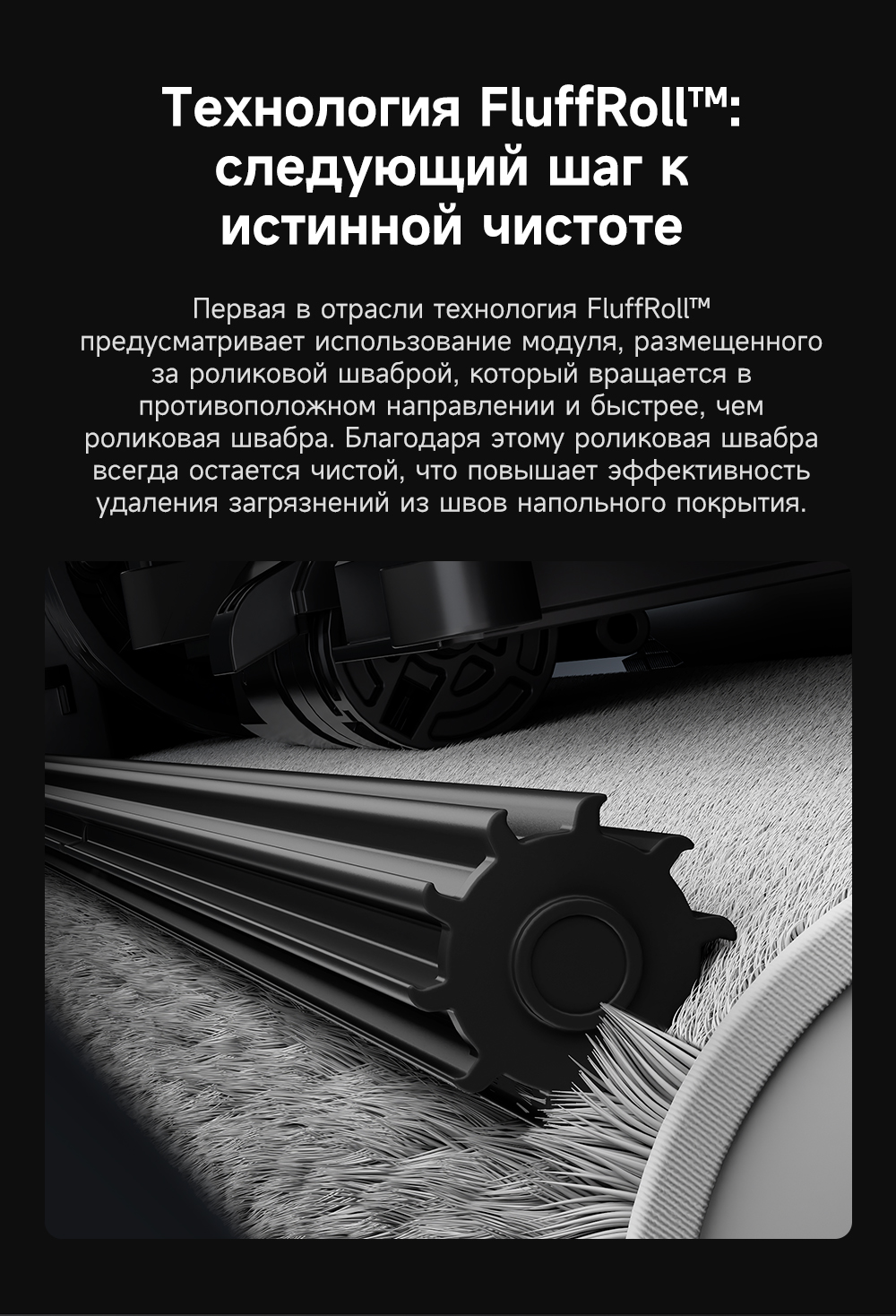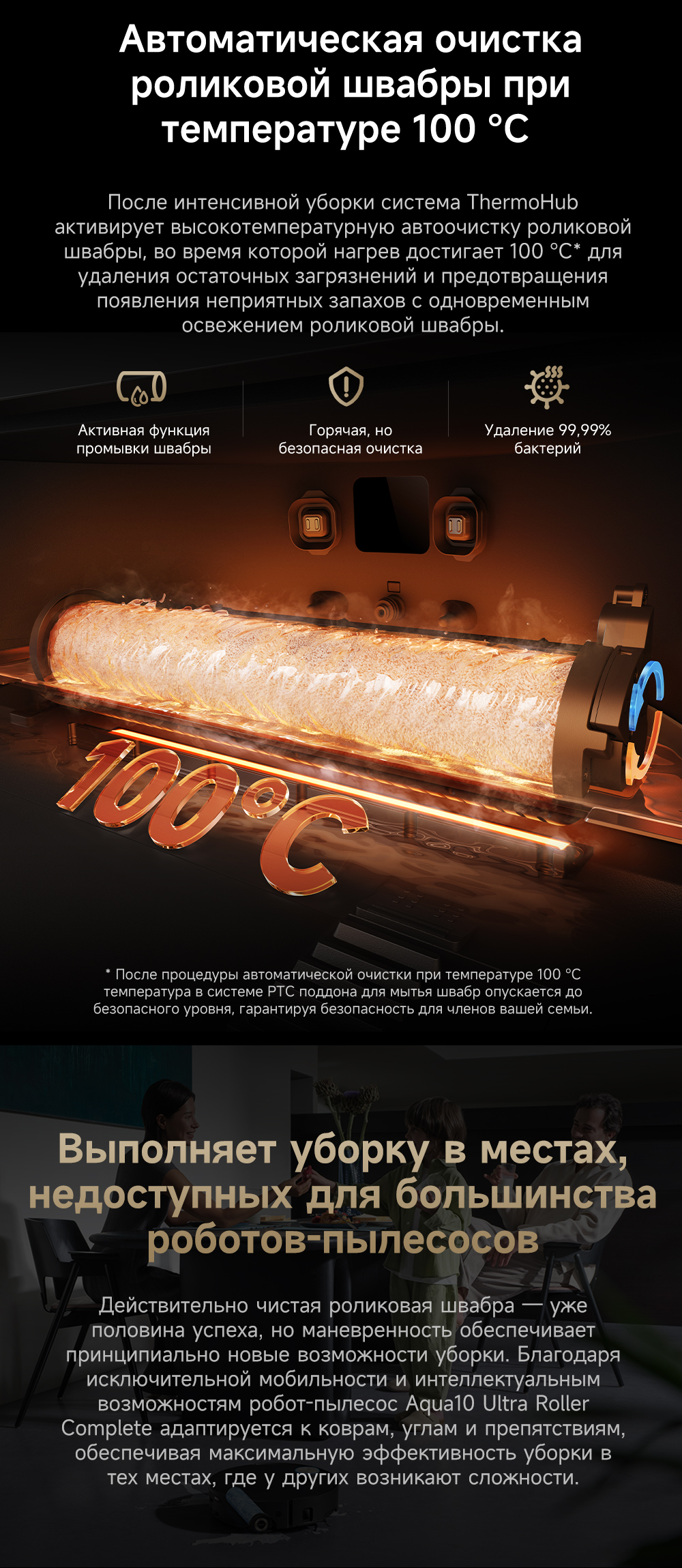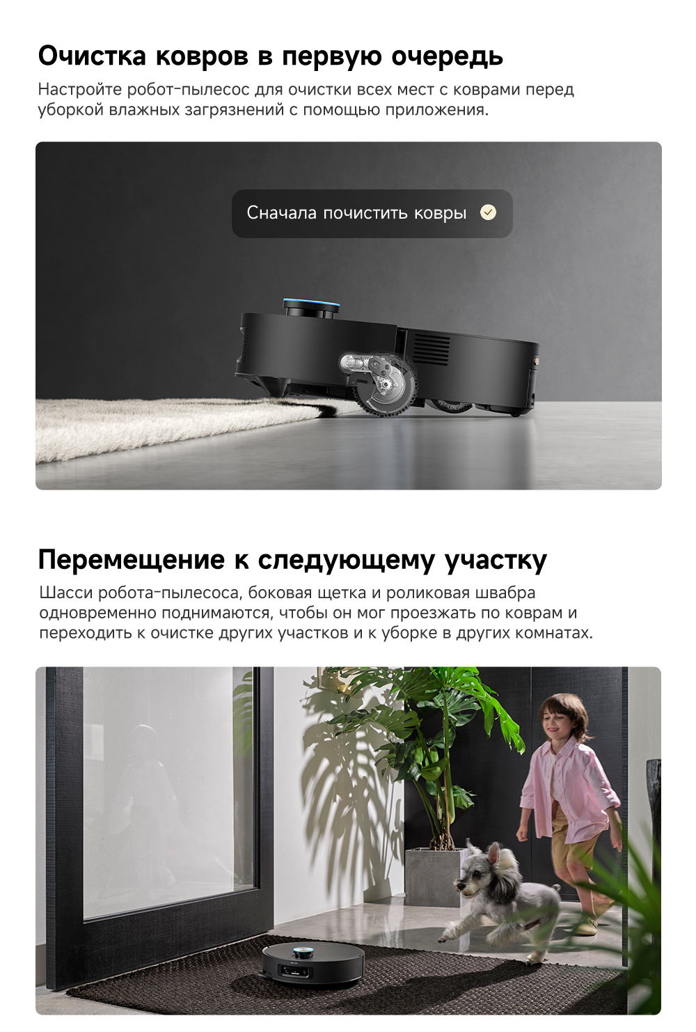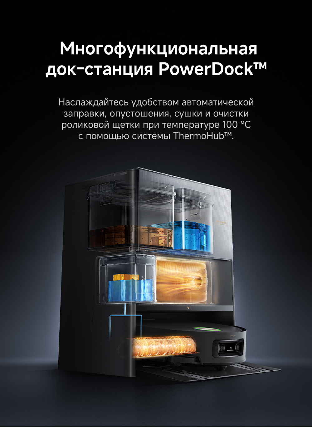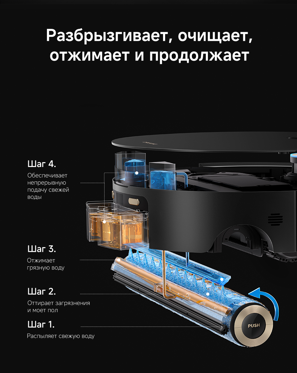 Первый в мире моющий робот-пылесос с технологией AquaRoll, обеспечивающий адаптивную уборку во всем доме. Система Vormax с мощностью всасывания 30 000 Па. Система HyperStream с двумя щётками для предотвращения спутывания волос. Технология мытья полов AquaRoll - система регулировки подачи воды с 12 форсунками, роликовая швабра вращается со скоростью 100 оборотов в минуту, скребок роликовой швабры отжимает грязную воду, которая затем направляется в контейнер для использованной воды, насос высокого давления быстро всасывает грязную воду и подает свежую воду на салфетку для швабры, обеспечивая автоматическую очистку во время мытья полов, чтобы швабра оставалась чистой и готовой к работе. Технология FluffRoll - роликовый модуль для восстановления мягкости швабры располагается за шваброй и вращается в противоположном направлении. Защита роликовой швабры AutoSeal - при заезде на ковры крышка роликовой швабры автоматически закрывается, чтобы предотвратить попадание воды на ковёр. Преодоление порогов высотой до 8 см (двухуровневый порог 4+4 см/одноуровневый порог 4.2 см). Система AstroVision, умный объезд препятствий на базе NVIDIA и обучением - распознавание более 240 типов предметов. Навигация VersaLift - автоматическое поднятие и убирание лидара (высота роботы-пылесоса с опущенным лидаром 9.8 см). Автоматическая очистка швабры на док-станции при температуре 100°C.
