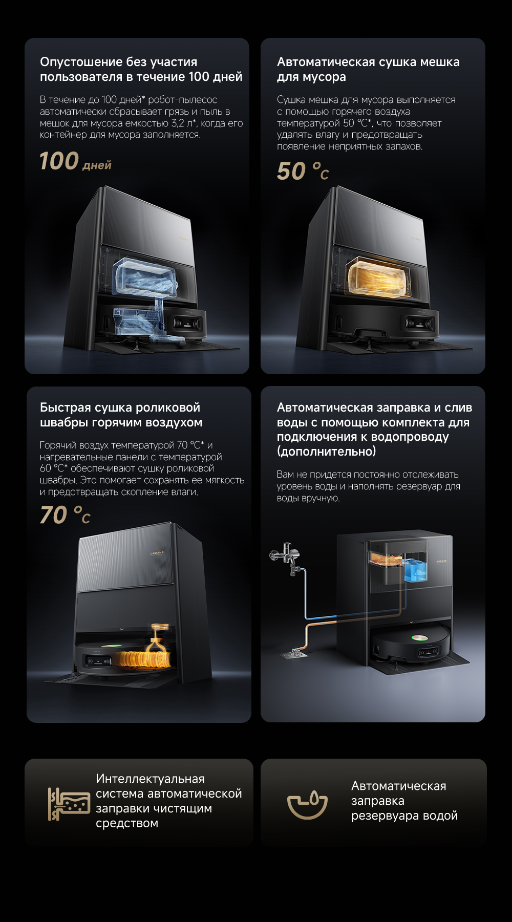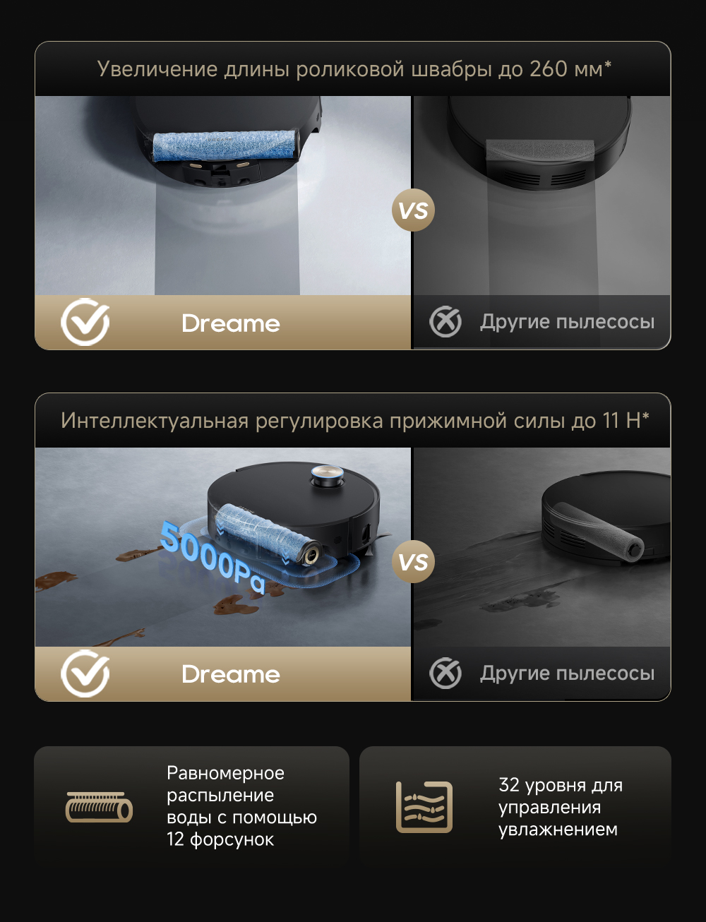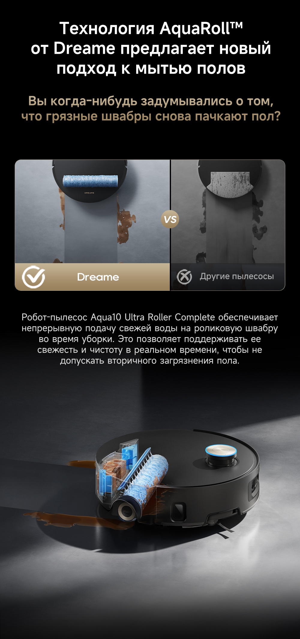 АртикулRLH71DE-1ТипРобот-пылесосСвязанные элементы по цветуВзаимодействие с приложениямиDreamehomeУправлениеCо смартфона / Голосовое / Кнопочное / Через приложениеЁмкость аккумулятора6400 мАчЦветчерныйОсобенностиПервый в мире моющий робот-пылесос с технологией AquaRoll, обеспечивающий адаптивную уборку во всем доме. Система Vormax с мощностью всасывания 30 000 Па. Система HyperStream с двумя щётками для предотвращения спутывания волос. Технология мытья полов AquaRoll - система регулировки подачи воды с 12 форсунками, роликовая швабра вращается со скоростью 100 оборотов в минуту, скребок роликовой швабры отжимает грязную воду, которая затем направляется в контейнер для использованной воды, насос высокого давления быстро всасывает грязную воду и подает свежую воду на салфетку для швабры, обеспечивая автоматическую очистку во время мытья полов, чтобы швабра оставалась чистой и готовой к работе. Технология FluffRoll - роликовый модуль для восстановления мягкости швабры располагается за шваброй и вращается в противоположном направлении. Защита роликовой швабры AutoSeal - при заезде на ковры крышка роликовой швабры автоматически закрывается, чтобы предотвратить попадание воды на ковёр. Преодоление порогов высотой до 8 см (двухуровневый порог 4+4 см/одноуровневый порог 4.2 см). Система AstroVision, умный объезд препятствий на базе NVIDIA и обучением - распознавание более 240 типов предметов. Навигация VersaLift - автоматическое поднятие и убирание лидара (высота роботы-пылесоса с опущенным лидаром 9.8 см). Автоматическая очистка швабры на док-станции при температуре 100°C.СерияAqua - серияТип уборкиВлажная / СухаяГолосовой помощникЕстьМаксимальная мощность всасывания, кПа30ТаймерЕстьПоддержка Wi-FiЕстьУправление с помощью смартфонаЕстьСистема фильтрацииHEPA-фильтрСоставление плана помещенияЕстьРежим самоочисткиЕстьФронтальная камераЕстьУборка ковровЕстьУборка шерсти животныхЕстьОбъем пылесборника, мл220Объем пылесборника док-станции, л3.2Объем контейнера для чистой воды док-станции, л4Объем контейнера для грязной воды, л0.14Тип щёткиEdge-Cleaning Brush Roller / Двойная распутывающая щетка HyperStream™Ограничитель зоны уборкиЕстьОбъем контейнера для грязной воды док-станции, л3.5Подключение к водопроводу и канализацииДа (Комплект для подключения приобретается отдельно)Рабочая частота100-240 В / 50-60 ГцОбъем контейнера для чистой воды, л0.1КомплектацияРобот-пылесос, базовая станция, инструмент для очистки, руководство пользователя, блок швабры (предварительно установленный), мешок для мусора 2 шт. (предварительно установленный 1 шт.), фильтр поддона для мытья швабр (предварительно установленный 1 шт.), рампа базовой станции, средство для устранения запаха домашних животных. Дополнительный комплект аксессуаров: щётка HyperStream (основная), боковые щётки 2 шт., фильтр 3 шт., мешок для мусора 3 шт., роликовая швабра, чистящее средство 1л.ДвигательБесщеточныйСкорость мотора, об/мин1000ПодсказкиЕстьМодельAqua10 Ultra Roller Complete BlackВлажный тип уборкиДаМинимальная цена со скидкой5499Краткое наименованиеAqua10 Ultra Roller CompleteНавигационная системаVersaLift (опускающийся LiDar): LDS AI + 3DГабаритыБазовая станция 42х44х50.5 см, робот-пылесос 35х35х9.8 смВесБазовая станция 11.1 кг, робот-пылесос 5.8 кгИзготовительDreame Trading (Tianjin) Co. Ltd., Китай, Room 2112-1-1, South District, Finance and Trade Center, No.6975 Yazhou Road, Dongjiang Bonded Port Area, Tianjin Pilot Free Trade Zone, TianjinИмпортерООО "АйТи Дистрибуция", 2230