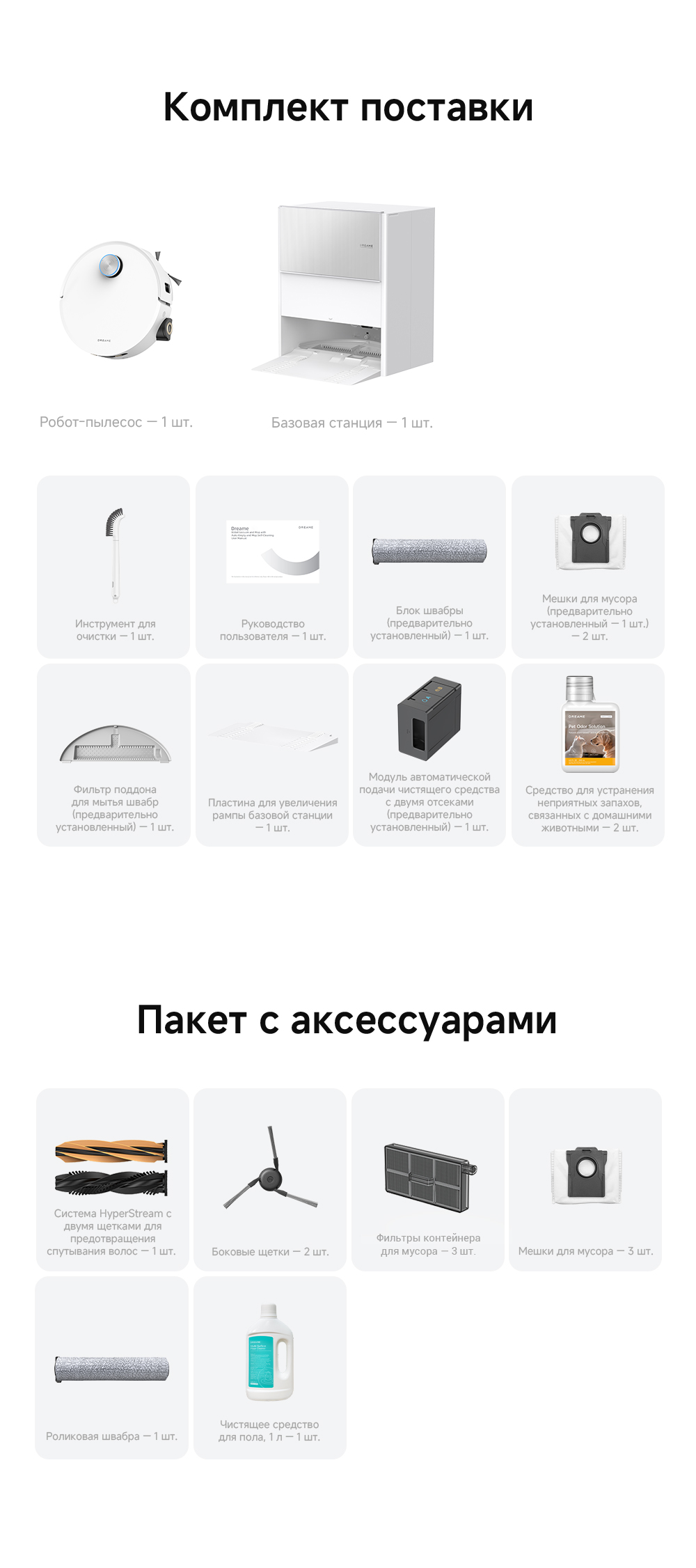 Робот-пылесос, базовая станция, инструмент для очистки, руководство пользователя, блок швабры (предварительно установленный), мешок для мусора 2 шт. (предварительно установленный 1 шт.), фильтр поддона для мытья швабр (предварительно установленный 1 шт.), рампа базовой станции, средство для устранения запаха домашних животных. Дополнительный комплект аксессуаров: щётка HyperStream (основная), боковые щётки 2 шт., фильтр 3 шт., мешок для мусора 3 шт., роликовая швабра, чистящее средство 1л.