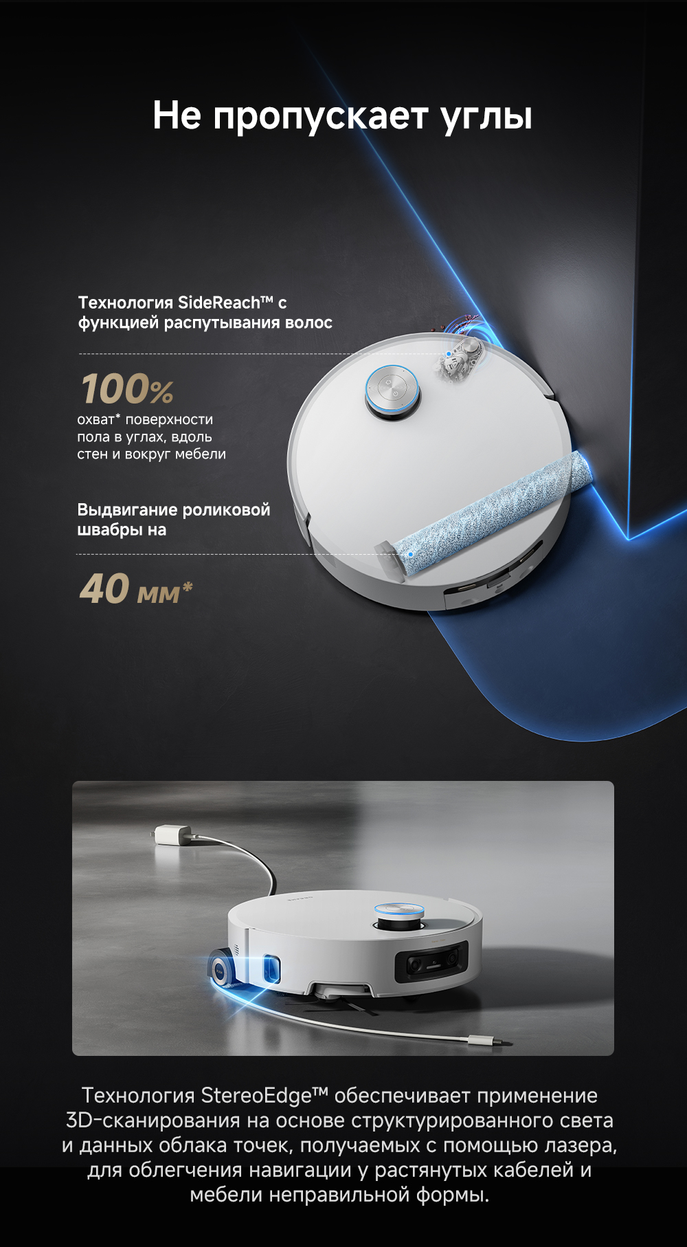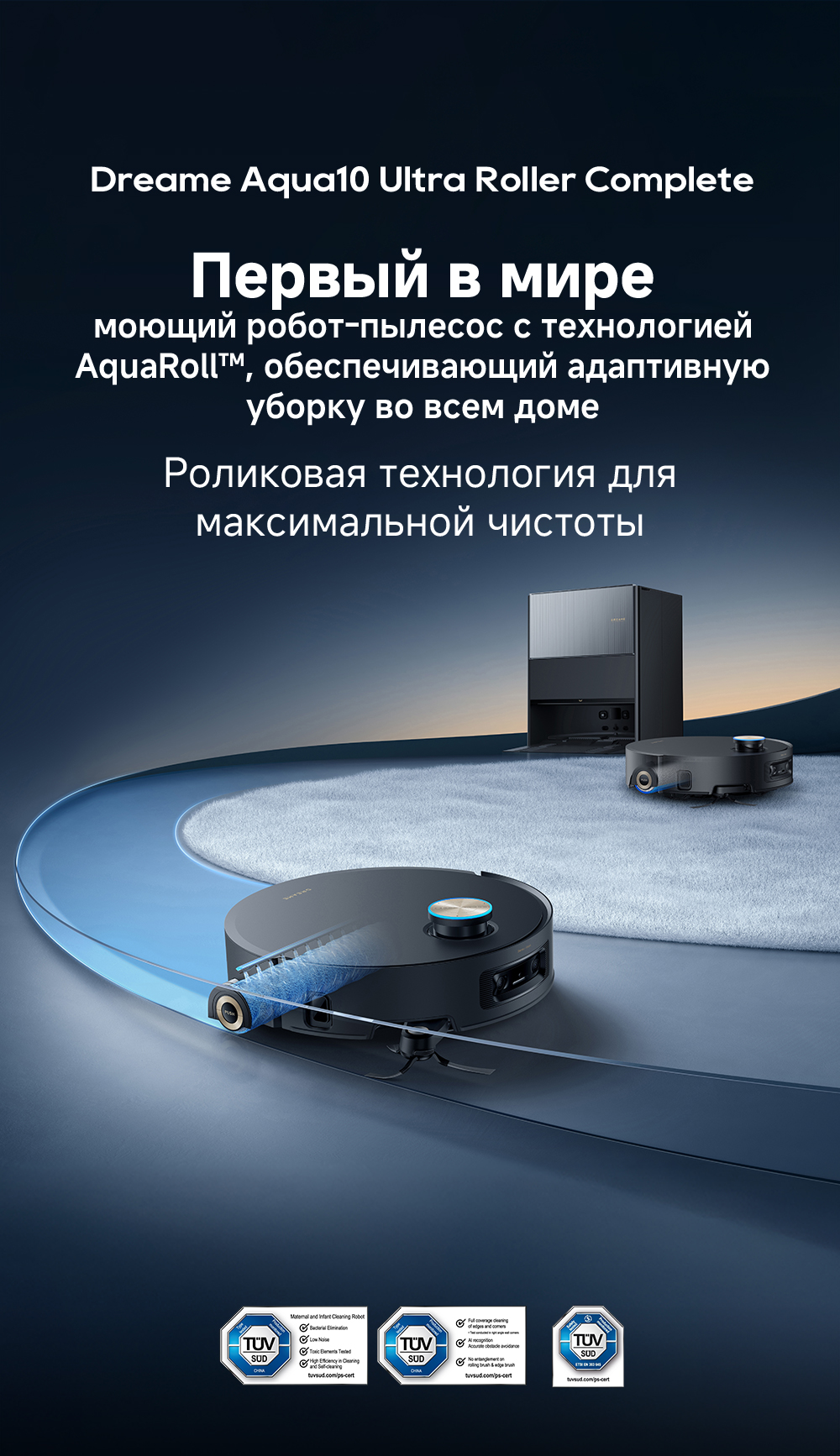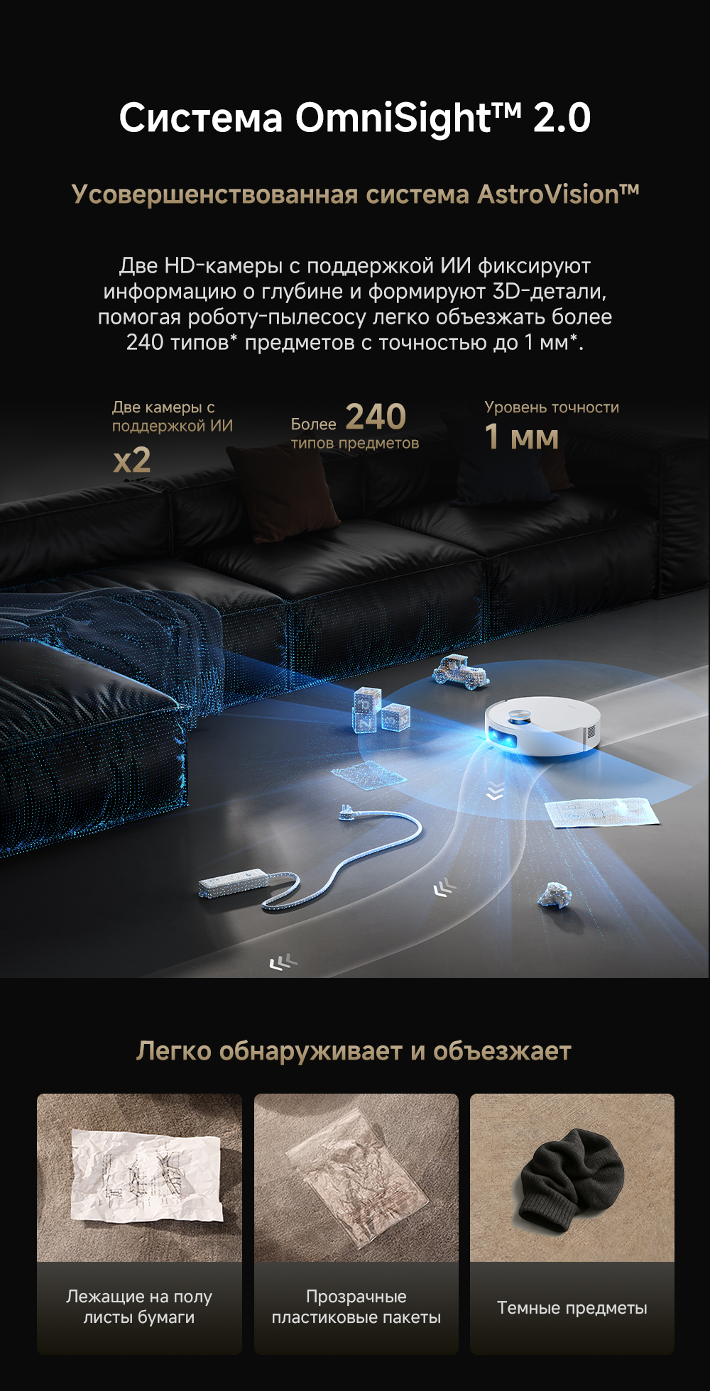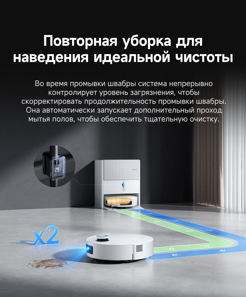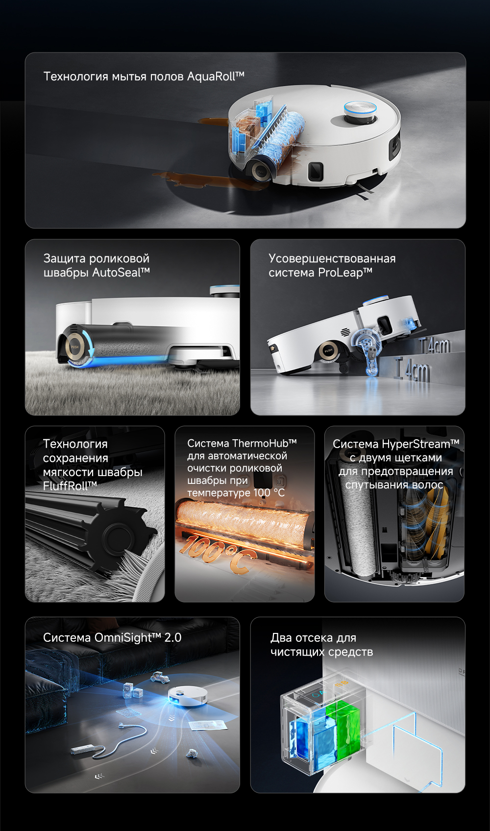 Первый в мире моющий робот-пылесос с технологией AquaRoll, обеспечивающий адаптивную уборку во всем доме. Система Vormax с мощностью всасывания 30 000 Па. Система HyperStream с двумя щётками для предотвращения спутывания волос. Технология мытья полов AquaRoll - система регулировки подачи воды с 12 форсунками, роликовая швабра вращается со скоростью 100 оборотов в минуту, скребок роликовой швабры отжимает грязную воду, которая затем направляется в контейнер для использованной воды, насос высокого давления быстро всасывает грязную воду и подает свежую воду на салфетку для швабры, обеспечивая автоматическую очистку во время мытья полов, чтобы швабра оставалась чистой и готовой к работе. Технология FluffRoll - роликовый модуль для восстановления мягкости швабры располагается за шваброй и вращается в противоположном направлении. Защита роликовой швабры AutoSeal - при заезде на ковры крышка роликовой швабры автоматически закрывается, чтобы предотвратить попадание воды на ковёр. Преодоление порогов высотой до 8 см (двухуровневый порог 4+4 см/одноуровневый порог 4.2 см). Система AstroVision, умный объезд препятствий на базе NVIDIA и обучением - распознавание более 240 типов предметов. Навигация VersaLift - автоматическое поднятие и убирание лидара (высота роботы-пылесоса с опущенным лидаром 9.8 см). Автоматическая очистка швабры на док-станции при температуре 100°C.