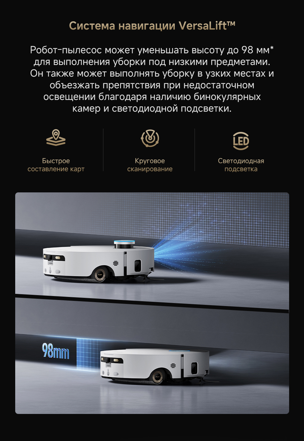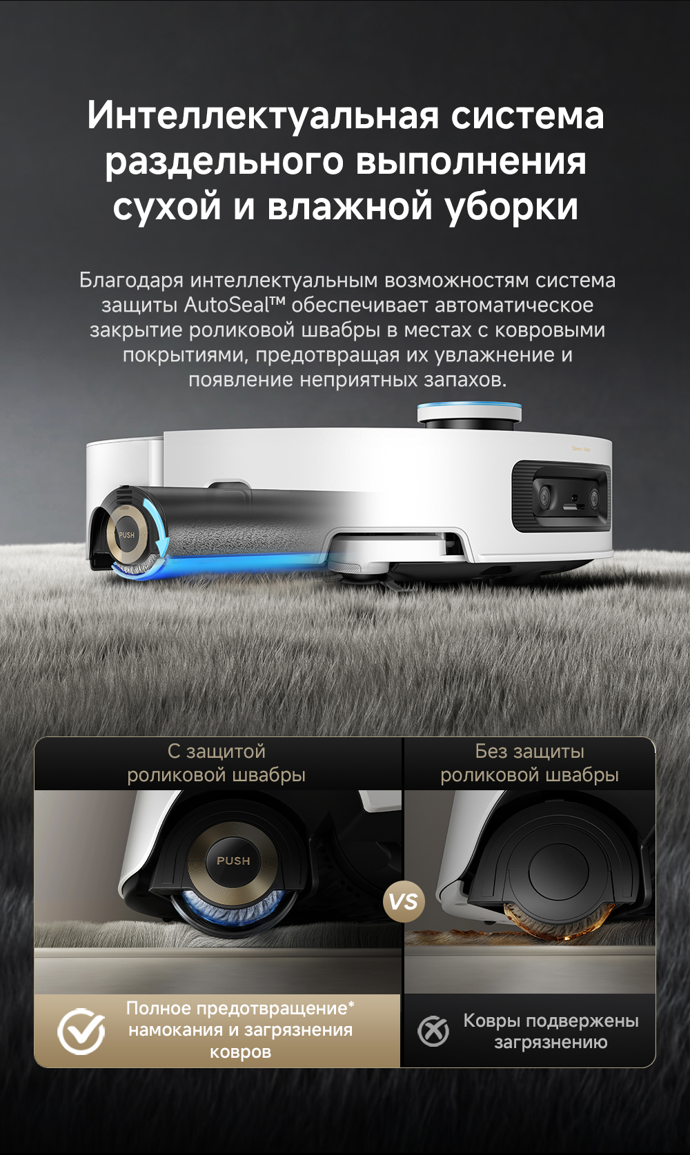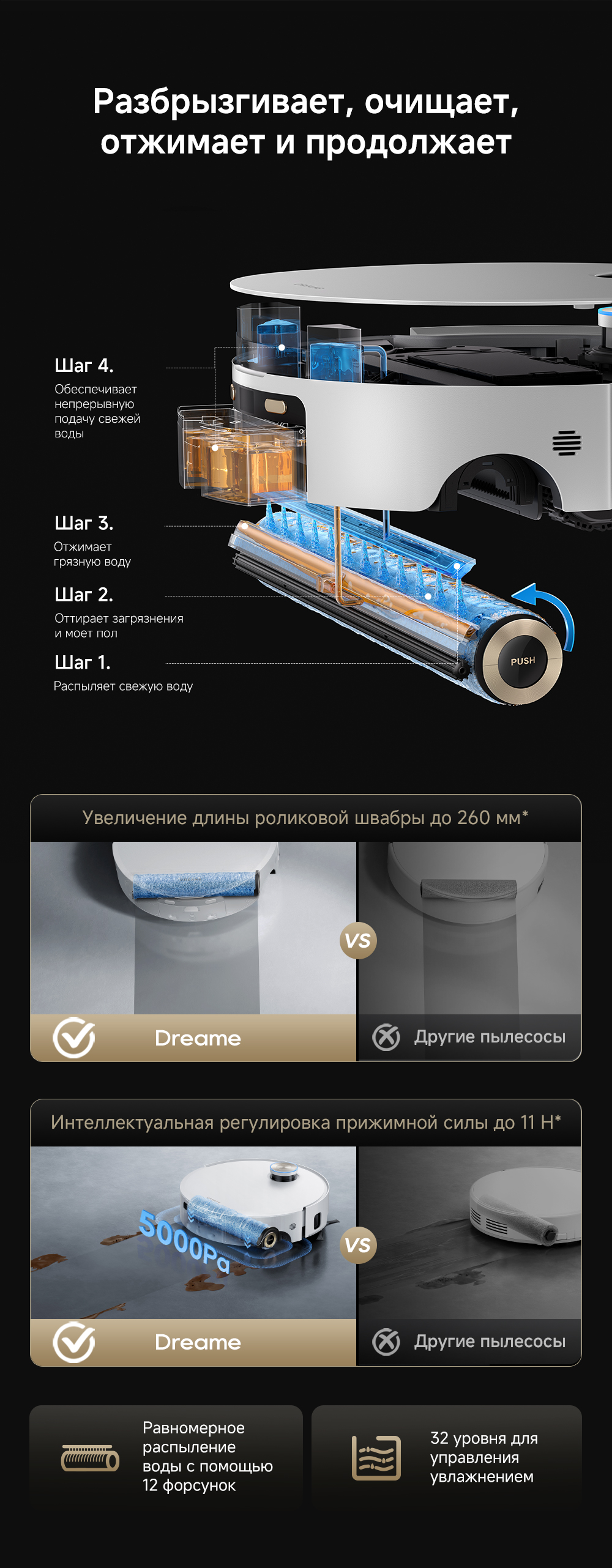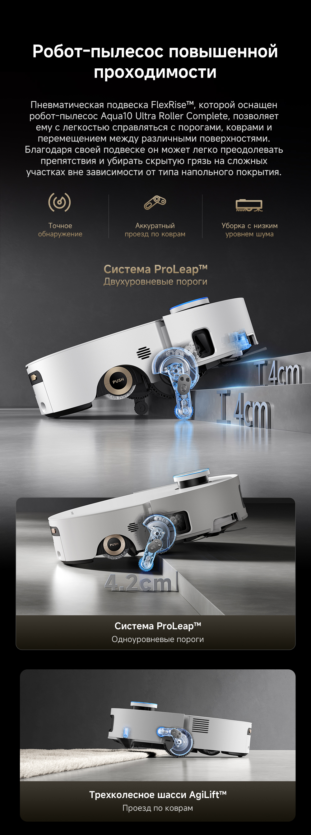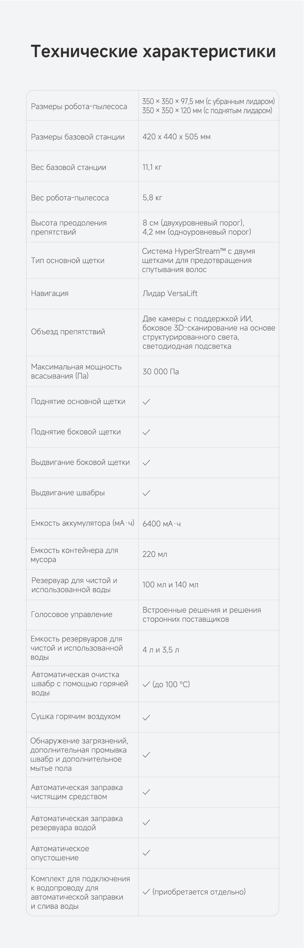 Первый в мире моющий робот-пылесос с технологией AquaRoll, обеспечивающий адаптивную уборку во всем доме. Система Vormax с мощностью всасывания 30 000 Па. Система HyperStream с двумя щётками для предотвращения спутывания волос. Технология мытья полов AquaRoll - система регулировки подачи воды с 12 форсунками, роликовая швабра вращается со скоростью 100 оборотов в минуту, скребок роликовой швабры отжимает грязную воду, которая затем направляется в контейнер для использованной воды, насос высокого давления быстро всасывает грязную воду и подает свежую воду на салфетку для швабры, обеспечивая автоматическую очистку во время мытья полов, чтобы швабра оставалась чистой и готовой к работе. Технология FluffRoll - роликовый модуль для восстановления мягкости швабры располагается за шваброй и вращается в противоположном направлении. Защита роликовой швабры AutoSeal - при заезде на ковры крышка роликовой швабры автоматически закрывается, чтобы предотвратить попадание воды на ковёр. Преодоление порогов высотой до 8 см (двухуровневый порог 4+4 см/одноуровневый порог 4.2 см). Система AstroVision, умный объезд препятствий на базе NVIDIA и обучением - распознавание более 240 типов предметов. Навигация VersaLift - автоматическое поднятие и убирание лидара (высота роботы-пылесоса с опущенным лидаром 9.8 см). Автоматическая очистка швабры на док-станции при температуре 100°C.