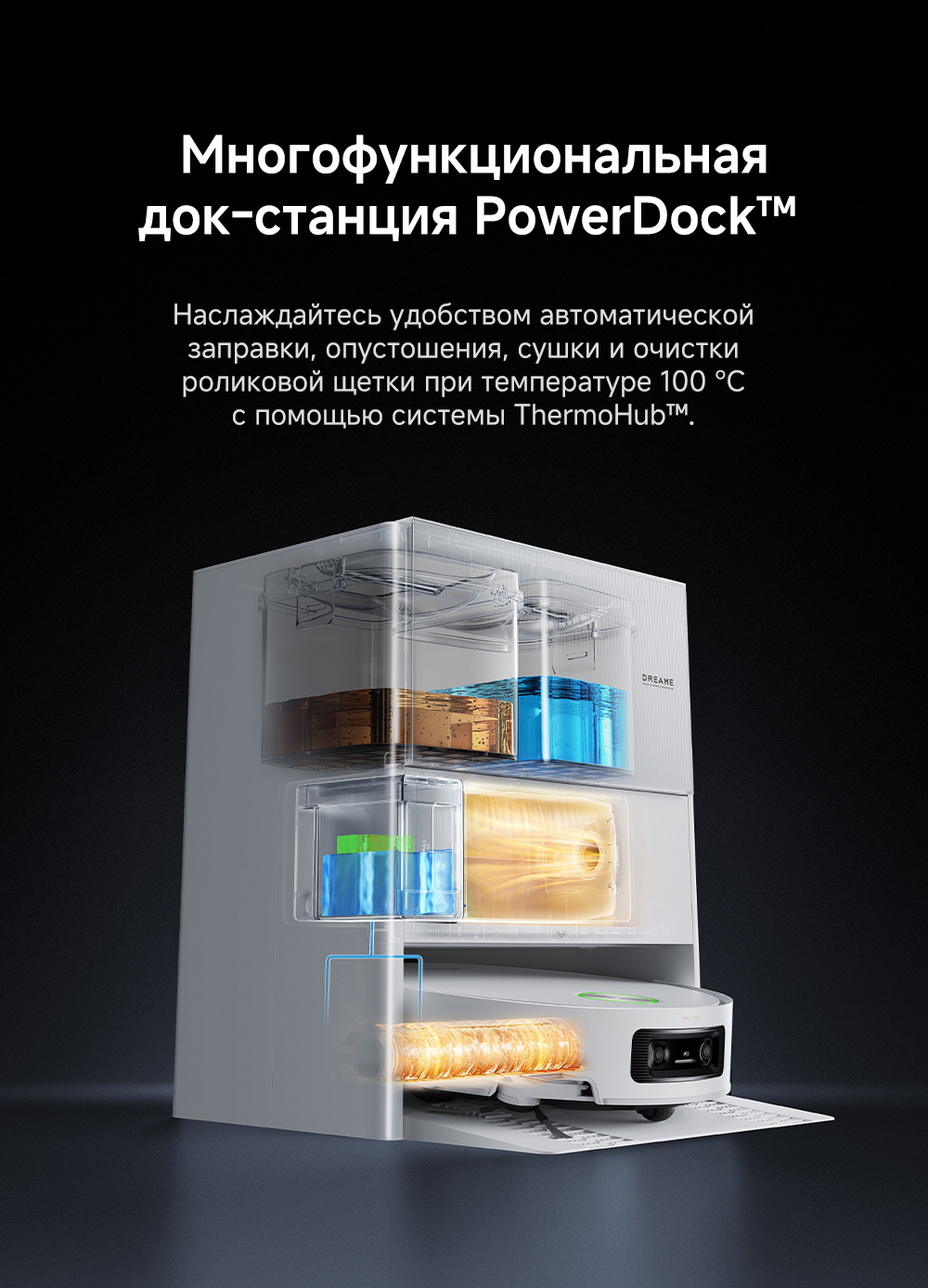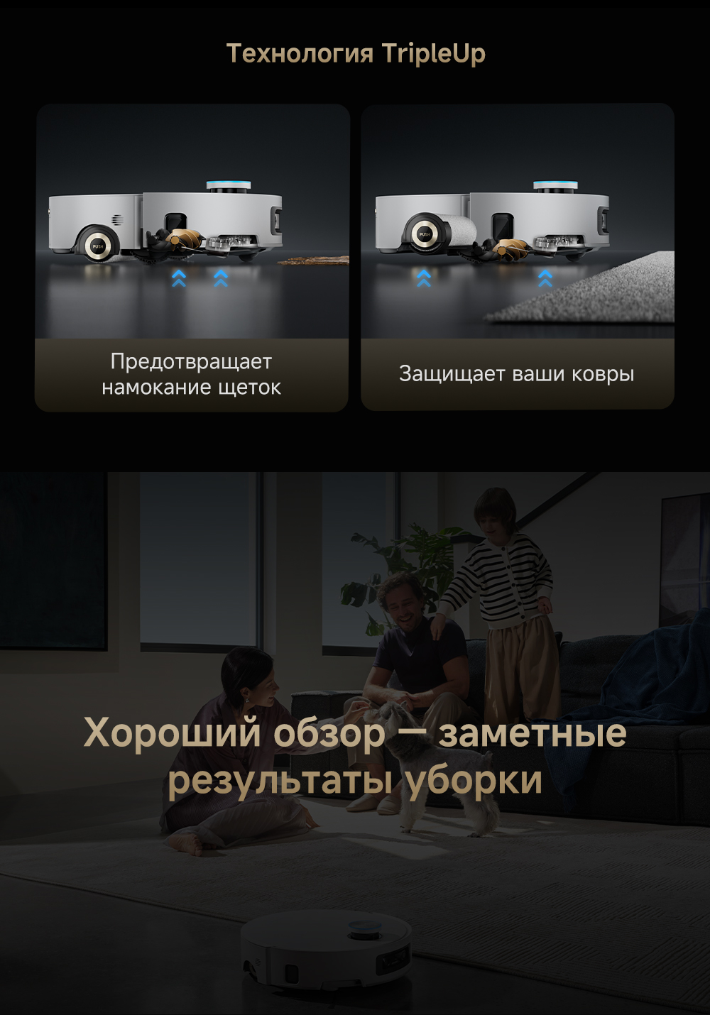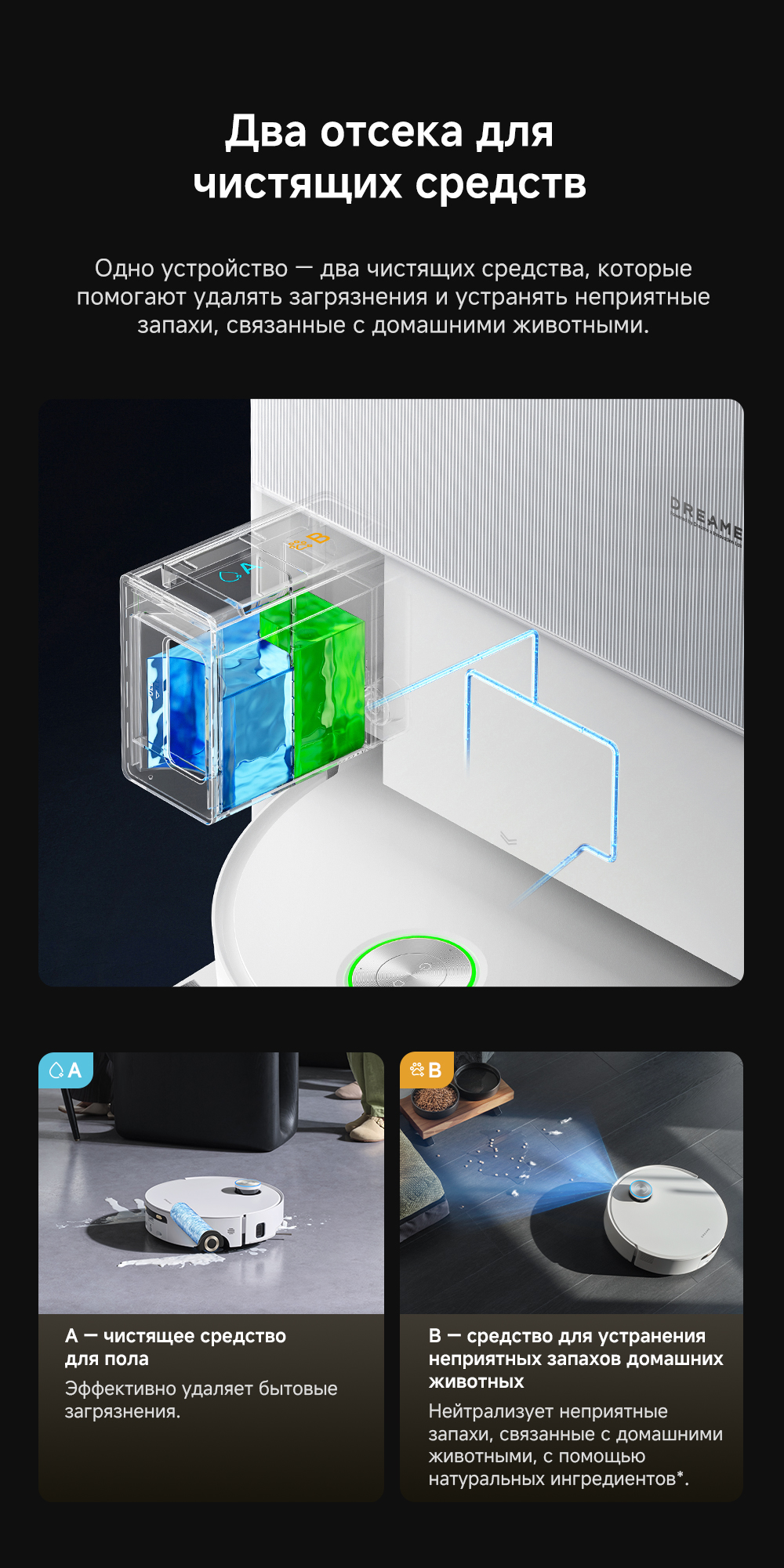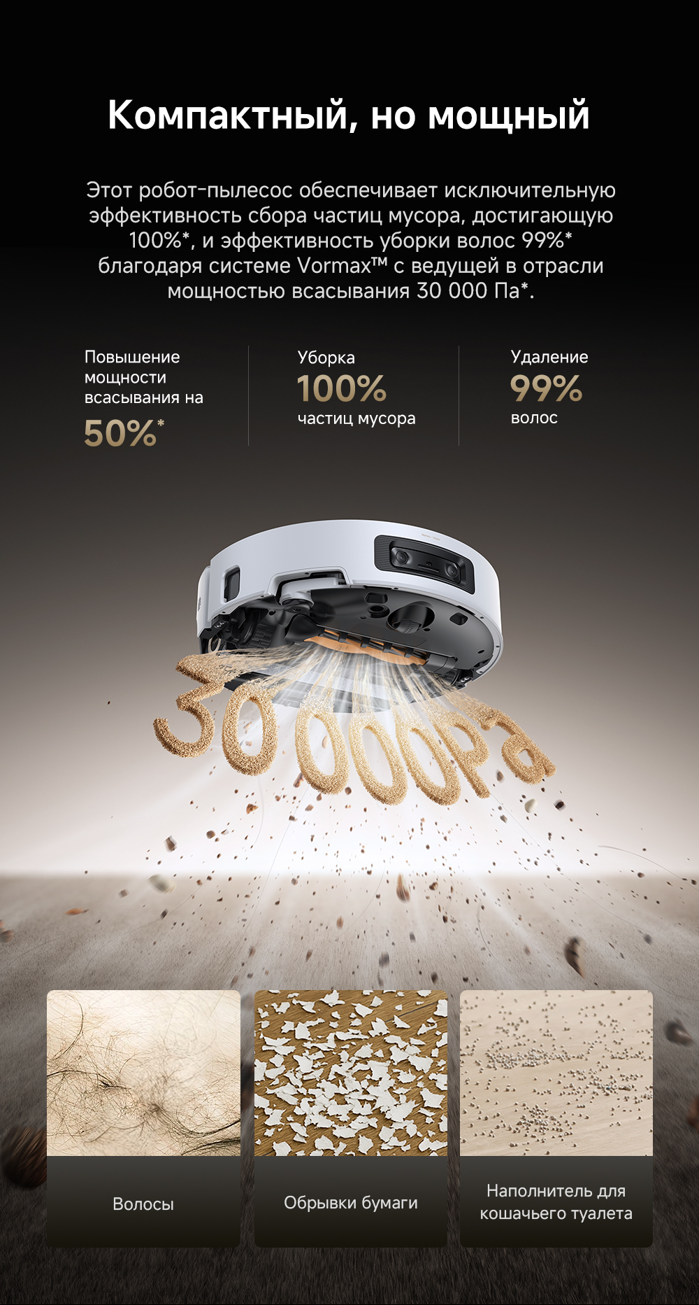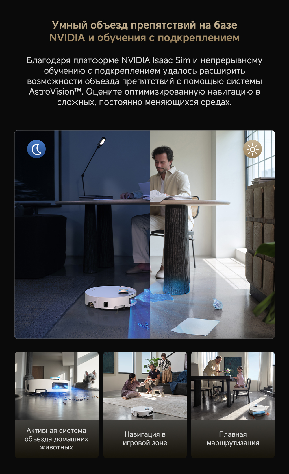 Первый в мире моющий робот-пылесос с технологией AquaRoll, обеспечивающий адаптивную уборку во всем доме. Система Vormax с мощностью всасывания 30 000 Па. Система HyperStream с двумя щётками для предотвращения спутывания волос. Технология мытья полов AquaRoll - система регулировки подачи воды с 12 форсунками, роликовая швабра вращается со скоростью 100 оборотов в минуту, скребок роликовой швабры отжимает грязную воду, которая затем направляется в контейнер для использованной воды, насос высокого давления быстро всасывает грязную воду и подает свежую воду на салфетку для швабры, обеспечивая автоматическую очистку во время мытья полов, чтобы швабра оставалась чистой и готовой к работе. Технология FluffRoll - роликовый модуль для восстановления мягкости швабры располагается за шваброй и вращается в противоположном направлении. Защита роликовой швабры AutoSeal - при заезде на ковры крышка роликовой швабры автоматически закрывается, чтобы предотвратить попадание воды на ковёр. Преодоление порогов высотой до 8 см (двухуровневый порог 4+4 см/одноуровневый порог 4.2 см). Система AstroVision, умный объезд препятствий на базе NVIDIA и обучением - распознавание более 240 типов предметов. Навигация VersaLift - автоматическое поднятие и убирание лидара (высота роботы-пылесоса с опущенным лидаром 9.8 см). Автоматическая очистка швабры на док-станции при температуре 100°C.