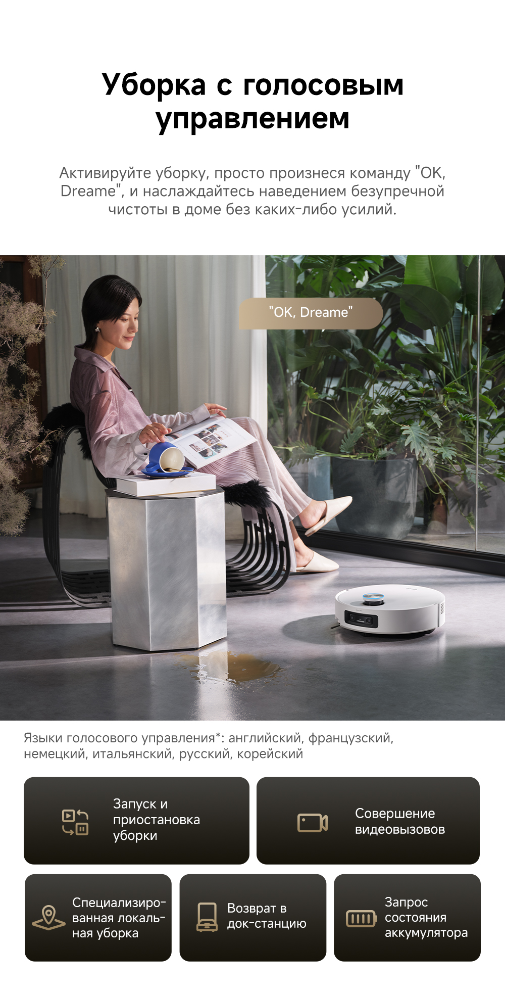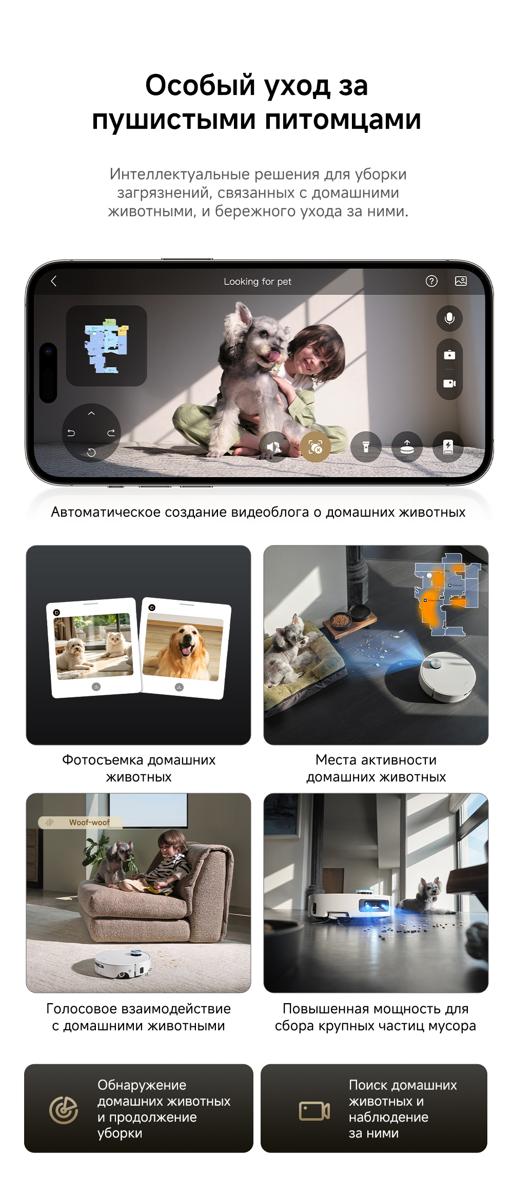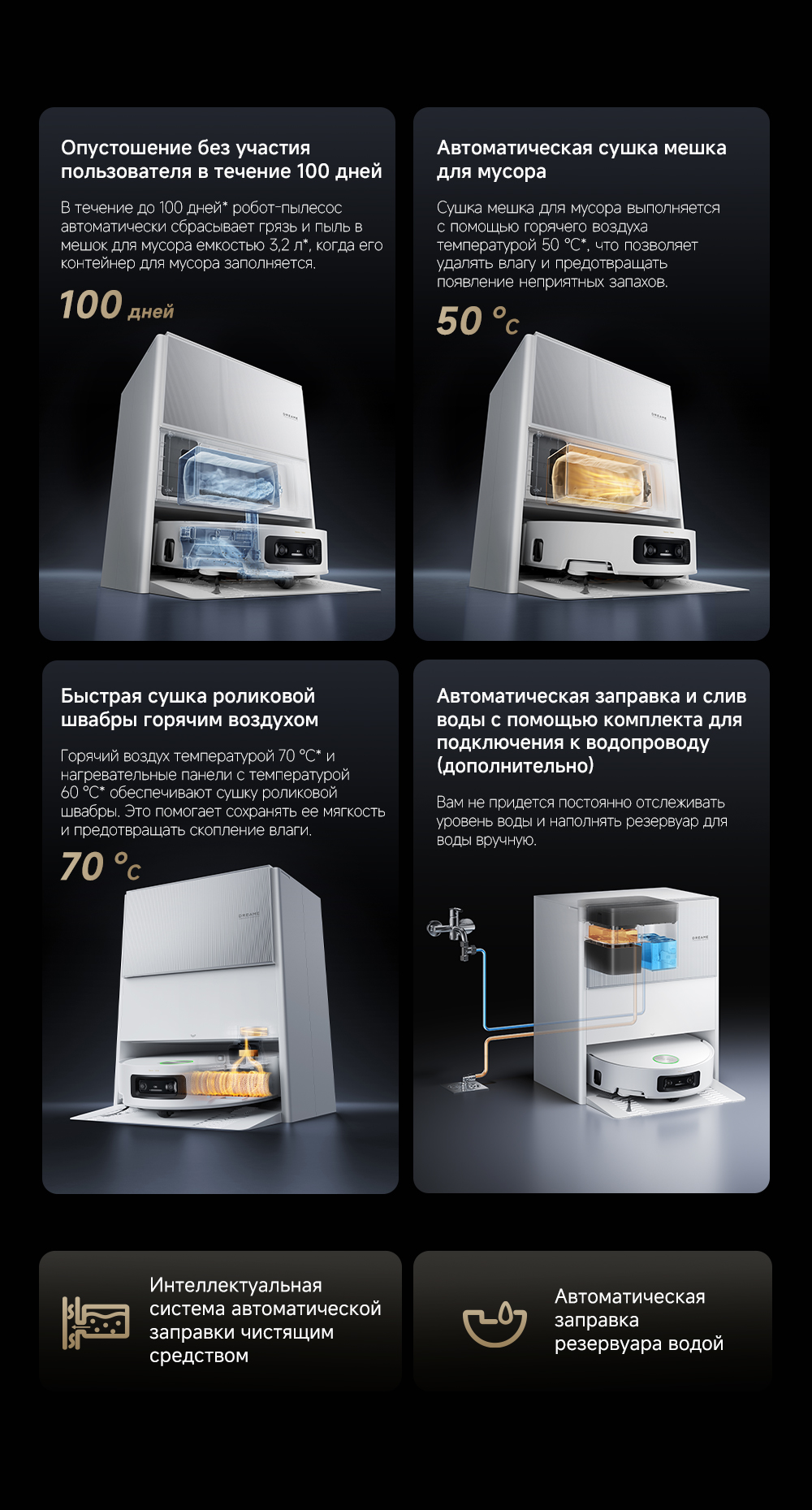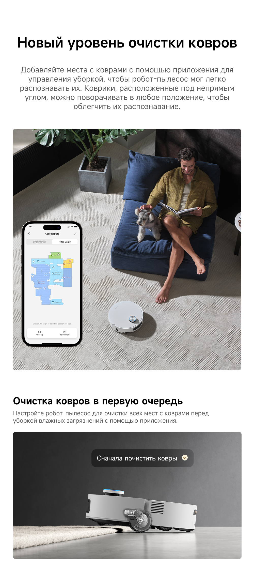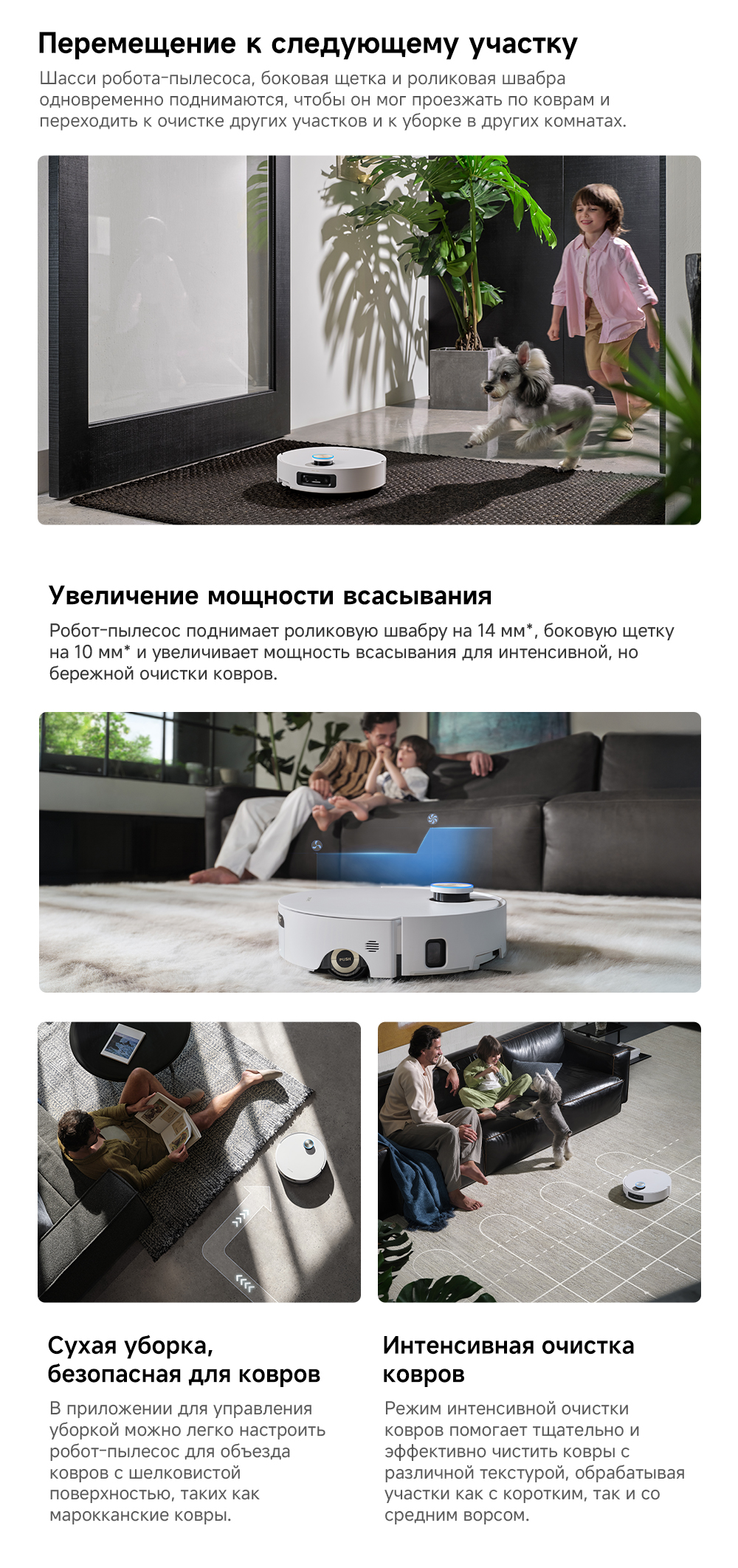 Первый в мире моющий робот-пылесос с технологией AquaRoll, обеспечивающий адаптивную уборку во всем доме. Система Vormax с мощностью всасывания 30 000 Па. Система HyperStream с двумя щётками для предотвращения спутывания волос. Технология мытья полов AquaRoll - система регулировки подачи воды с 12 форсунками, роликовая швабра вращается со скоростью 100 оборотов в минуту, скребок роликовой швабры отжимает грязную воду, которая затем направляется в контейнер для использованной воды, насос высокого давления быстро всасывает грязную воду и подает свежую воду на салфетку для швабры, обеспечивая автоматическую очистку во время мытья полов, чтобы швабра оставалась чистой и готовой к работе. Технология FluffRoll - роликовый модуль для восстановления мягкости швабры располагается за шваброй и вращается в противоположном направлении. Защита роликовой швабры AutoSeal - при заезде на ковры крышка роликовой швабры автоматически закрывается, чтобы предотвратить попадание воды на ковёр. Преодоление порогов высотой до 8 см (двухуровневый порог 4+4 см/одноуровневый порог 4.2 см). Система AstroVision, умный объезд препятствий на базе NVIDIA и обучением - распознавание более 240 типов предметов. Навигация VersaLift - автоматическое поднятие и убирание лидара (высота роботы-пылесоса с опущенным лидаром 9.8 см). Автоматическая очистка швабры на док-станции при температуре 100°C.