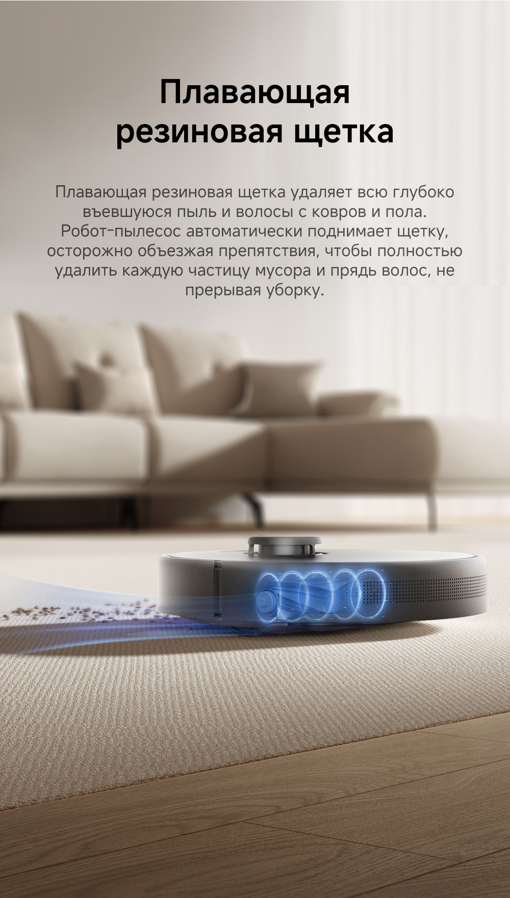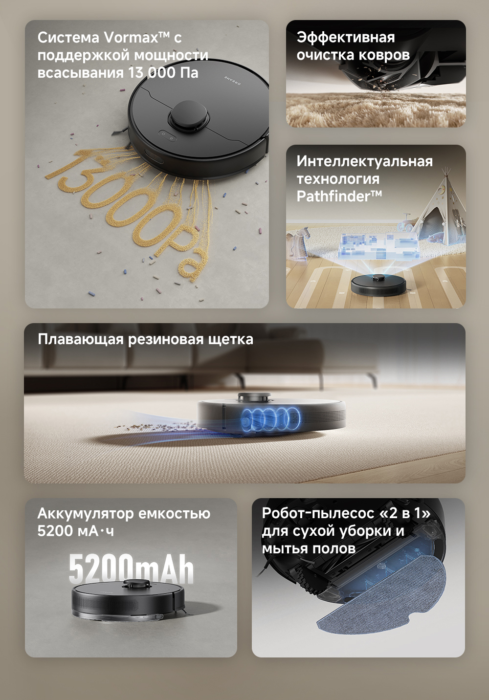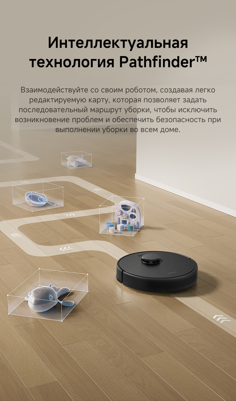 Плавающая основная щётка эффективно убирает пыль и шерсть с ковров и твёрдых напольных покрытий. Быстрое составление карт, интеллектуальная система навигации Pathfinder. Автоматическая регулировка мощности всасывания на коврах.