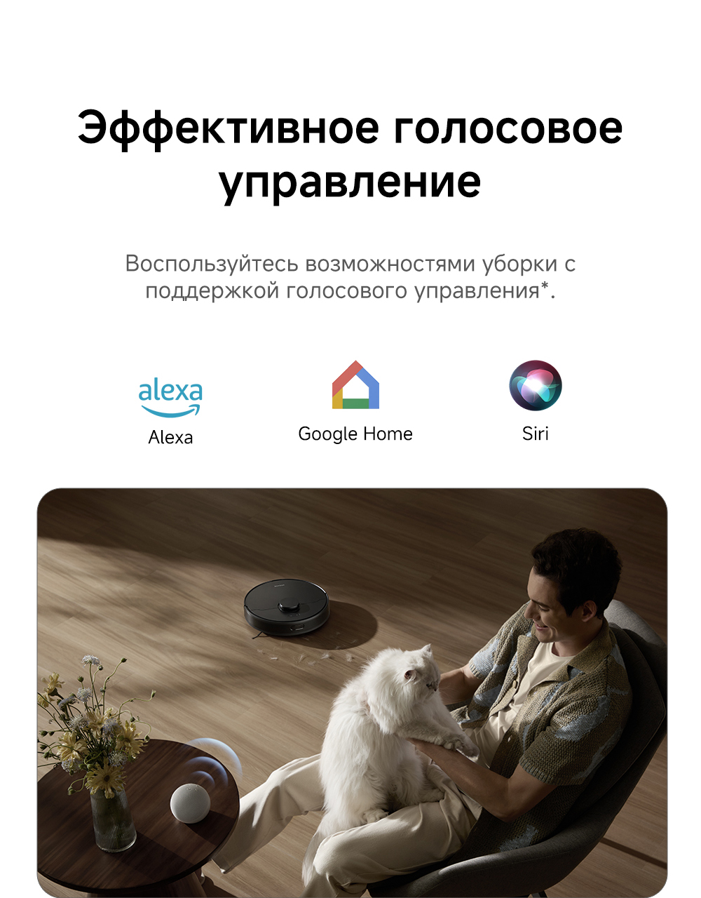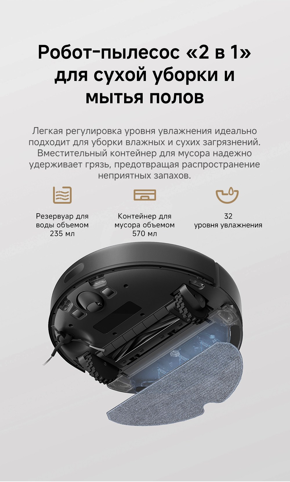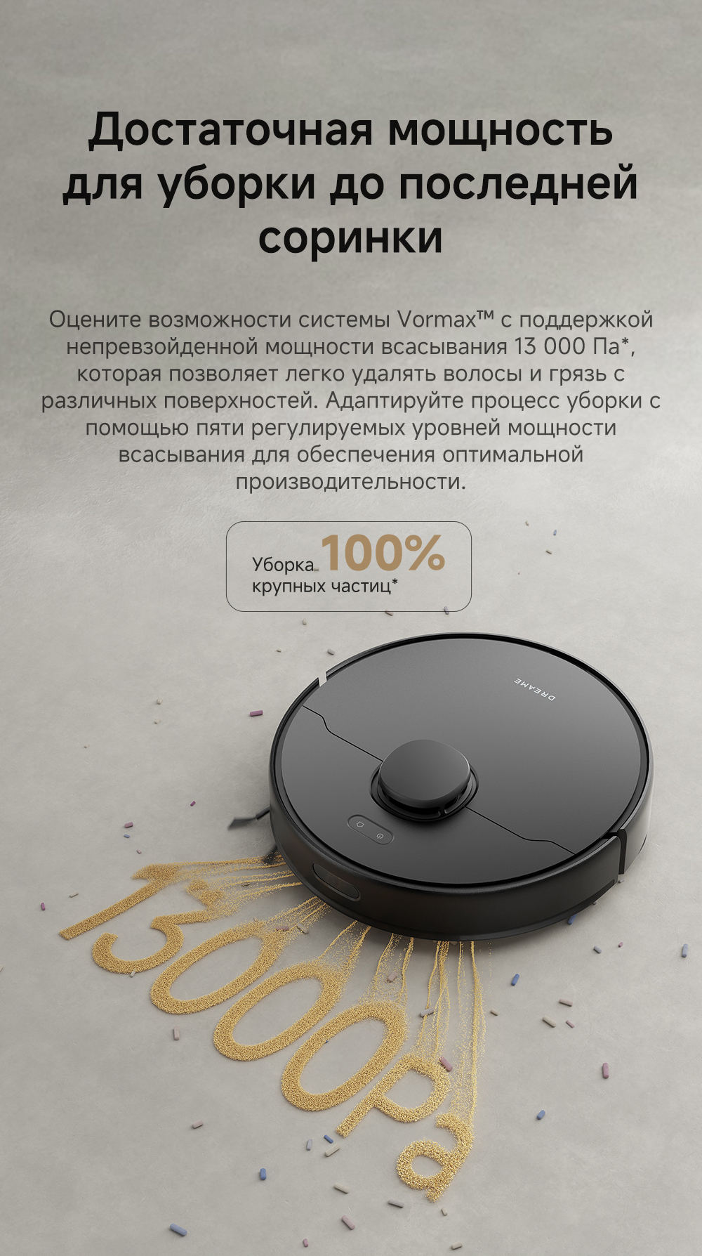 Плавающая основная щётка эффективно убирает пыль и шерсть с ковров и твёрдых напольных покрытий. Быстрое составление карт, интеллектуальная система навигации Pathfinder. Автоматическая регулировка мощности всасывания на коврах.