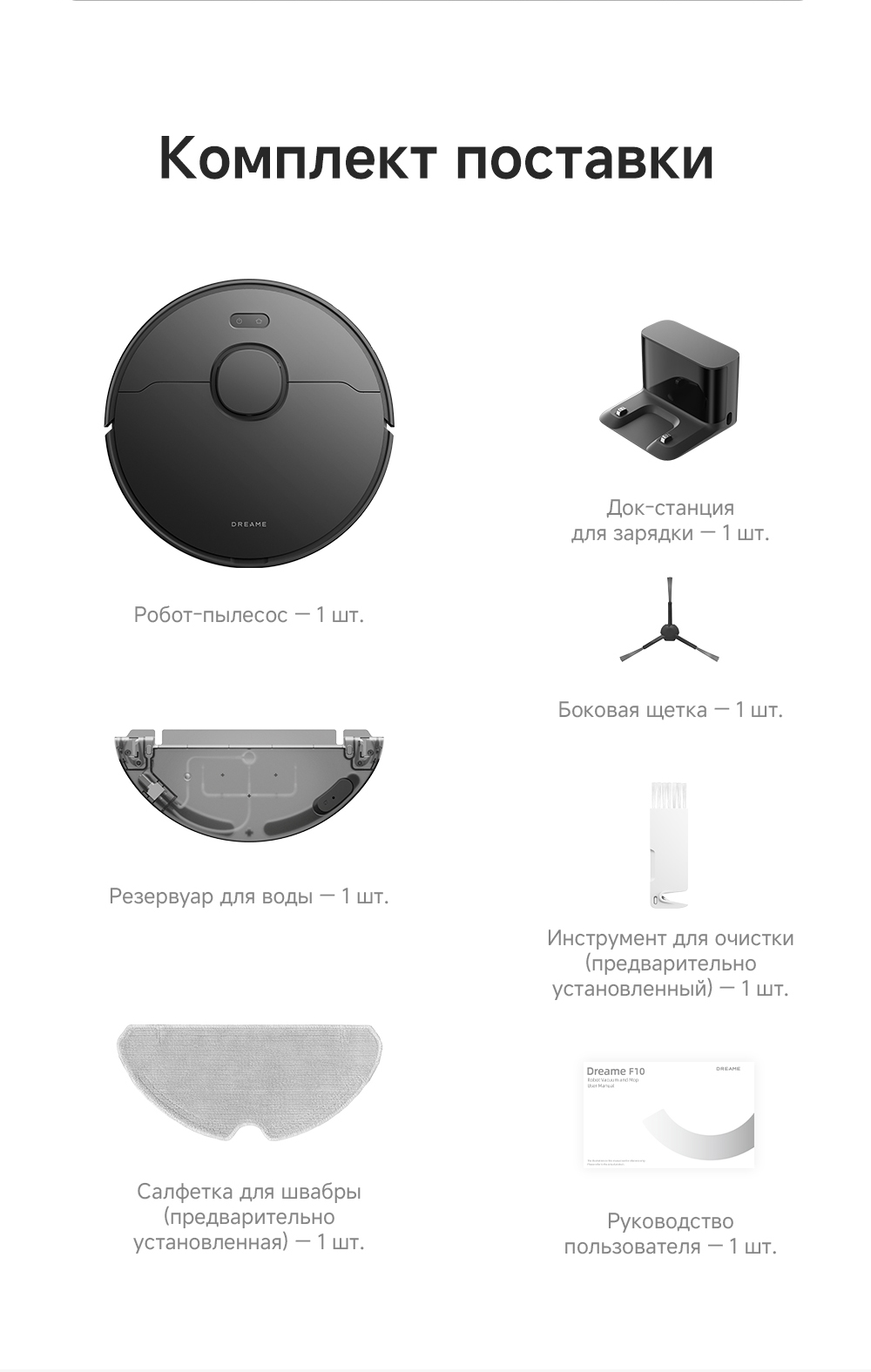Робот-пылесос, док-станция, инструмент для очистки, руководство пользователя.