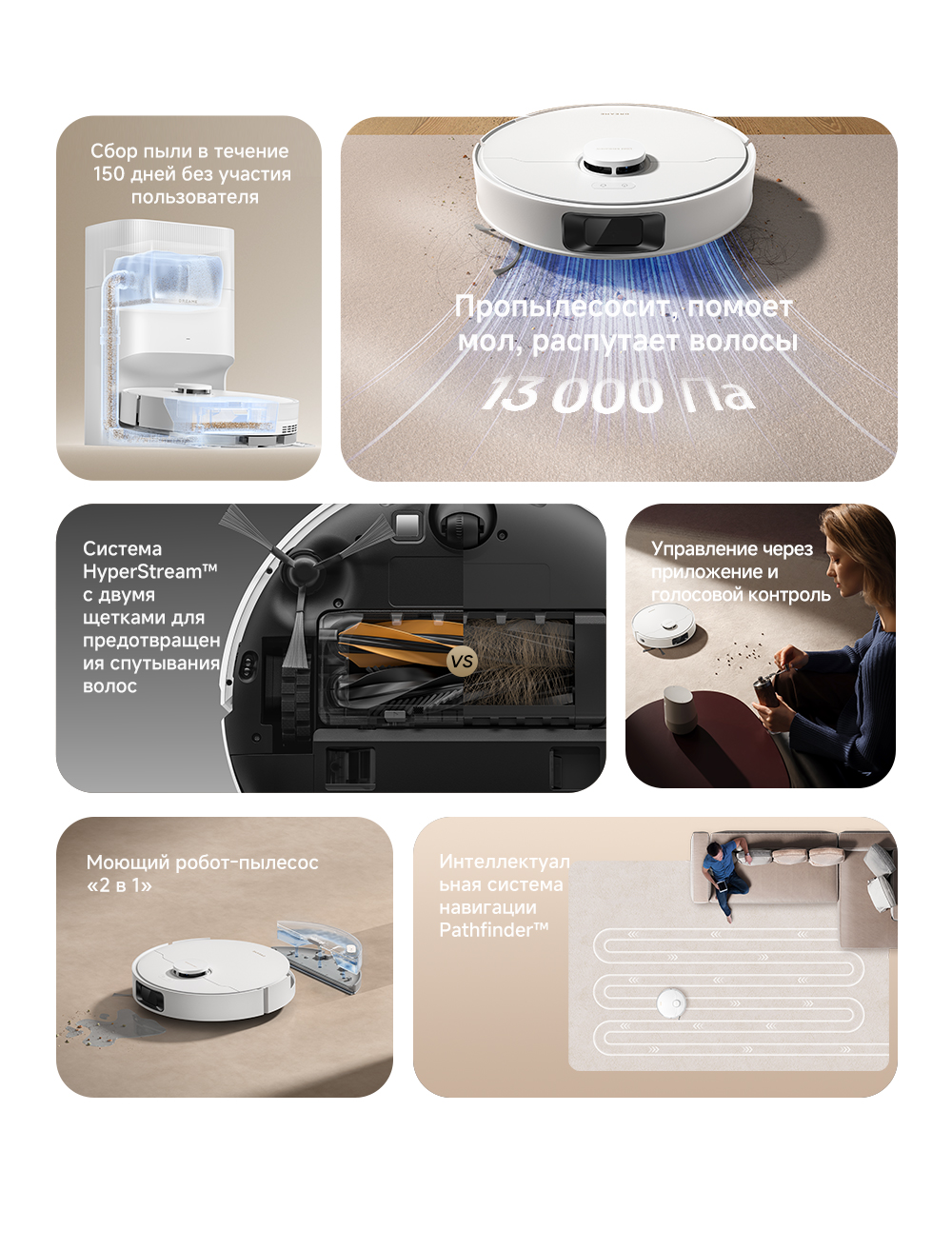 Система HyperStream с двумя щётками предотвращает спутывание волос. 32 уровня увлажнения швабр для влажной уборки различных напольных покрытий. Система Vormax - мощность всасывания 13000 Па. Сброс пыли без участия пользователя до 150 дней.