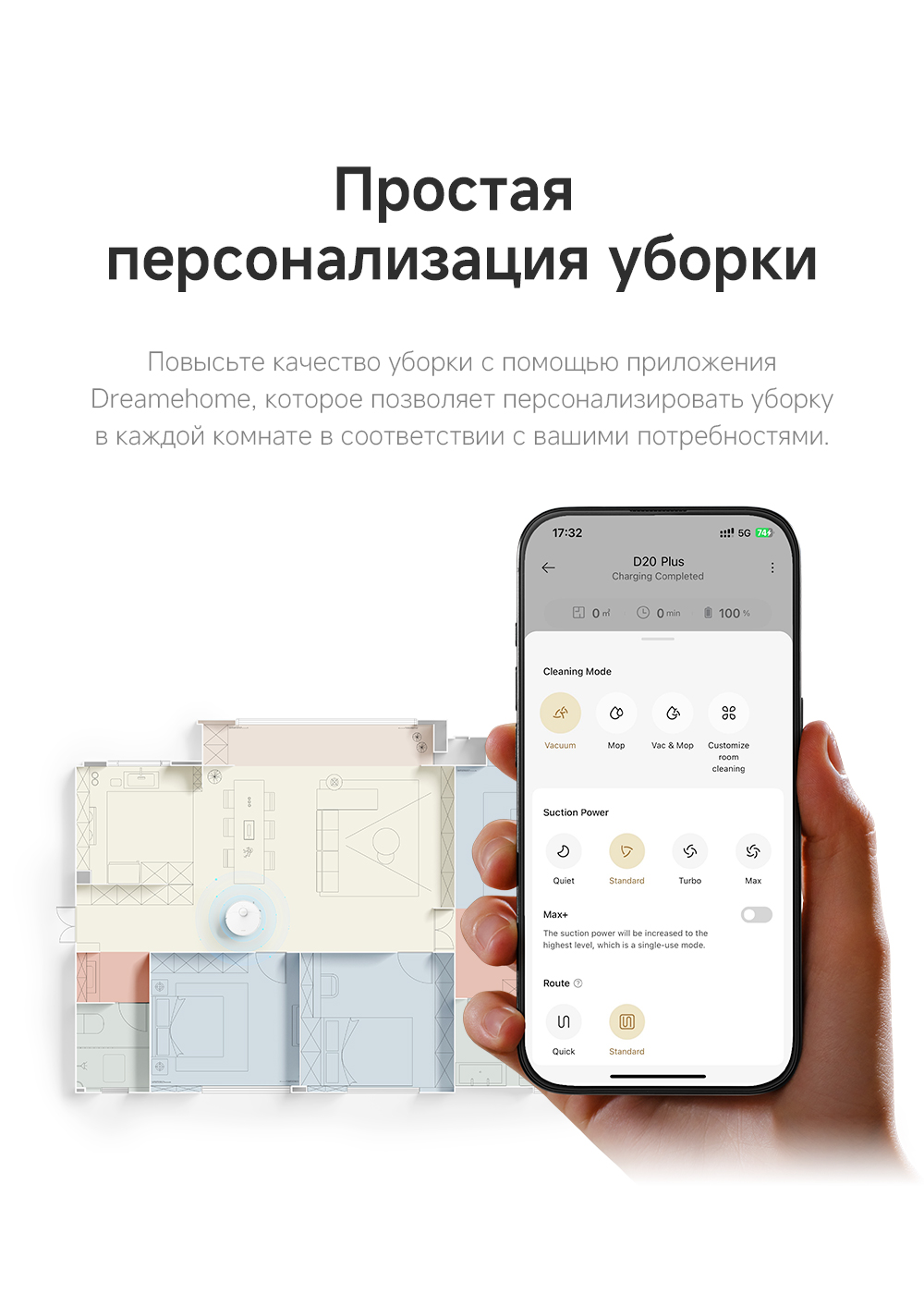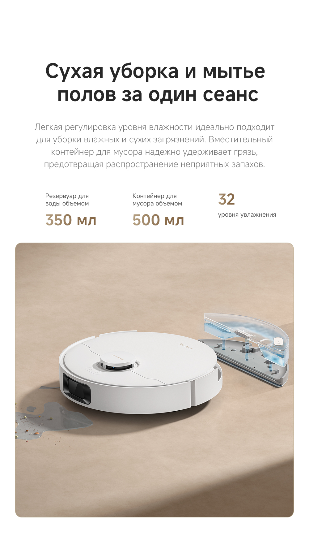 АртикулRLD35GDТипРобот-пылесосВзаимодействие с приложениямиDreamehome / Amazon Alexa / Apple SiriИнтеграция с умным домомДаУправлениеCо смартфона / Кнопочное / Через приложениеЁмкость аккумулятора5200 мАчРекомендованные товарыЦветбелыйОсобенностиСистема HyperStream с двумя щётками предотвращает спутывание волос. 32 уровня увлажнения швабр для влажной уборки различных напольных покрытий. Система Vormax - мощность всасывания 13000 Па. Сброс пыли без участия пользователя до 150 дней.СерияD - серияТип уборкиВлажная / СухаяГолосовой помощникЕстьМаксимальная мощность всасывания, кПа13ТаймерЕстьКоличество режимов уборки4Поддержка Wi-FiЕстьУправление с помощью смартфонаЕстьСистема фильтрацииHEPA-фильтрСоставление плана помещенияЕстьРежим самоочисткиЕстьУборка ковровЕстьУборка шерсти животныхЕстьОбъем пылесборника, мл500Объем пылесборника док-станции, л5Высота преодоления препятствий, см2Ограничитель зоны уборкиВиртуальная стенаПодключение к водопроводу и канализацииНетОбъем контейнера для чистой воды, л0.35КомплектацияРобот-пылесос, базовая станция с автоматическим опустошением сухого мусора, запасной мешок для пыли, руководство пользователя, руководство по эксплуатации.Кнопкивкл/выкл / кнопка "Домой"ДвигательБесщеточныйПодсказкиЕстьМодельD20 PlusВлажный тип уборкиДаМинимальная цена со скидкой1099Краткое наименованиеD20 PlusНавигационная системаLDSГабаритыРобот-пылесос 35х35х9.7 см, базовая станция 44х29.8х45.2 смВесРобот-пылесос 3.51 кг, базовая станция 3.91 кгИзготовительDreame Trading (Tianjin) Co. Ltd., Китай, Room 2112-1-1, South District, Finance and Trade Center, No.6975 Yazhou Road, Dongjiang Bonded Port Area, Tianjin Pilot Free Trade Zone, TianjinИмпортерООО "АйТи Дистрибуция", 223053, Республика Беларусь, Минская область, Минский район, Боровлянский с/с, 103/3-7, помещение №7-50Гарантийный срок12 месяцев