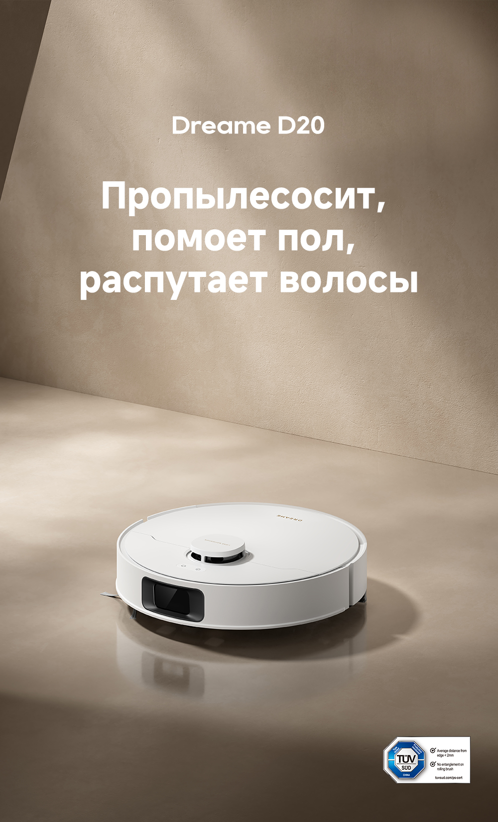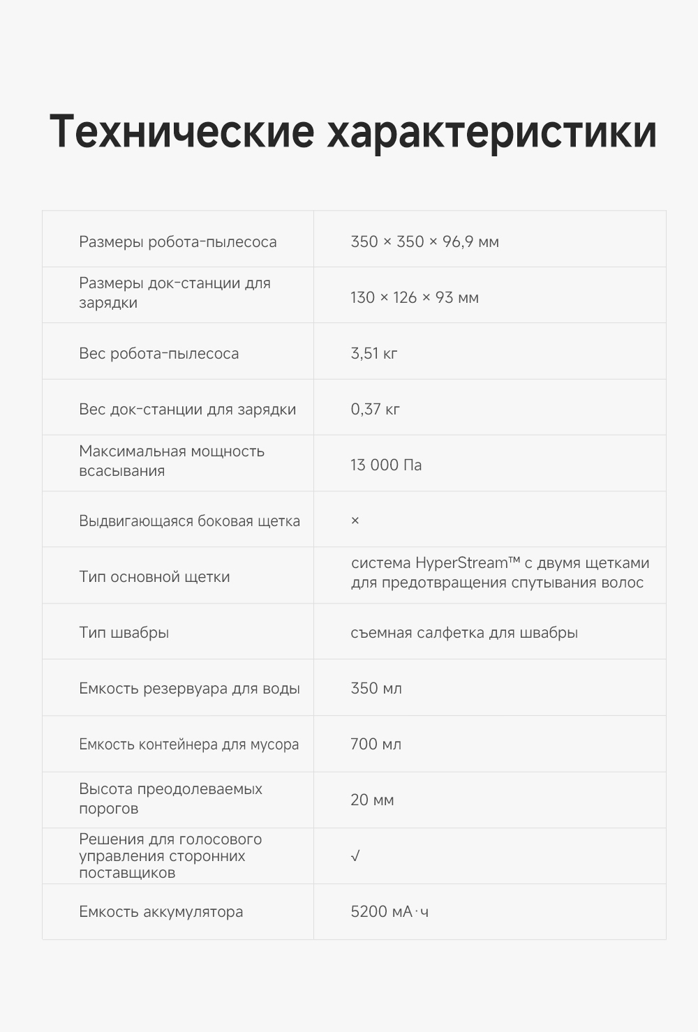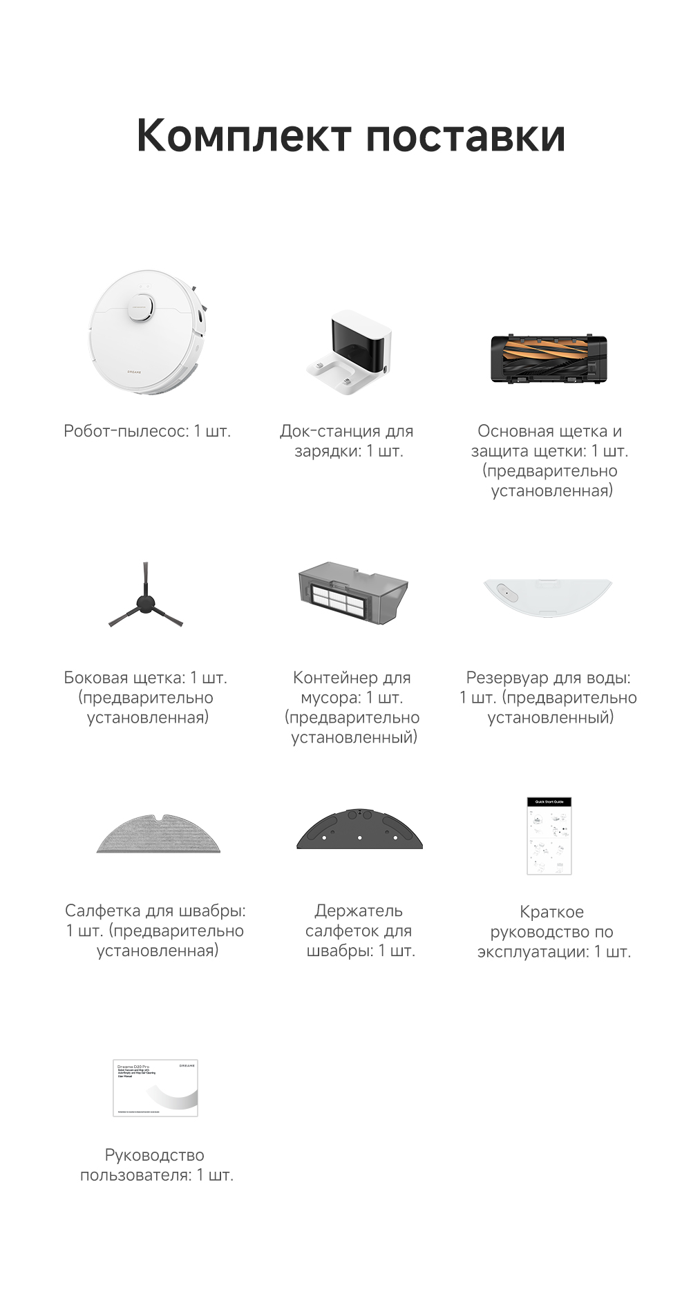АртикулRLD35GAТипРобот-пылесосСвязанные элементы по цветуВзаимодействие с приложениямиDreamehome / Amazon Alexa / Apple Siri / Google AssistantИнтеграция с умным домомДаУправлениеCо смартфона / Кнопочное / Через приложениеЁмкость аккумулятора5200 мАчРекомендованные товарыЦветбелыйОсобенностиСистема HyperStream с двумя щетками для предотвращения спутывания волос. 32 уровня увлажнения швабр позволяют подстроить влажную уборку для любого типа покрытия. Эффективная уборка вдоль стен и вокруг мебели. Решение 2 в 1 для сухой уборки и мытья пола.СерияD - серияТип уборкиВлажная / СухаяГолосовой помощникЕстьМаксимальная мощность всасывания, кПа13Количество режимов уборки3Поддержка Wi-FiЕстьУправление с помощью смартфонаЕстьРежимы работыВдоль стены / Локальная уборка / Обычный / ТурбоСистема фильтрацииHEPA-фильтрСоставление плана помещенияЕстьРежим самоочисткиНетУборка ковровЕстьУборка шерсти животныхЕстьОбъем пылесборника, мл700Минимальный уровень шума, дБ68Высота преодоления препятствий, см2Обнаружение препятствийЕстьОграничитель зоны уборкиВиртуальная стенаПодключение к водопроводу и канализацииНетОбъем контейнера для чистой воды, л0.35КомплектацияРобот-пылесос, док-станция, руководство пользователя, руководство по эксплуатации.Кнопкивкл/выкл / кнопка "Домой"ДвигательБесщеточныйПодсказкиЕстьМодельD20Влажный тип уборкиДаМинимальная цена со скидкой899Краткое наименованиеD20Навигационная системаLDSГабаритыРобот-пылесос 35х35х9.7 см, базовая станция 13х12.6х9.3 смВесРобот-пылесос 3.51 кг, базовая станция 0.37 кгИзготовительDreame Trading (Tianjin) Co. Ltd., Китай, Room 2112-1-1, South District, Finance and Trade Center, No.6975 Yazhou Road, Dongjiang Bonded Port Area, Tianjin Pilot Free Trade Zone, TianjinИмпортерООО "АйТи Дистрибуция", 223053, Республика Беларусь, Минская область, Минский район, Боровлянский с/с, 103/3-7, помещение №7-50Гарантийный срок12 месяцев