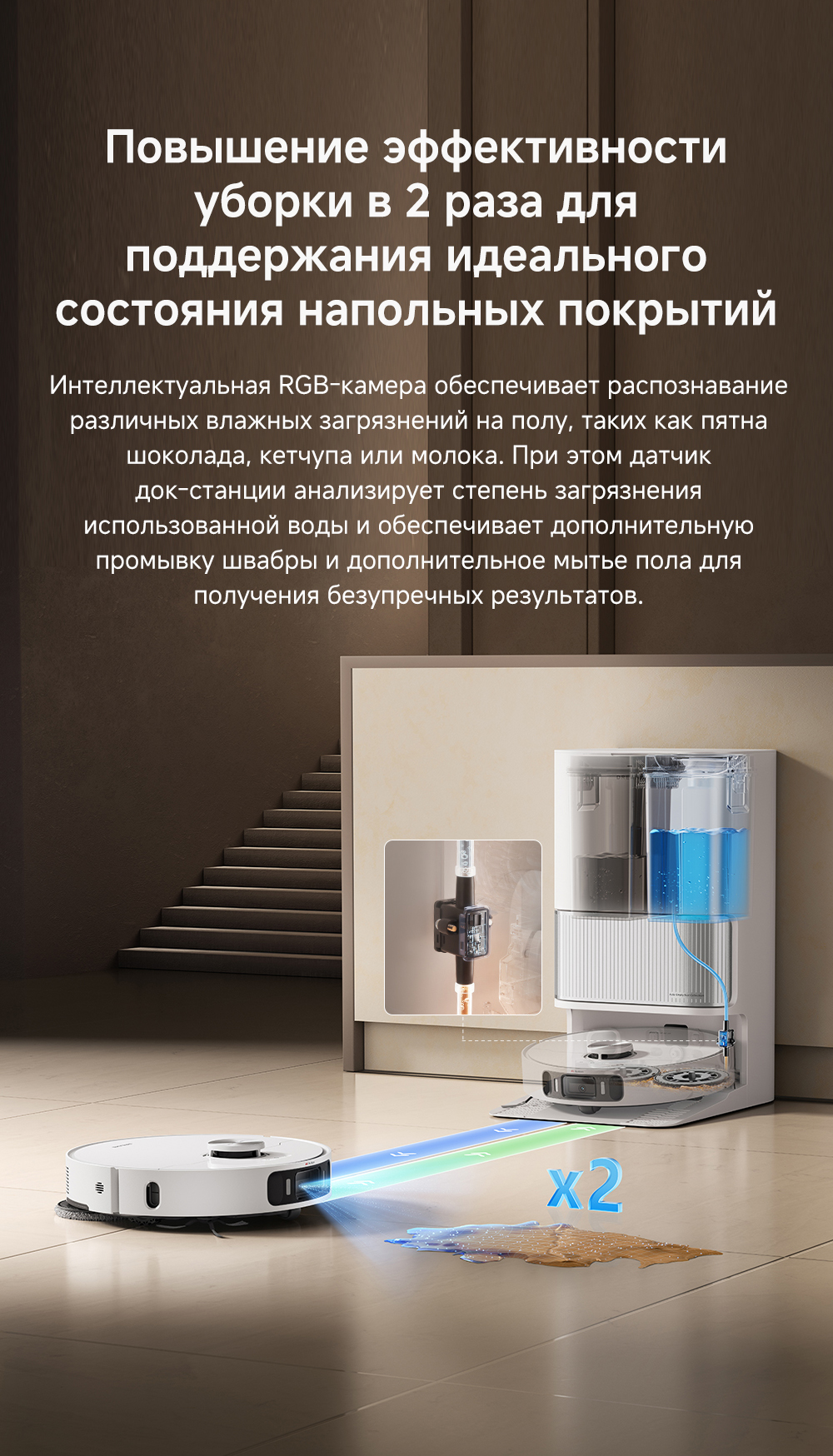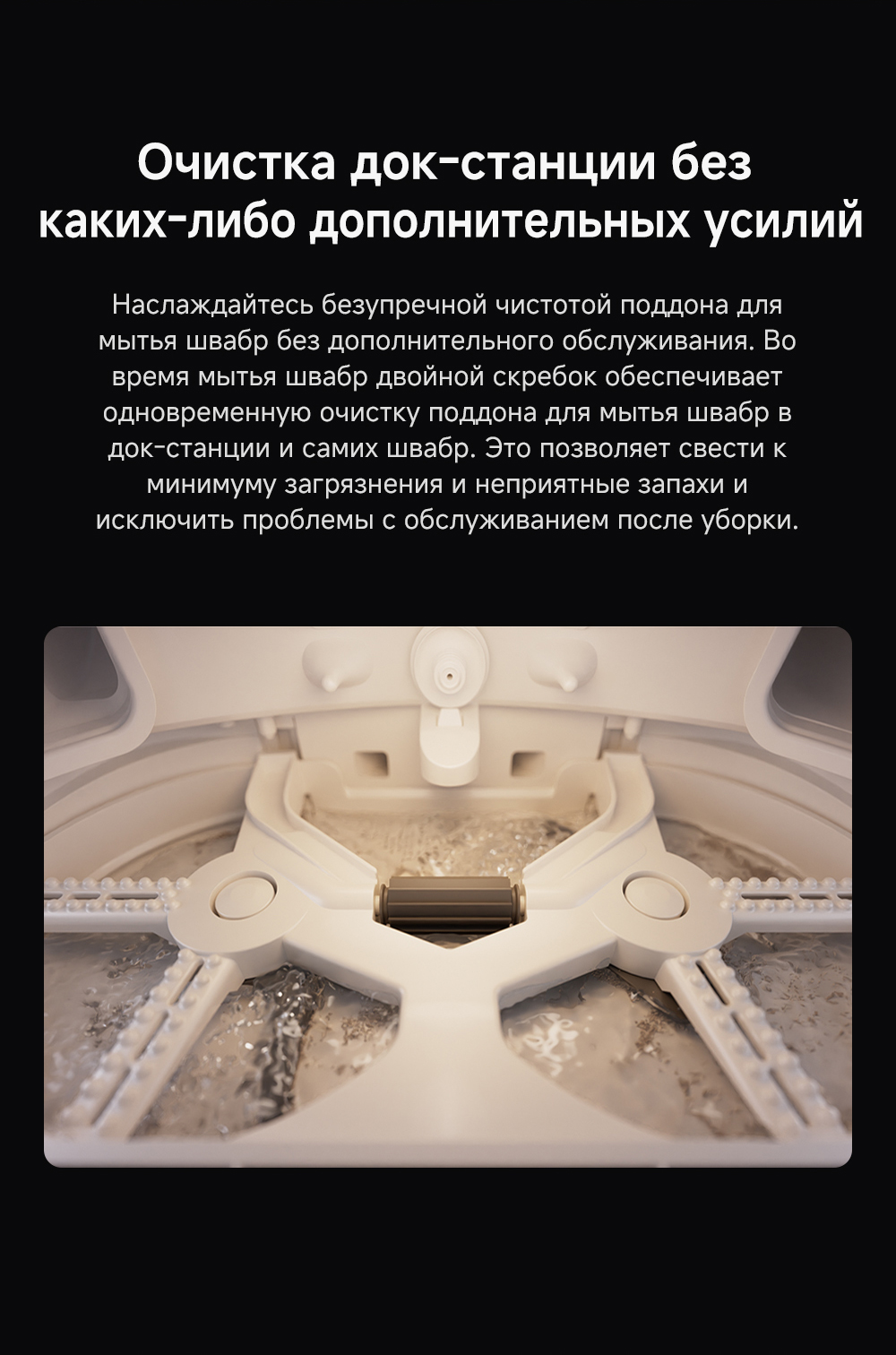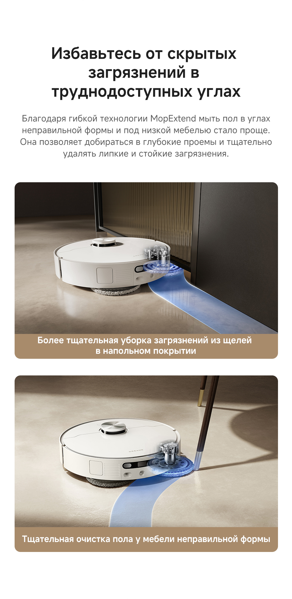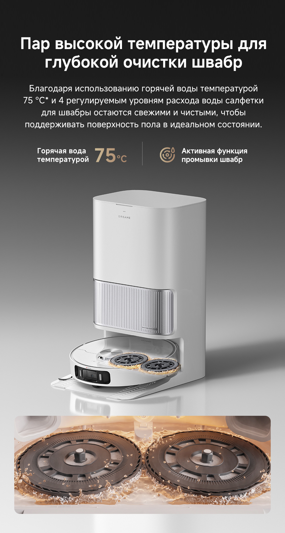Выдвижная швабра для более тщательной уборки у плинтуса и в углах. Система OmniDirt - распознавание загрязнений на полу. Интеллектуальная система навигации, распознавание 180 типов предметов. Функция самоочистки при температуре 75°С.