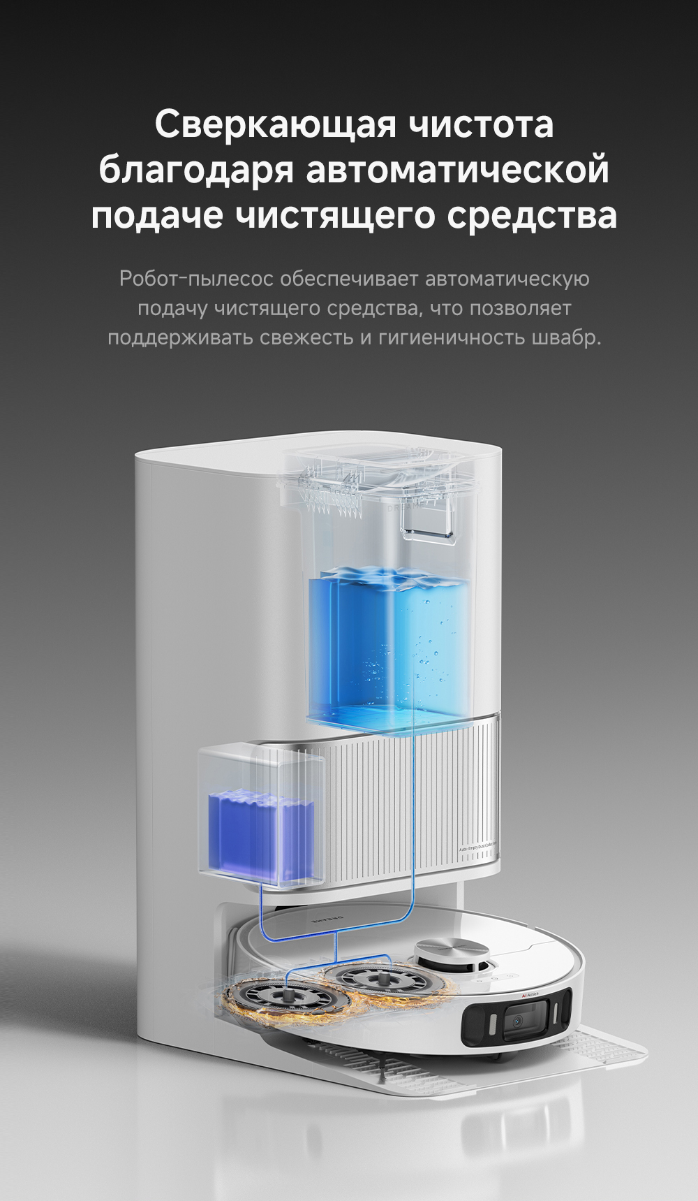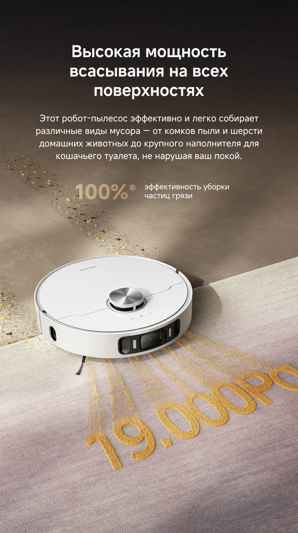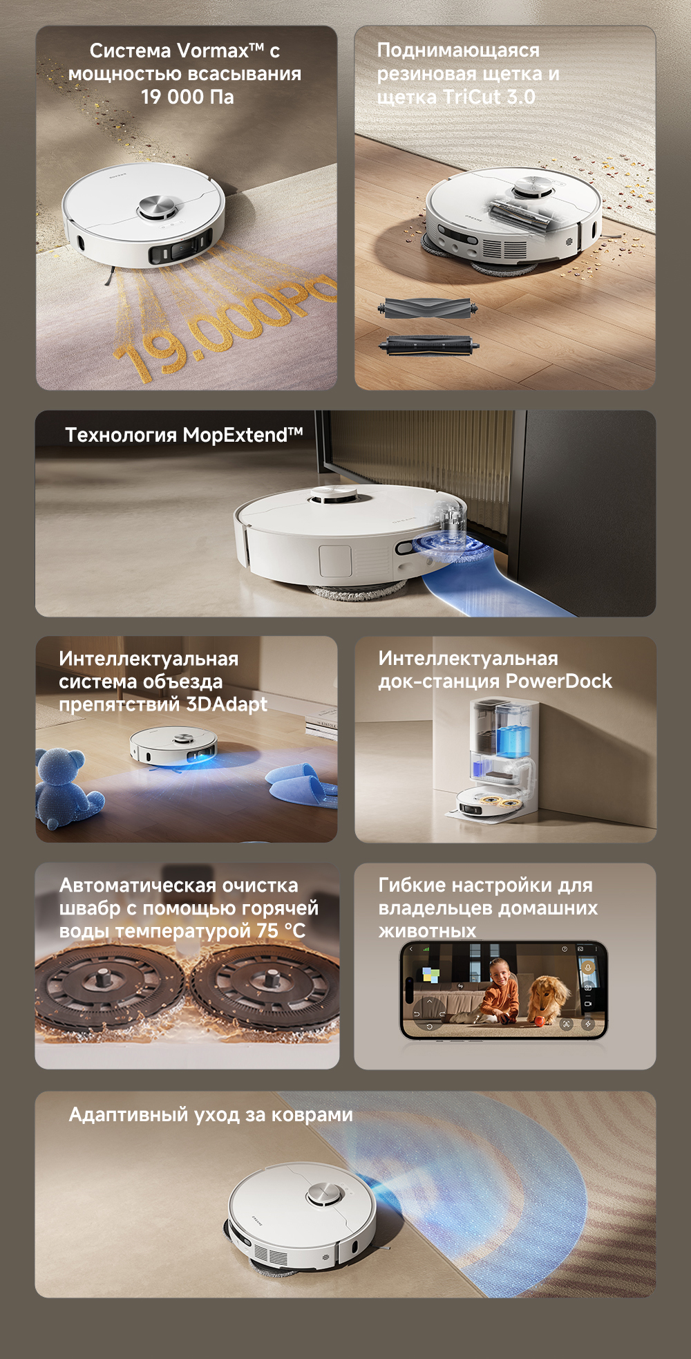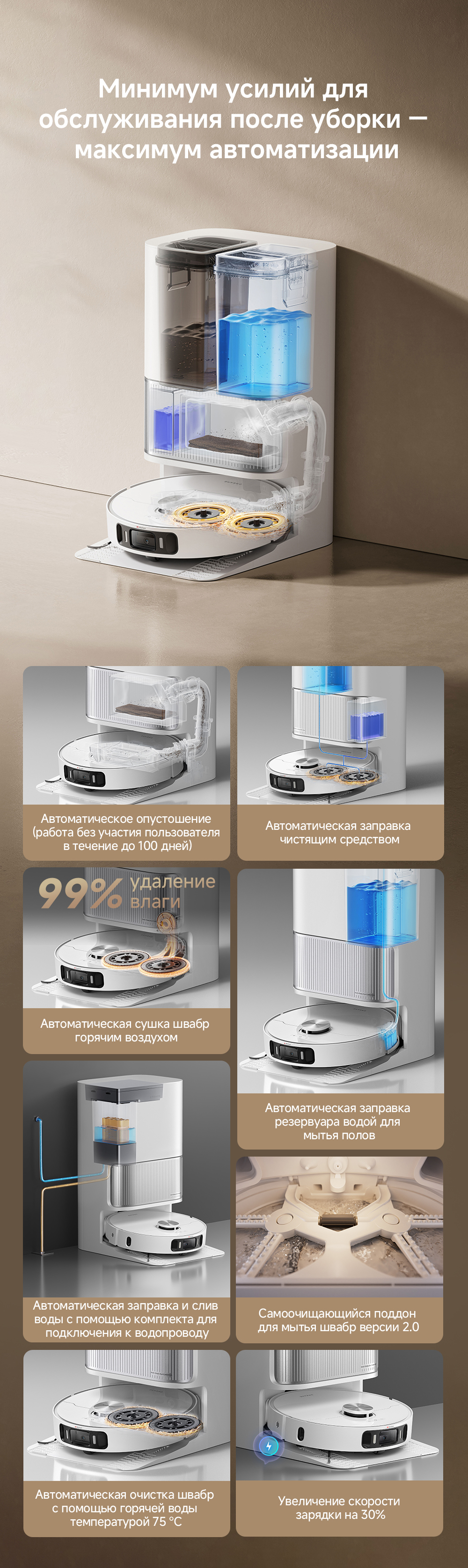 Выдвижная швабра для более тщательной уборки у плинтуса и в углах. Система OmniDirt - распознавание загрязнений на полу. Интеллектуальная система навигации, распознавание 180 типов предметов. Функция самоочистки при температуре 75°С.