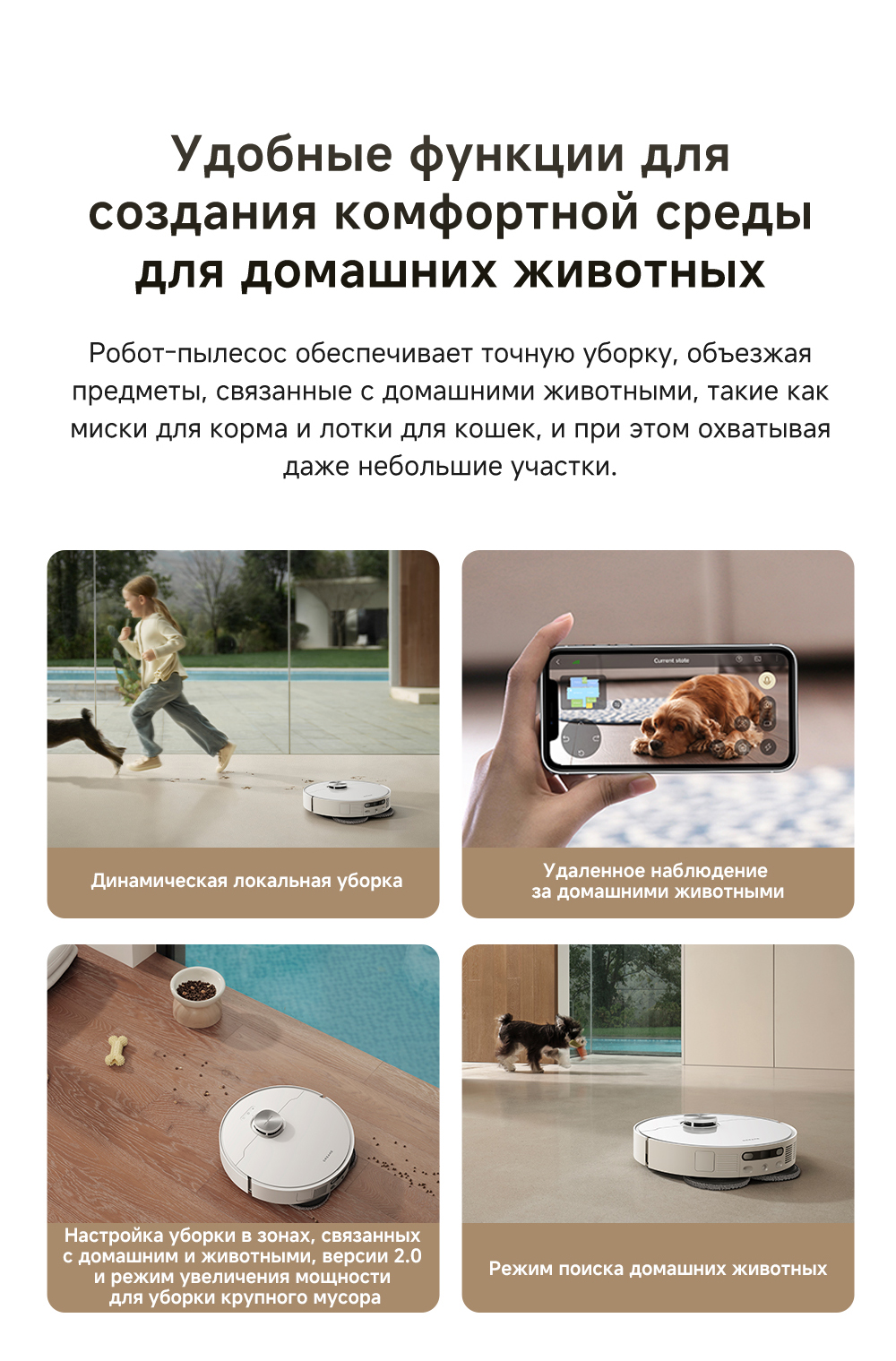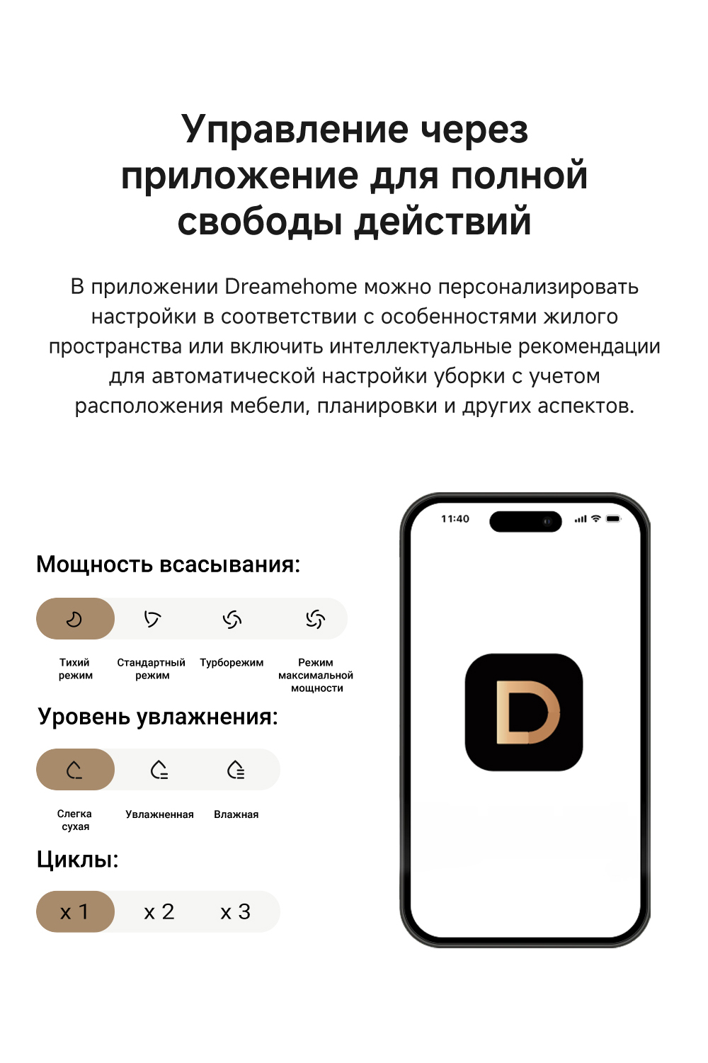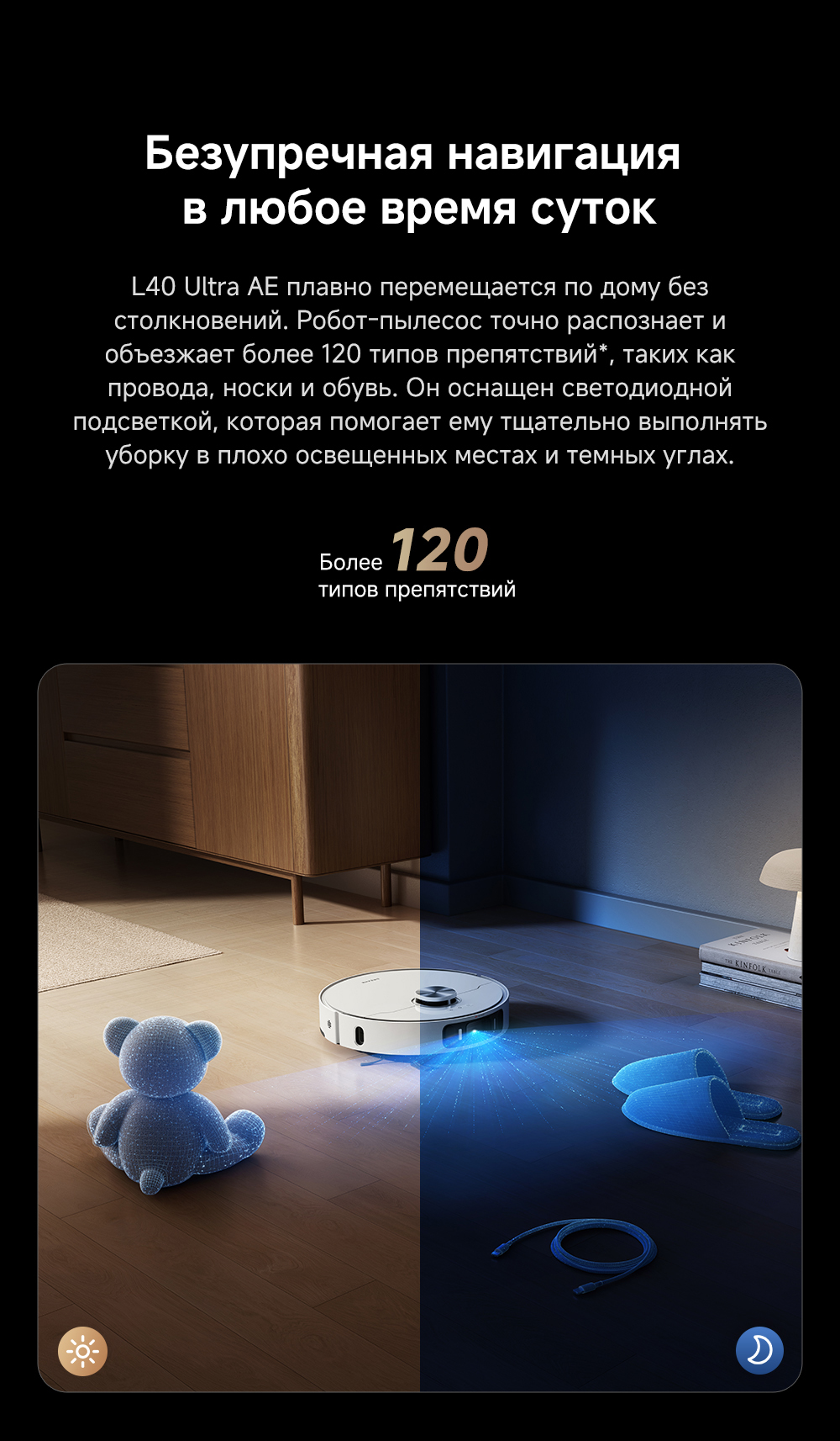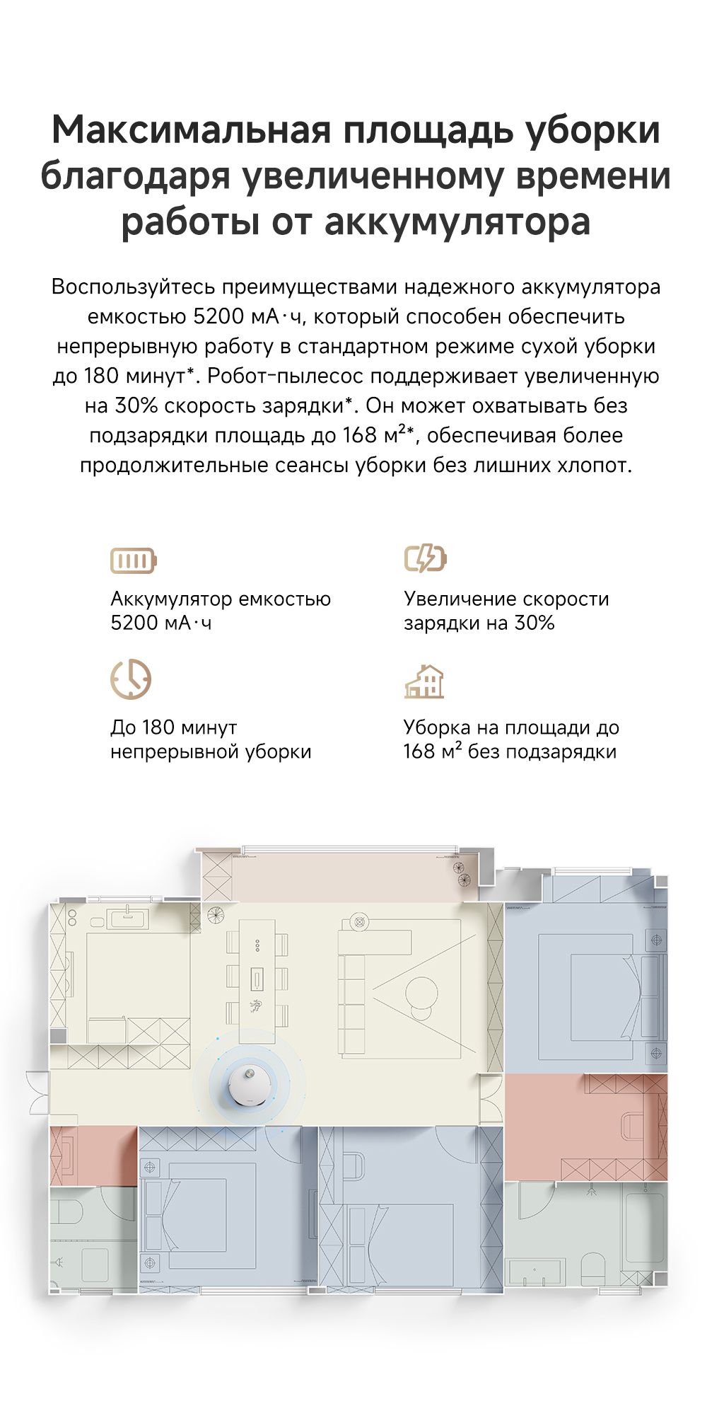 Выдвижная швабра для более тщательной уборки у плинтуса и в углах. Система OmniDirt - распознавание загрязнений на полу. Интеллектуальная система навигации, распознавание 180 типов предметов. Функция самоочистки при температуре 75°С.