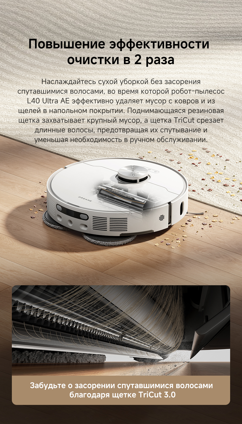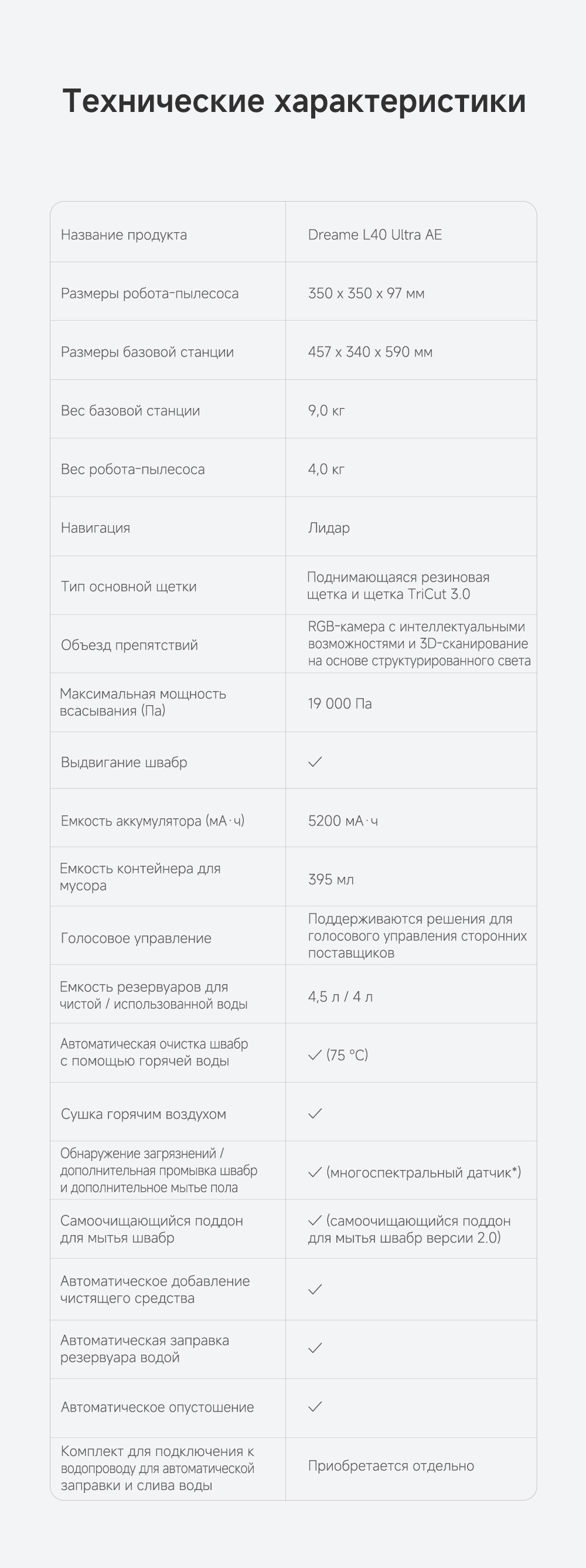 АртикулRLL77SEТипРобот-пылесосСвязанные элементы по цветуВзаимодействие с приложениямиApple Siri / Дом с Алисой / Google Assistant / DreamehomeИнтеграция с умным домомДаУправлениеCо смартфона / Кнопочное / Через приложениеЁмкость аккумулятора5200 мАчРекомендованные товарыЦветбелыйОсобенностиВыдвижная швабра для более тщательной уборки у плинтуса и в углах. Система OmniDirt - распознавание загрязнений на полу. Интеллектуальная система навигации, распознавание 180 типов предметов. Функция самоочистки при температуре 75°С.СерияL - серияТип уборкиВлажная / СухаяВремя автономной работы180 минутГолосовой помощникЕстьМаксимальная мощность всасывания, кПа19ТаймерЕстьКоличество режимов уборки3Поддержка Wi-FiЕстьУправление с помощью смартфонаЕстьСистема фильтрацииHEPA-фильтрСоставление плана помещенияЕстьРежим самоочисткиЕстьФронтальная камераЕстьУборка ковровЕстьУборка шерсти животныхЕстьОбъем пылесборника, мл395Объем пылесборника док-станции, л3.2Объем контейнера для чистой воды док-станции, л4.5Минимальный уровень шума, дБ65Высота преодоления препятствий, см2.2Тип щёткиБоковая щетка / Насадка с вращающимися швабрами для влажной уборки / ТурбощеткаОбнаружение препятствийЕстьОграничитель зоны уборкиВиртуальная стена / ЕстьОбъем контейнера для грязной воды док-станции, л4Подключение к водопроводу и канализацииЕсть (комплект для подключения приобретается отдельно)Объем контейнера для чистой воды, л0.08КомплектацияРобот-пылесос, базовая станция, дополнительная основная щётка TriCut с системой против спутывания волос, сменный мешок для пыли, моющее средство 200 мл, руководство пользователя, руководство по эксплуатации.Кнопкивкл/выкл / кнопка "Домой"ДвигательБесщеточныйПодсказкиЕстьМодельL40 Ultra AEВлажный тип уборкиДаМинимальная цена со скидкой2199Краткое наименованиеDreame L40 Ultra AEНавигационная системаLDS AI + 3DГабаритыРобот-пылесос 35х35х9.7 см, размеры док-станции: 45.7х34х59 см.ВесРобот-пылесос 4 кг, базовая станция 9 кгИзготовительDreame Trading (Tianjin) Co. Ltd., Китай, Room 2112-1-1, South District, Finance and Trade Center, No.6975 Yazhou Road, Dongjiang Bonded Port Area, Tianjin Pilot Free Trade Zone, TianjinИмпортерООО "АйТи Дистрибуция", 223053, Республика Беларусь, Минская область, Минский район, Боровлянский с/с, 103/3-7, помещение №7-50Гарантийный срок12 месяцев