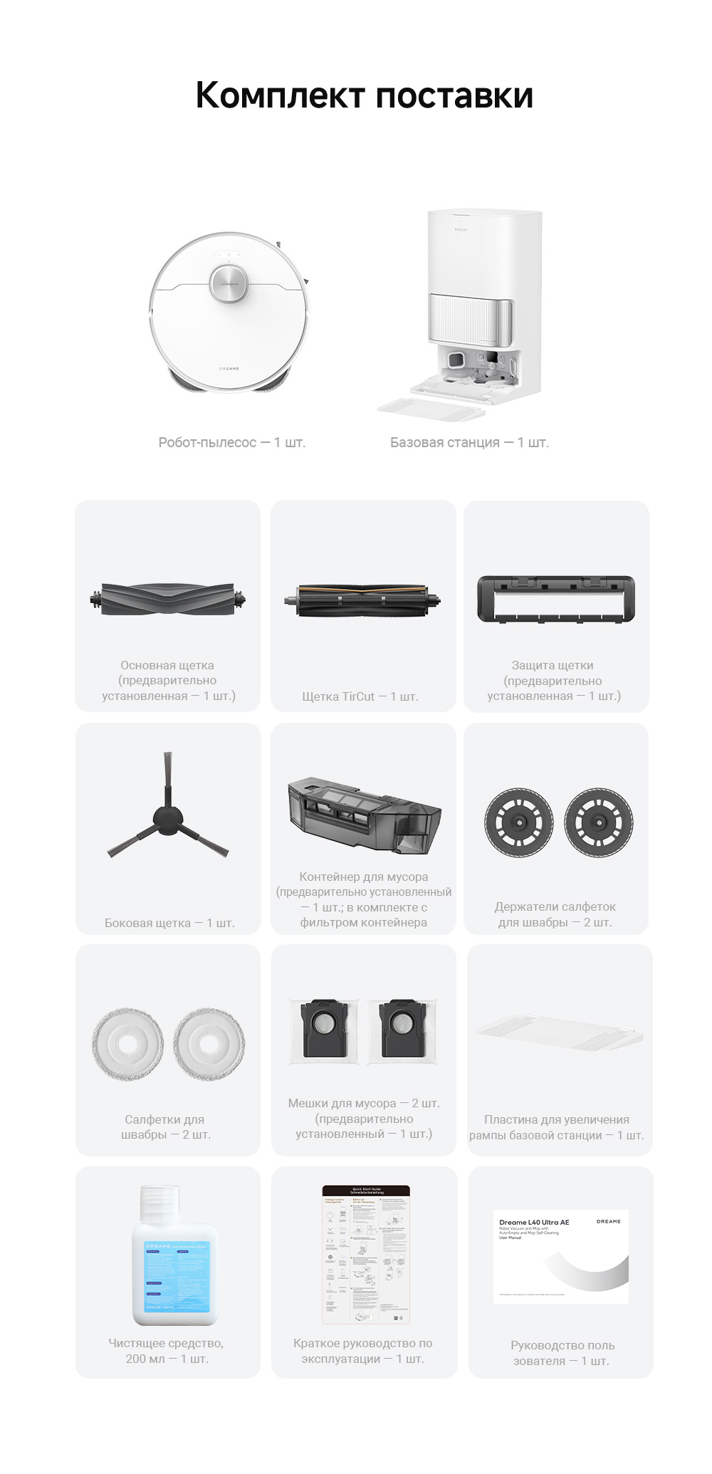 Робот-пылесос, базовая станция, дополнительная основная щётка TriCut с системой против спутывания волос, сменный мешок для пыли, моющее средство 200 мл, руководство пользователя, руководство по эксплуатации.