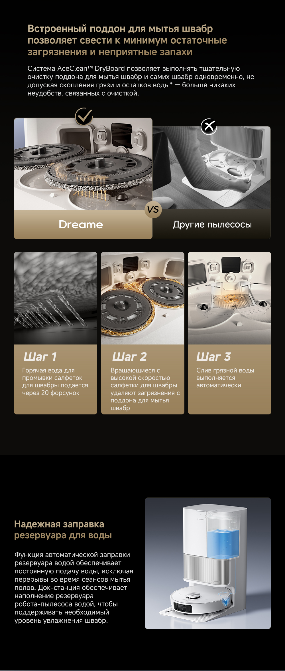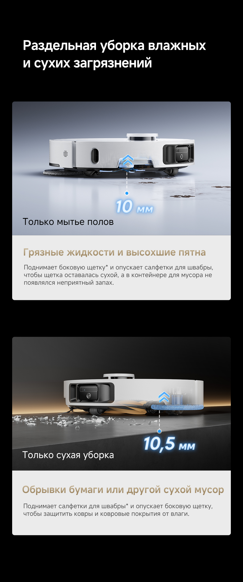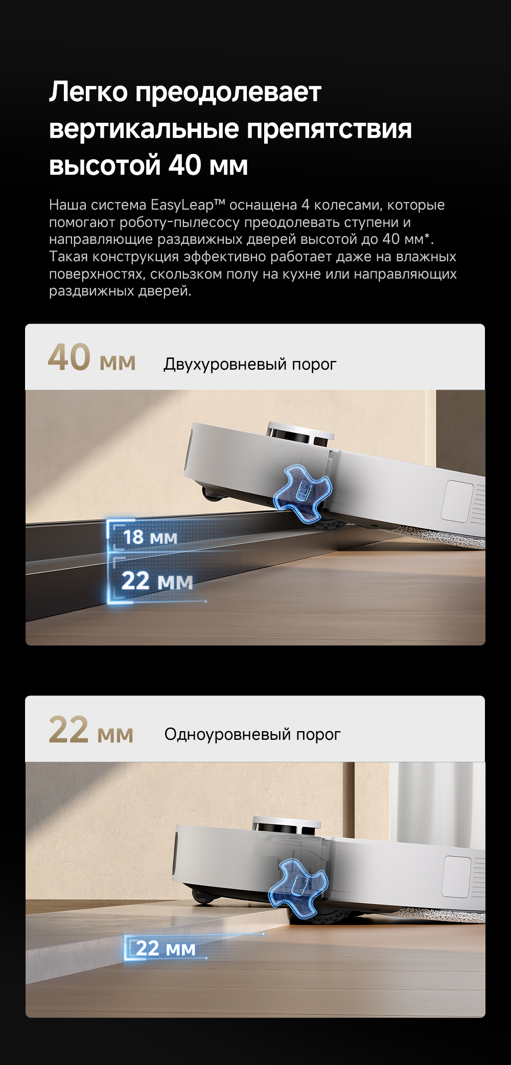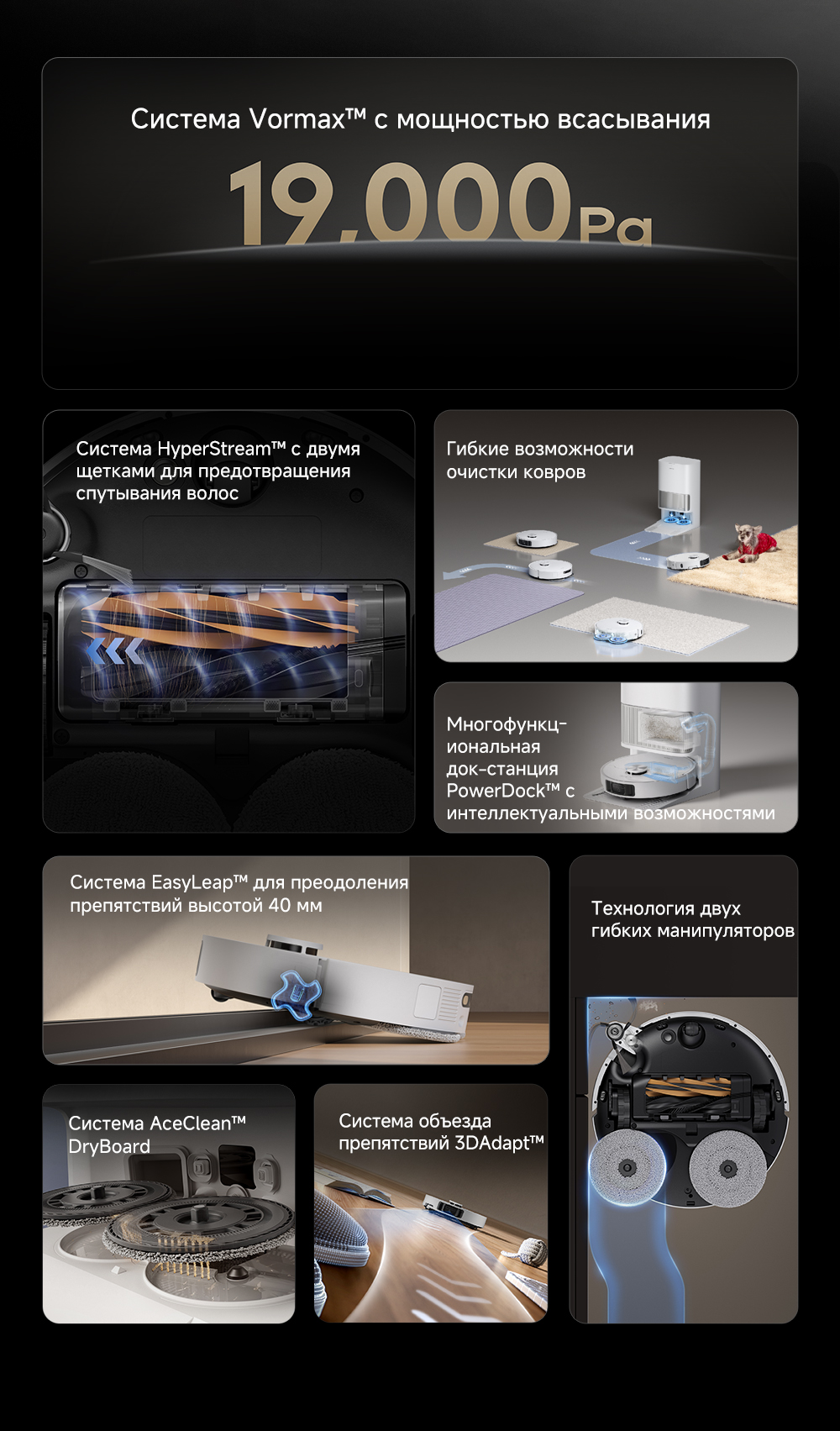 Технология DualFlex Arm - выдвижная боковая щётка и швабра для более эффективной уборки у плинтуса и в углах. Система EasyLeap для преодоления препятствий высотой до 4 см (4 см двухуровневый порог, 2.2 см одноуровневый порог). Автоматическая очистка швабр при температуре 75°С. Система HyperStream с двумя щётками, для предотвращения наматывания волос.