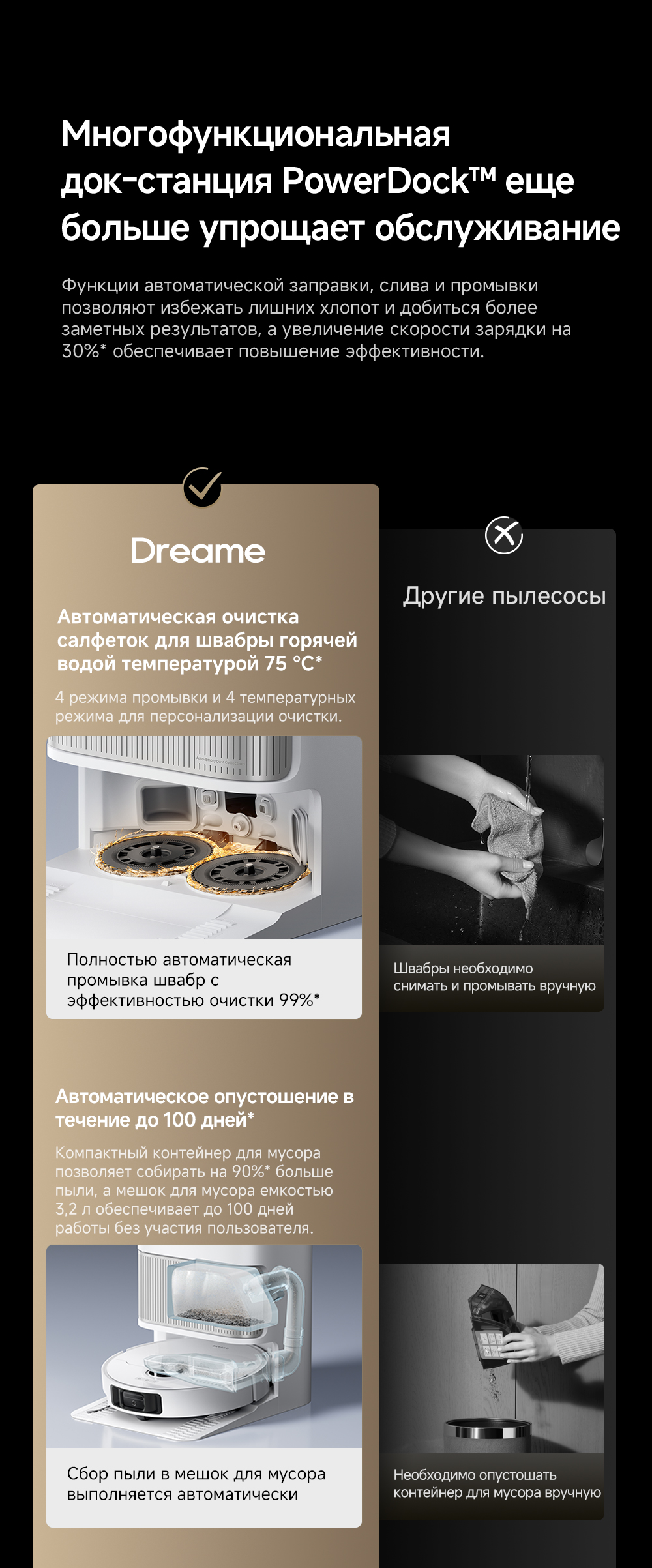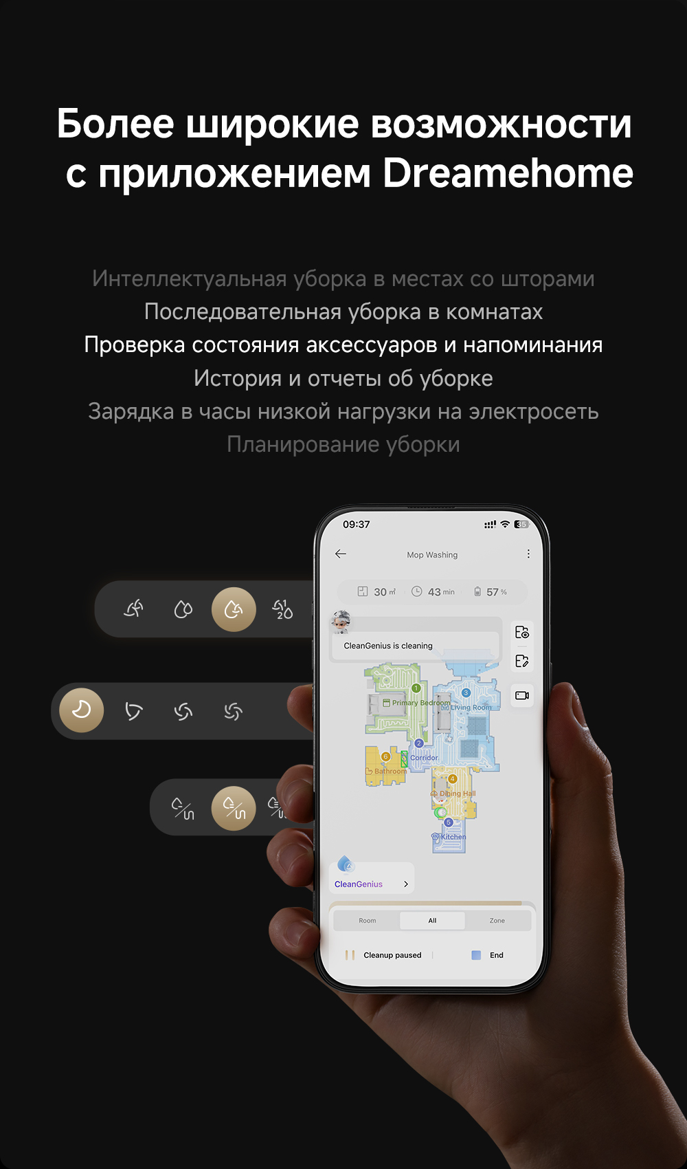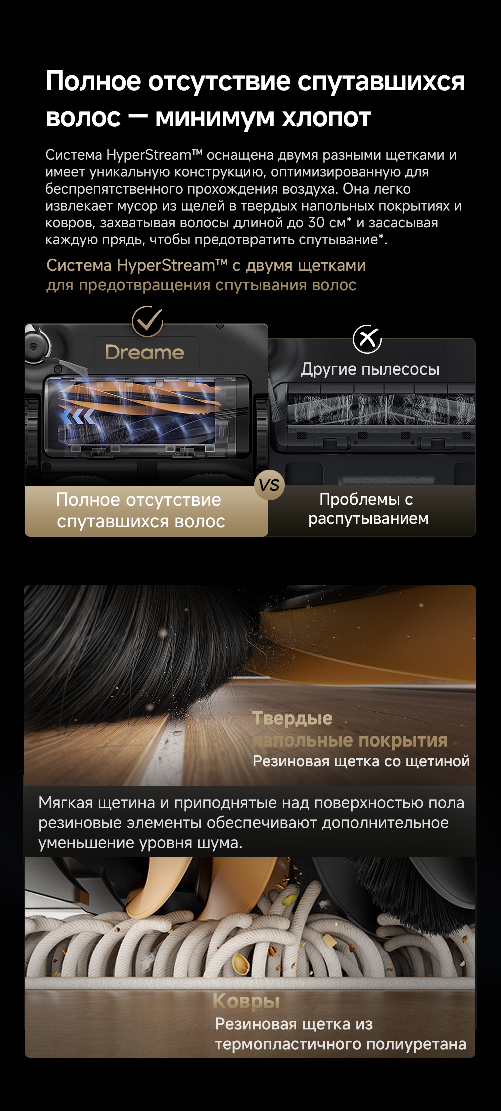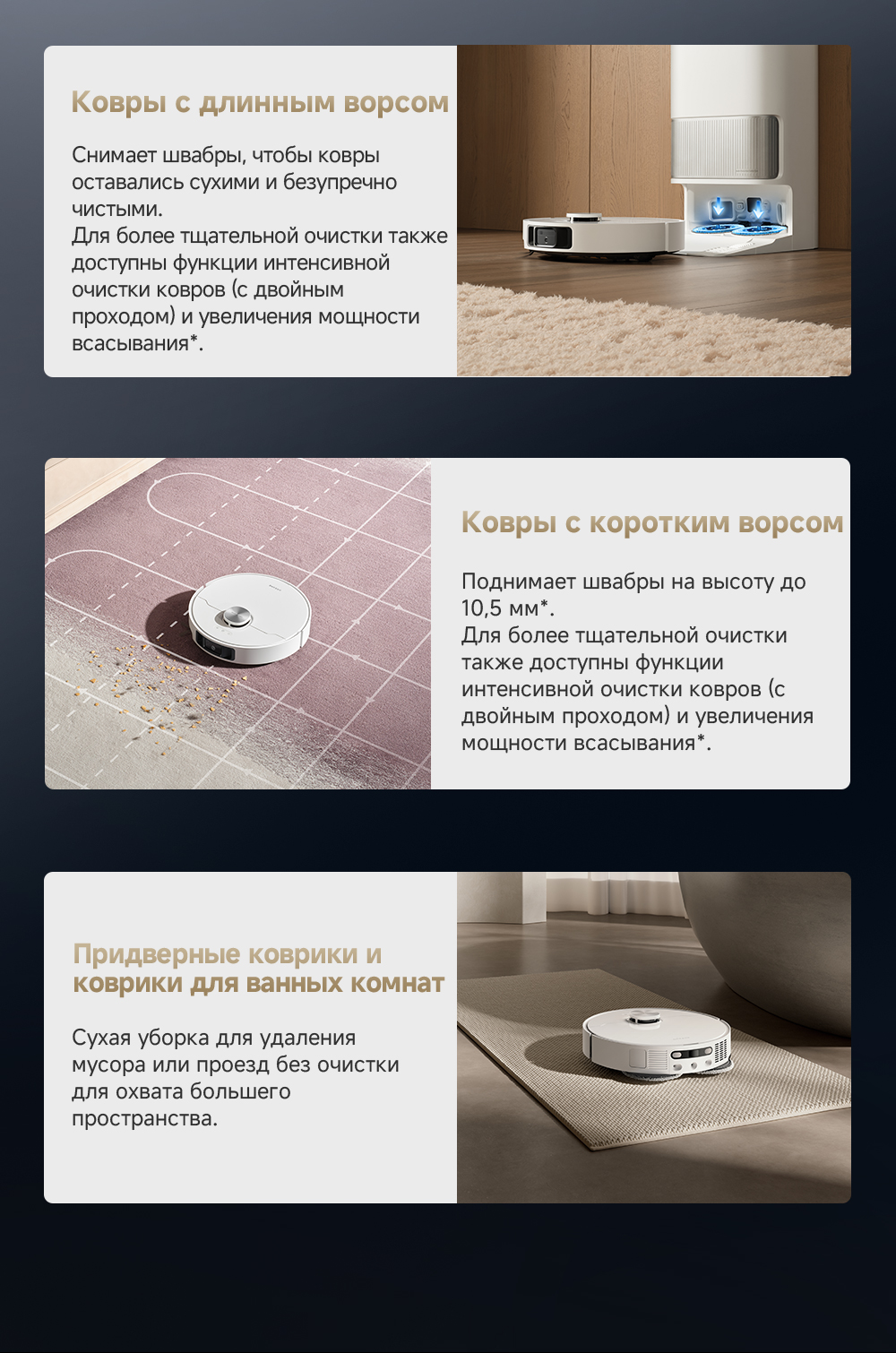 Технология DualFlex Arm - выдвижная боковая щётка и швабра для более эффективной уборки у плинтуса и в углах. Система EasyLeap для преодоления препятствий высотой до 4 см (4 см двухуровневый порог, 2.2 см одноуровневый порог). Автоматическая очистка швабр при температуре 75°С. Система HyperStream с двумя щётками, для предотвращения наматывания волос.