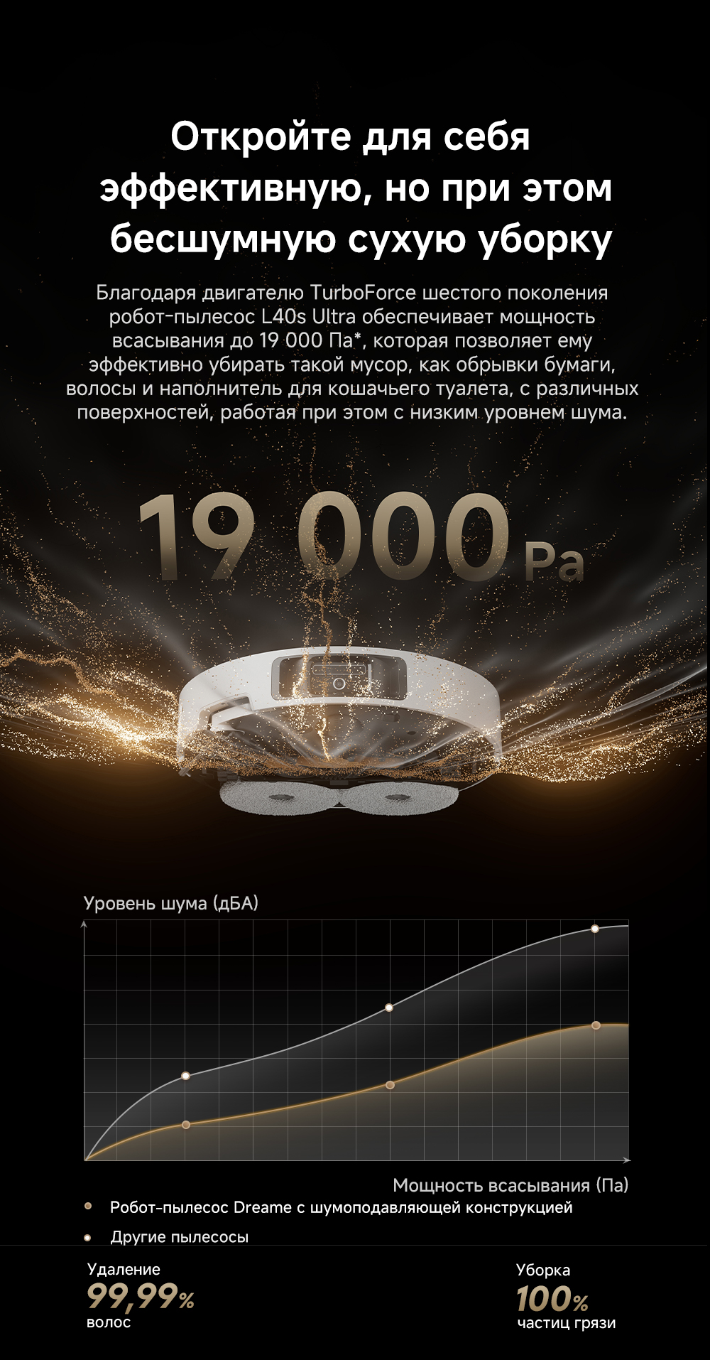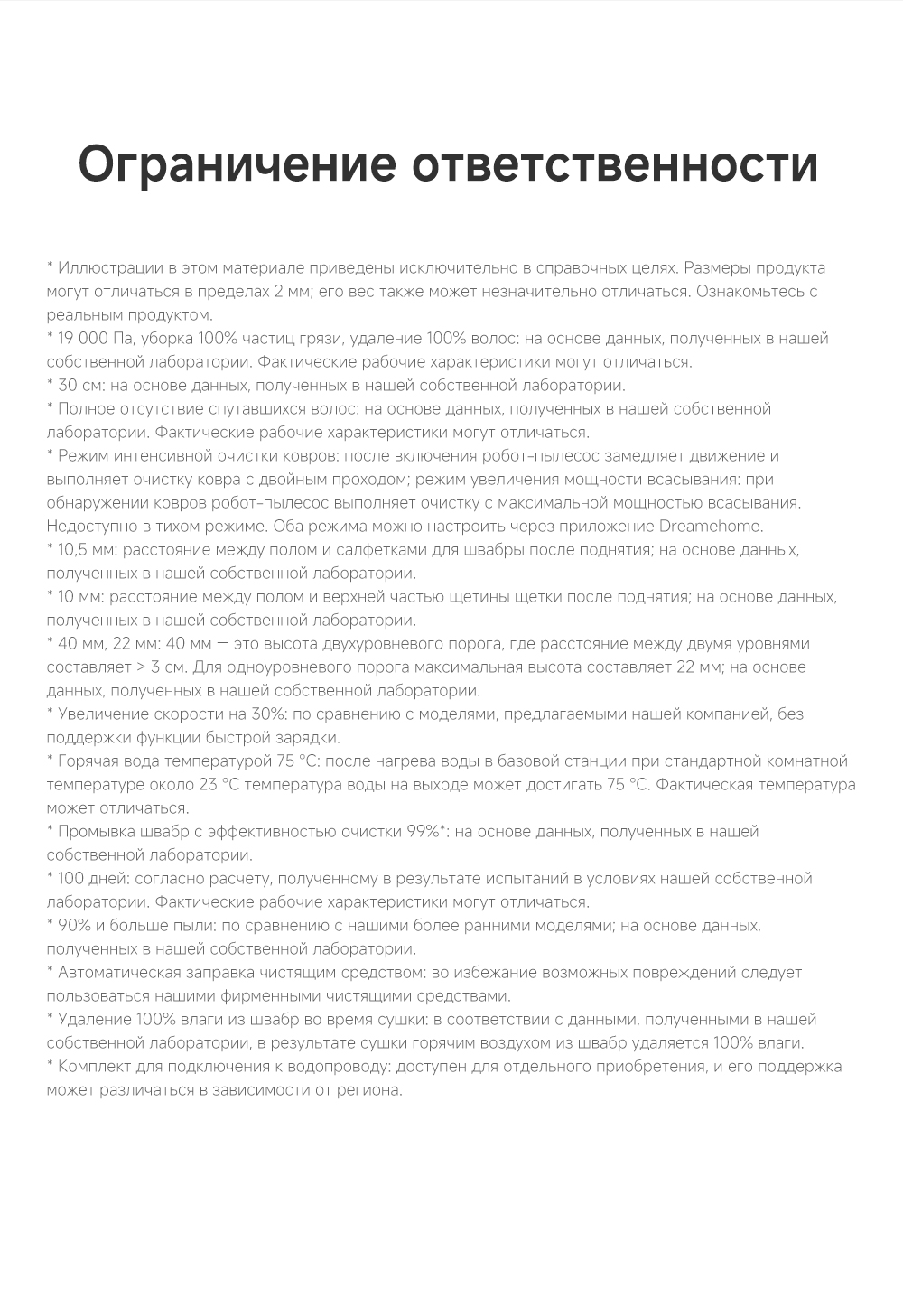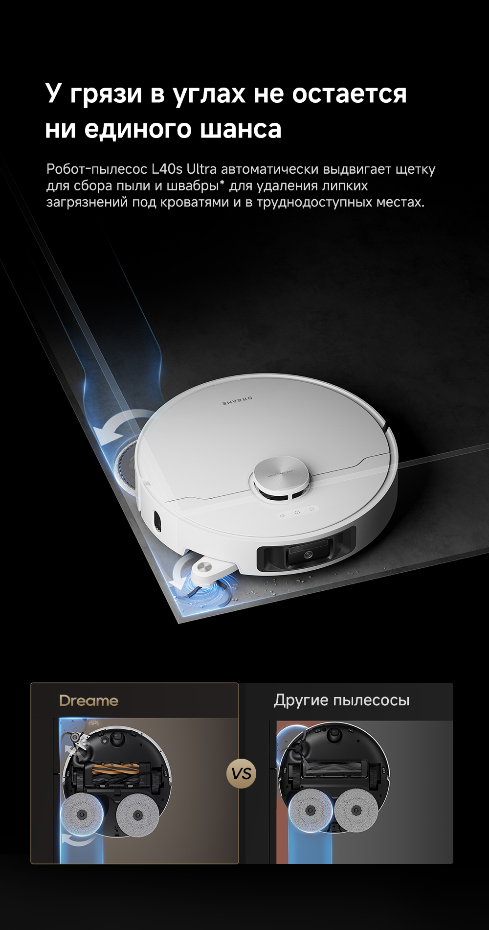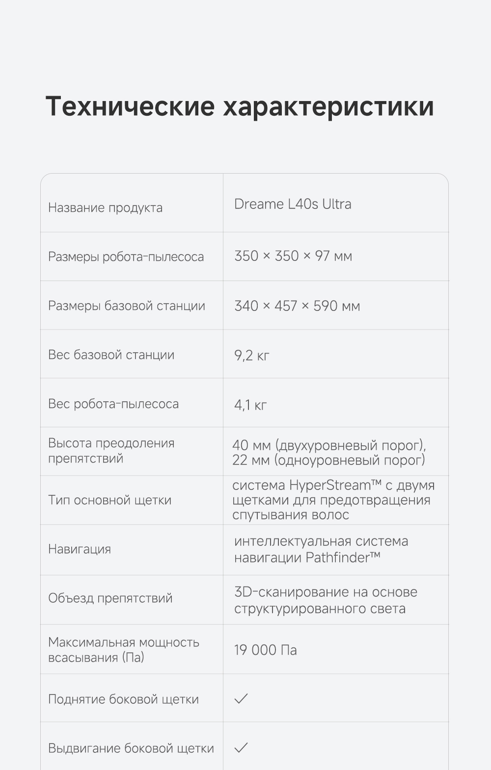 АртикулRLL22SEТипРобот-пылесосВзаимодействие с приложениямиDreamehomeИнтеграция с умным домомДаУправлениеCо смартфона / Кнопочное / Через приложениеЁмкость аккумулятора5200 мАчРекомендованные товарыЦветбелыйОсобенностиТехнология DualFlex Arm - выдвижная боковая щётка и швабра для более эффективной уборки у плинтуса и в углах. Система EasyLeap для преодоления препятствий высотой до 4 см (4 см двухуровневый порог, 2.2 см одноуровневый порог). Автоматическая очистка швабр при температуре 75°С. Система HyperStream с двумя щётками, для предотвращения наматывания волос.СерияL - серияТип уборкиВлажная / СухаяВремя автономной работы180 минутГолосовой помощникЕстьМаксимальная мощность всасывания, кПа19ТаймерЕстьКоличество режимов уборки3Поддержка Wi-FiЕстьУправление с помощью смартфонаЕстьСистема фильтрацииHEPA-фильтрСоставление плана помещенияЕстьРежим самоочисткиЕстьУборка ковровЕстьОбъем пылесборника, мл310Объем пылесборника док-станции, л3.2Объем контейнера для чистой воды док-станции, л4.5Минимальный уровень шума, дБ63Высота преодоления препятствий, см4Обнаружение препятствийЕстьОграничитель зоны уборкиВиртуальная стена / ЕстьОбъем контейнера для грязной воды док-станции, л4Подключение к водопроводу и канализацииЕсть (комплект для подключения приобретается отдельно)КомплектацияРобот-пылесос, базовая станция, сменный мешок для пыли, моющее средство 200 мл, руководство пользователя, руководство по эксплуатации.Кнопкивкл/выкл / кнопка "Домой"ДвигательБесщеточныйПодсказкиЕстьМодельL40s UltraВлажный тип уборкиДаМинимальная цена со скидкой2599Краткое наименованиеL40s UltraНавигационная системаLDS + 3DГабаритыРобот-пылесос 35х35х97 см, размеры док-станции 34х45.7х59 смВесРобот-пылесос 4.1 кг, базовая станция 9.2 кгИзготовительDreame Trading (Tianjin) Co. Ltd., Китай, Room 2112-1-1, South District, Finance and Trade Center, No.6975 Yazhou Road, Dongjiang Bonded Port Area, Tianjin Pilot Free Trade Zone, TianjinИмпортерООО "АйТи Дистрибуция", 223053, Республика Беларусь, Минская область, Минский район, Боровлянский с/с, 103/3-7, помещение №7-50Гарантийный срок12 месяцев