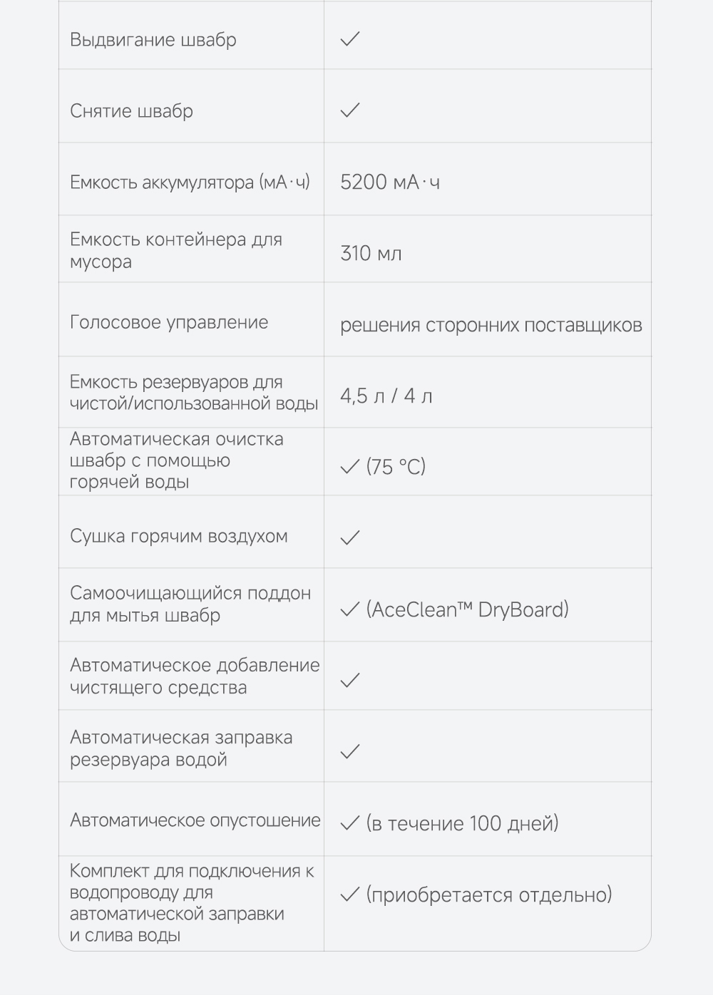 Робот-пылесос, базовая станция, сменный мешок для пыли, моющее средство 200 мл, руководство пользователя, руководство по эксплуатации.