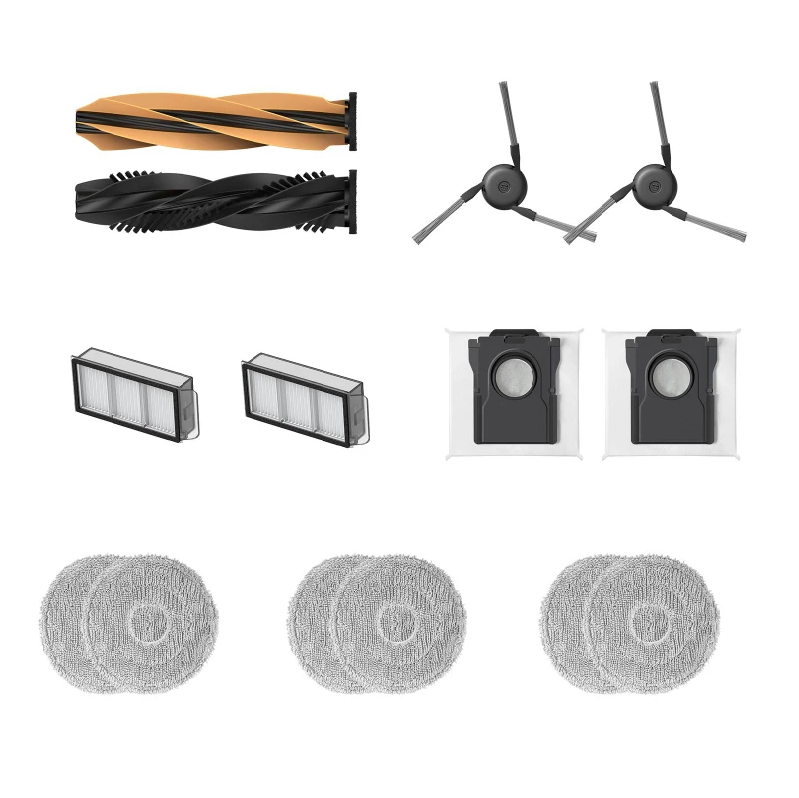 Робот-пылесос, станция самоочистки, руководство пользователя, руководство по эксплуатации, дополнительный комплект аксессуаров. (В дополнительный комплект входит: основная щётка - 1 шт, боковая щётка - 2 шт., фильтр - 3 шт., мешок для мусора - 3 шт., тканевые салфетки - 12 шт., моющее средство - 1 шт.)