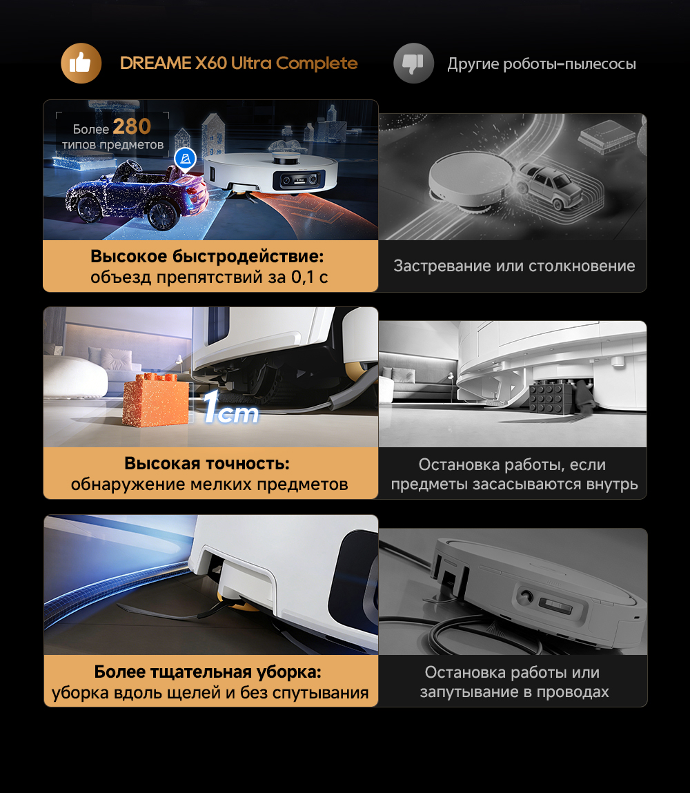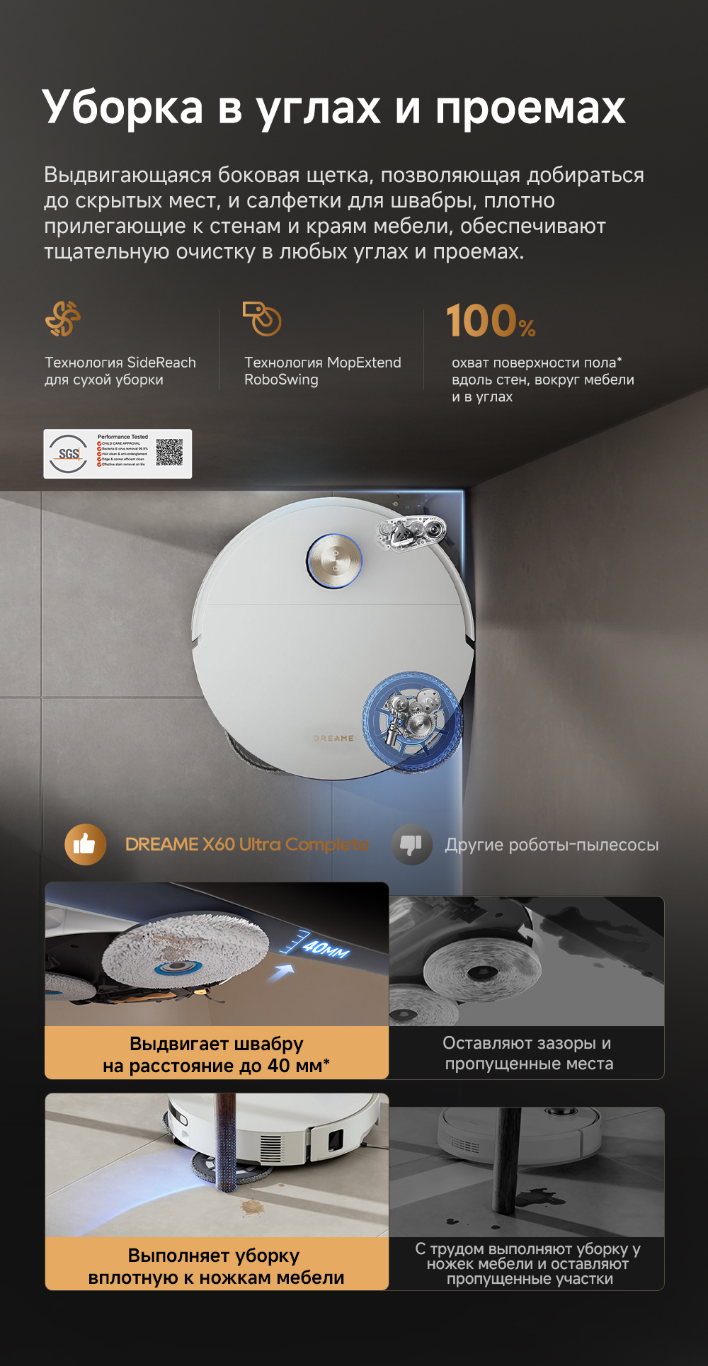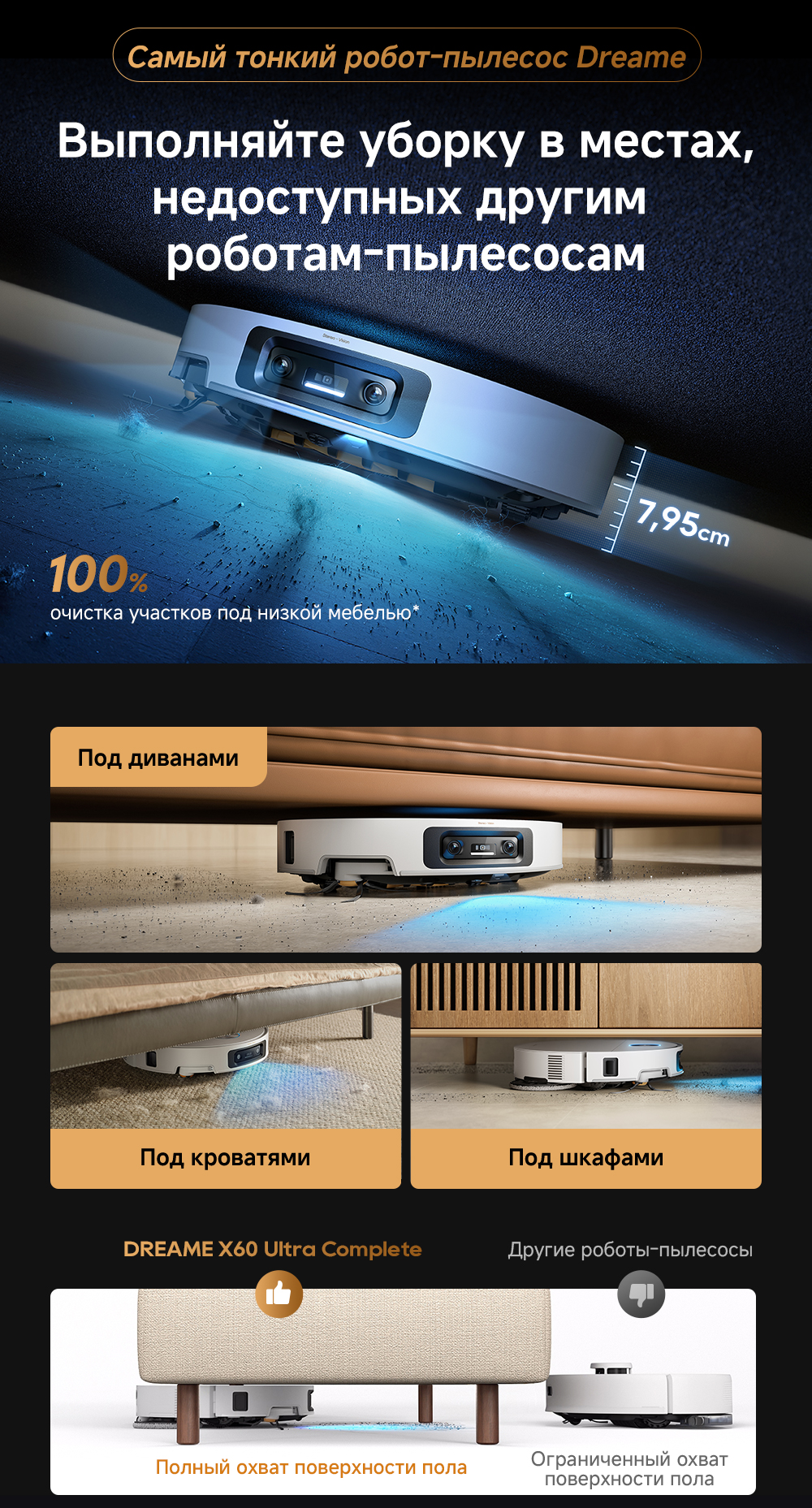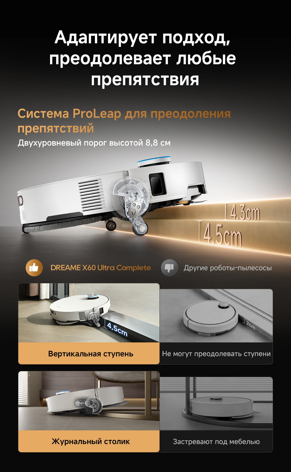 Ультратонкий корпус высотой 7,95 см для эффективной уборки под низкой мебелью. Система обнаружения загрязнений нового поколения с активной подсветкой для обнаружения, адаптации и тщательной уборки. Бинокулярная система зрения, точность уборки до миллиметра, распознаёт более 280 типов предметов. Новые возможности преодоления высоких препятствий, робот-пылесос Dreame X60 Ultra Complete способен преодолевать препятствия высотой до 8,8 см. Поддержка мощности всасывания 35 кПа для очистки ковров благодаря улучшенной герметичности. Автоматическая очистка швабр при температуре 100 °C.