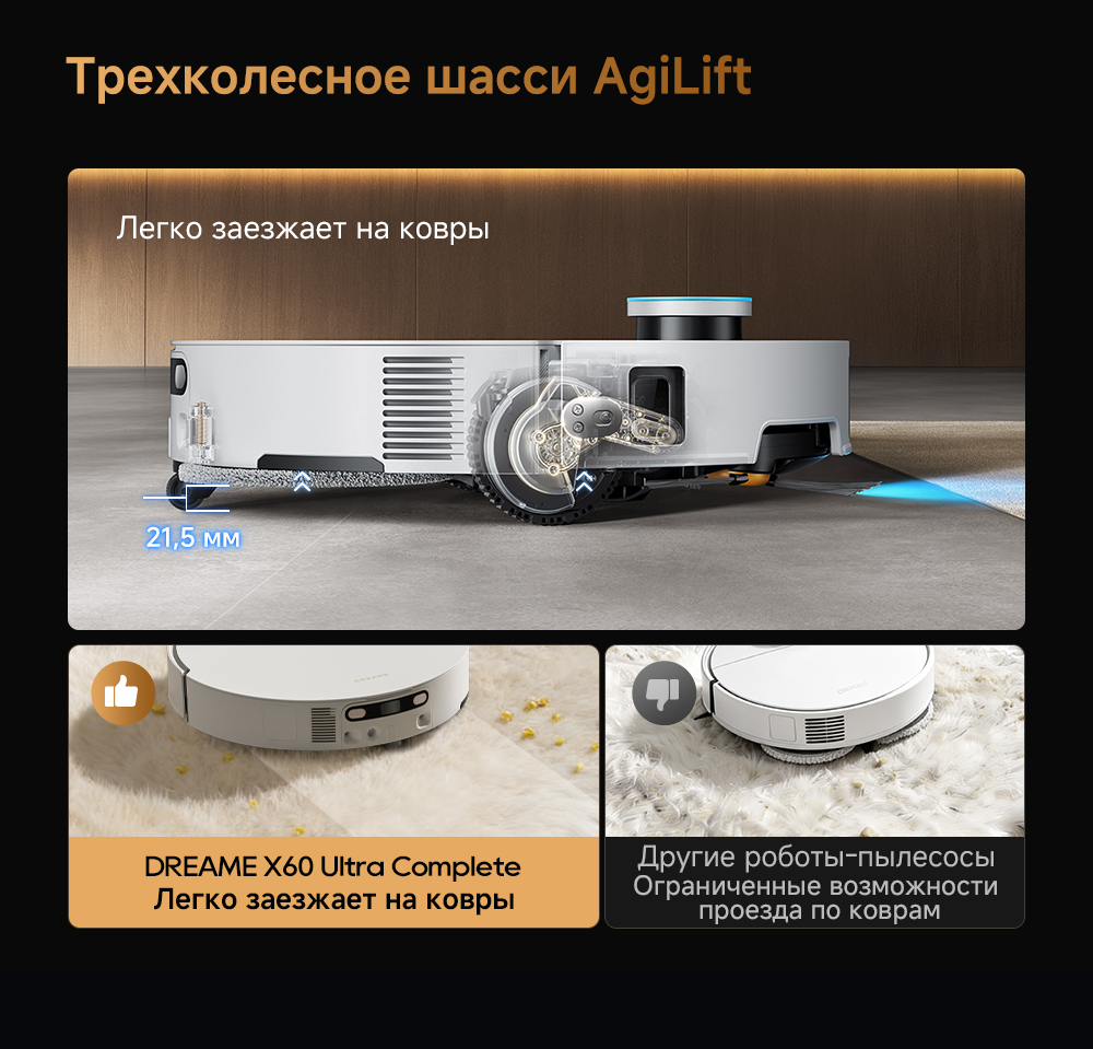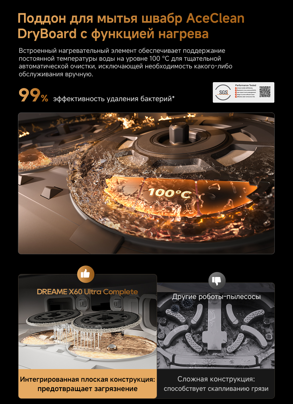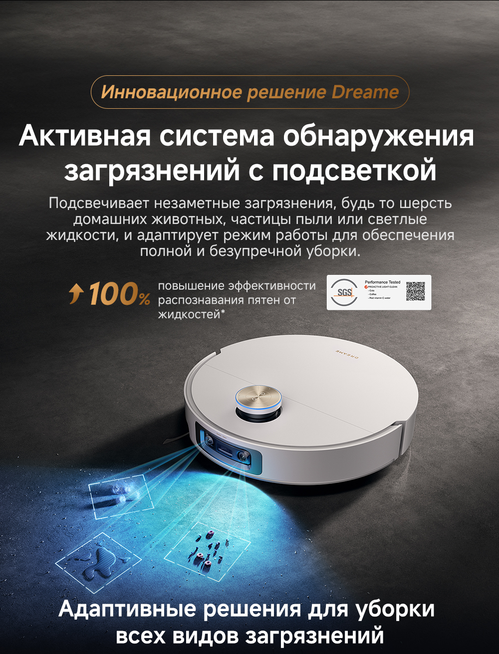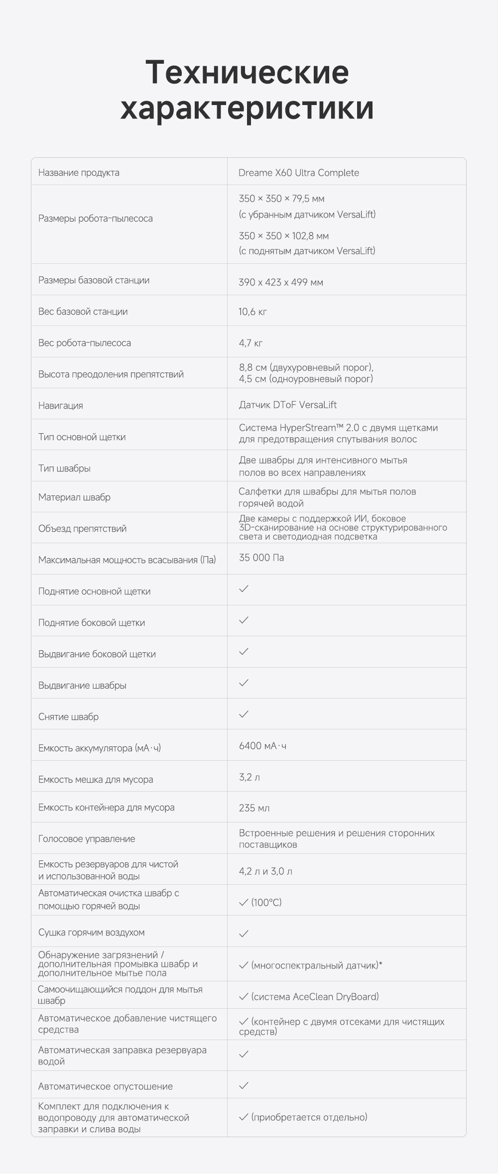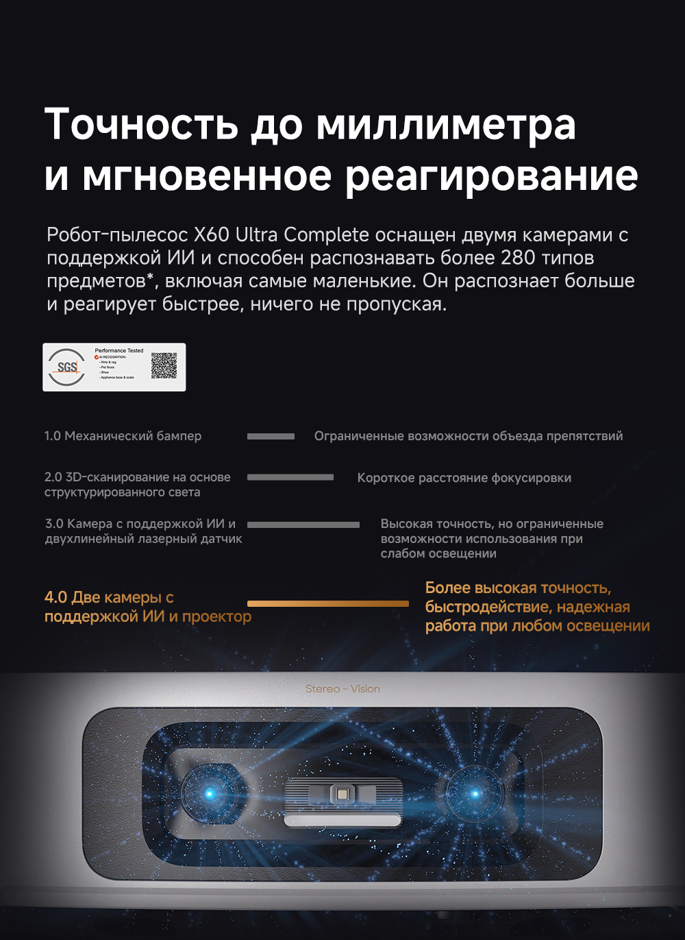 Ультратонкий корпус высотой 7,95 см для эффективной уборки под низкой мебелью. Система обнаружения загрязнений нового поколения с активной подсветкой для обнаружения, адаптации и тщательной уборки. Бинокулярная система зрения, точность уборки до миллиметра, распознаёт более 280 типов предметов. Новые возможности преодоления высоких препятствий, робот-пылесос Dreame X60 Ultra Complete способен преодолевать препятствия высотой до 8,8 см. Поддержка мощности всасывания 35 кПа для очистки ковров благодаря улучшенной герметичности. Автоматическая очистка швабр при температуре 100 °C.