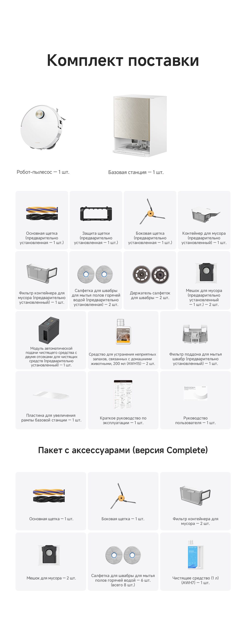 Основной комплект: Робот-пылесос 1 шт, базовая станция 1 шт, основная щётка (предварительно установленная) 1 шт, защита щётки (предварительно установленная) 1 шт, боковая щётка(предварительно установленная) 1 шт, контейнер для мусора(предварительно установленный) 1 шт, фильтр контейнера для мусора(предварительно установленный) 1 шт, салфетка для швабры для мытья полов горячей водой(предварительно установленная) 2 шт, держатель салфеток для швабры 2 шт, мешок для мусора 2 шт, модуль автоматической подачи чистящего средства с двумя отсеками для чистящих средств(предварительно установленный) 1 шт, средство для устранения неприятных запахов, связанных с домашними животными 200 мл(AWH15) 2 шт, фильтр поддона для мытья швабр (предварительно установленный) 1 шт, Пластина для увеличения рампы базовой станции 1 шт, краткое руководство по эксплуатации 1 шт, руководство пользователя 1 шт. Дополнительный комплект: Основная щётка 1 шт, боковая щётка 1 шт, фильтр контейнера для мусора 2 шт, мешок для мусора 2 шт, салфетка для швабры для мытья полов горячей водой 6 шт, чистящее средство 1 л(AWH7) 1 шт.