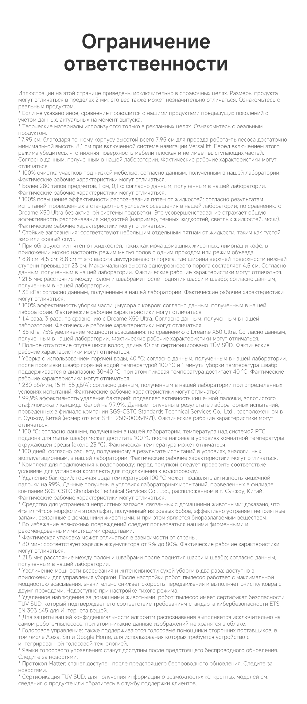 АртикулRLX87DEТипРобот-пылесосСвязанные элементы по цветуВзаимодействие с приложениямиDreamehomeИнтеграция с умным домомДаУправлениеCо смартфона / Кнопочное / Через приложениеЁмкость аккумулятора6400 мАчЦветбелыйОсобенностиУльтратонкий корпус высотой 7,95 см для эффективной уборки под низкой мебелью. Система обнаружения загрязнений нового поколения с активной подсветкой для обнаружения, адаптации и тщательной уборки. Бинокулярная система зрения, точность уборки до миллиметра, распознаёт более 280 типов предметов. Новые возможности преодоления высоких препятствий, робот-пылесос Dreame X60 Ultra Complete способен преодолевать препятствия высотой до 8,8 см. Поддержка мощности всасывания 35 кПа для очистки ковров благодаря улучшенной герметичности. Автоматическая очистка швабр при температуре 100 °C.СерияX - серияТип уборкиВлажная / СухаяГолосовой помощникЕстьМаксимальная мощность всасывания, кПа35Поддержка Wi-FiЕстьУправление с помощью смартфонаЕстьСистема фильтрацииHEPA-фильтрСоставление плана помещенияЕстьРежим самоочисткиЕстьФронтальная камераЕстьУборка ковровЕстьУборка шерсти животныхЕстьОбъем пылесборника, мл235Объем пылесборника док-станции, л3.2Объем контейнера для чистой воды док-станции, л4.2Тип щёткиДвойная распутывающая щетка HyperStream™Обнаружение препятствийЕстьОграничитель зоны уборкиЕстьОбъем контейнера для грязной воды док-станции, л3КомплектацияОсновной комплект: Робот-пылесос 1 шт, базовая станция 1 шт, основная щётка (предварительно установленная) 1 шт, защита щётки (предварительно установленная) 1 шт, боковая щётка(предварительно установленная) 1 шт, контейнер для мусора(предварительно установленный) 1 шт, фильтр контейнера для мусора(предварительно установленный) 1 шт, салфетка для швабры для мытья полов горячей водой(предварительно установленная) 2 шт, держатель салфеток для швабры 2 шт, мешок для мусора 2 шт, модуль автоматической подачи чистящего средства с двумя отсеками для чистящих средств(предварительно установленный) 1 шт, средство для устранения неприятных запахов, связанных с домашними животными 200 мл(AWH15) 2 шт, фильтр поддона для мытья швабр (предварительно установленный) 1 шт, Пластина для увеличения рампы базовой станции 1 шт, краткое руководство по эксплуатации 1 шт, руководство пользователя 1 шт. Дополнительный комплект: Основная щётка 1 шт, боковая щётка 1 шт, фильтр контейнера для мусора 2 шт, мешок для мусора 2 шт, салфетка для швабры для мытья полов горячей водой 6 шт, чистящее средство 1 л(AWH7) 1 шт.Кнопкивкл/выкл / кнопка "Домой"ДвигательБесщёточныйПодсказкиЕстьМодельX60 Ultra Complete WhiteВлажный тип уборкиДаМинимальная цена со скидкой4999Краткое наименованиеX60 Ultra CompleteНавигационная системаVersaLift (опускающийся LiDar): LDS AI + 3DГабаритыРобот-пылесос: 35 × 35 × 7,95 см (с убранным датчиком VersaLift). Базовая станция: 39 x 42,3 x 49,9 см.ВесРобот-пылесос: 4.7 кг. Базовая станция: 10.6 кг.ИзготовительDreame Trading (Tianjin) Co. Ltd., Китай, Room 2112-1-1, South District, Finance and Trade Center, No.6975 Yazhou Road, Dongjiang Bonded Port Area, Tianjin Pilot Free Trade Zone, TianjinИмпортерООО "АйТи Дистрибуция", 223053, Республика Беларусь, Минская область, Минский район, Боровлянский с/с, 103/3-7, помещение №7-50Гарантийный срок12 месяцев